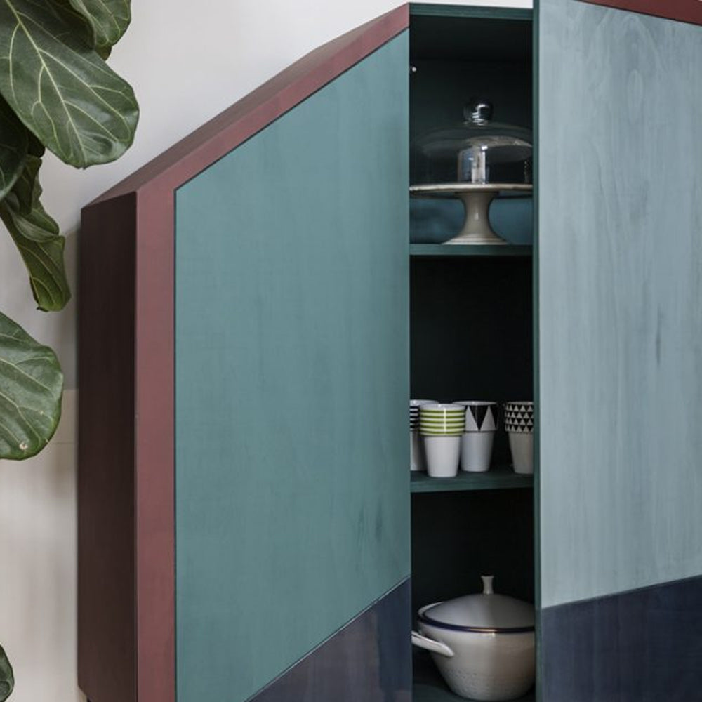 The Ritratti Cabinet is made of MDF with tulip wood veneer panels in different colours. The design of the colour panels, together with the cut corner detail, creates a clever 3D illusion which gives the cabinet a great graphic presence. The Ritratti Cabinet has two doors and four internal shelves and is available in "Blue" or "Grey" colour schemes.