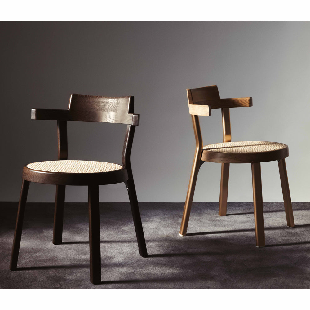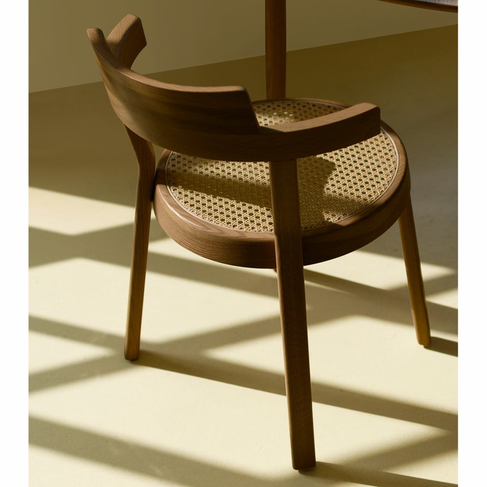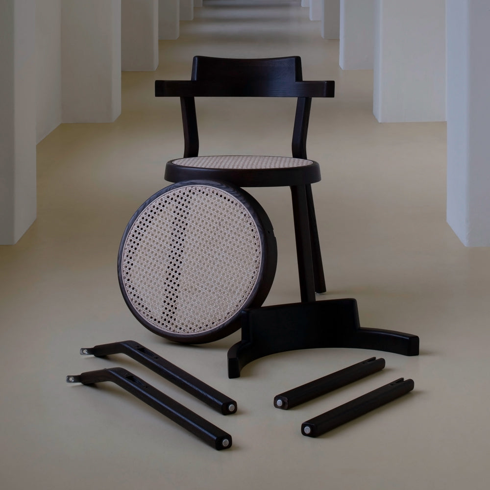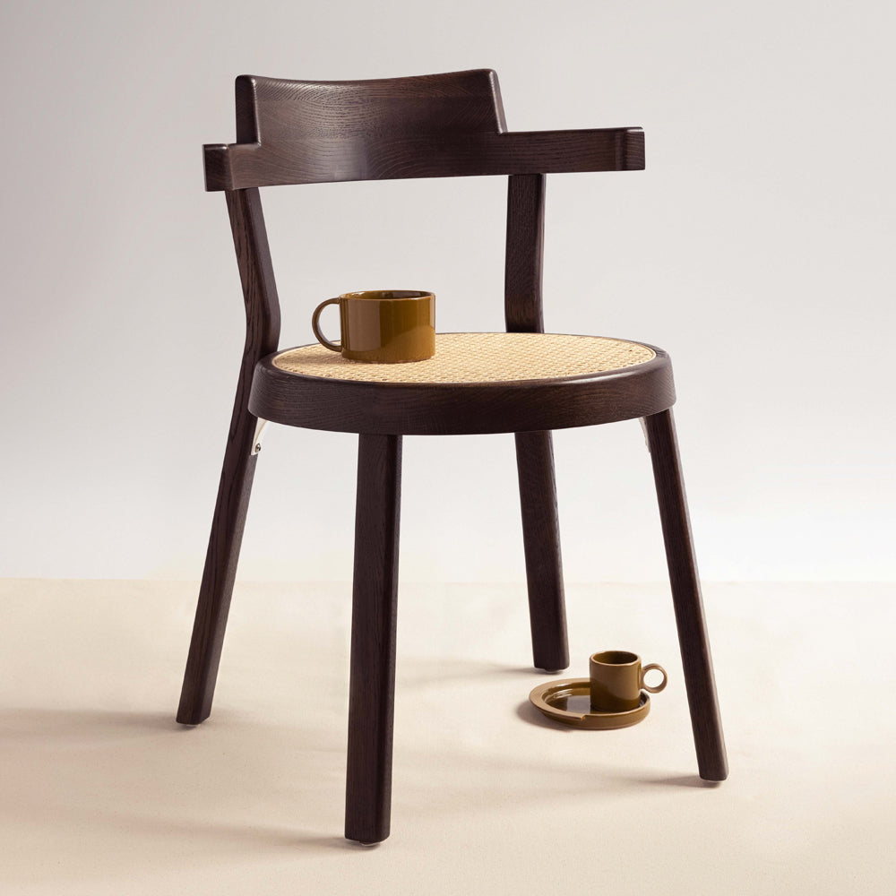 The Pagoda Chair Cane - Wood Leg is part of a collection of chairs inspired by the classic Viennese café chairs of the 19th century. The chair is supremely light and compact thanks to its structure which has been reduced to its very essence. The chair is made of only six parts – combining outstanding craftsmanship and efficiency while allowing multiple material configurations. The chair’s round seat stems from rationalisation while symbolising the “Way of Nature” or “oneness” of Chinese culture. Its two cantilevered arms and its back are a subtile reference to the Pagoda gates: they provide the chair with its own personality while also eliminating the need for an arm and armless version.