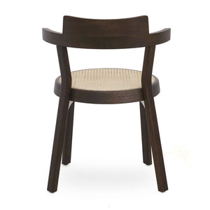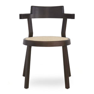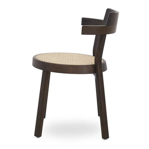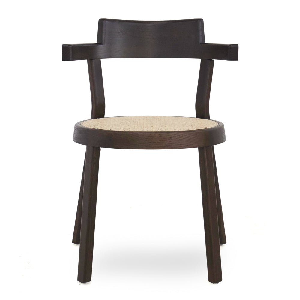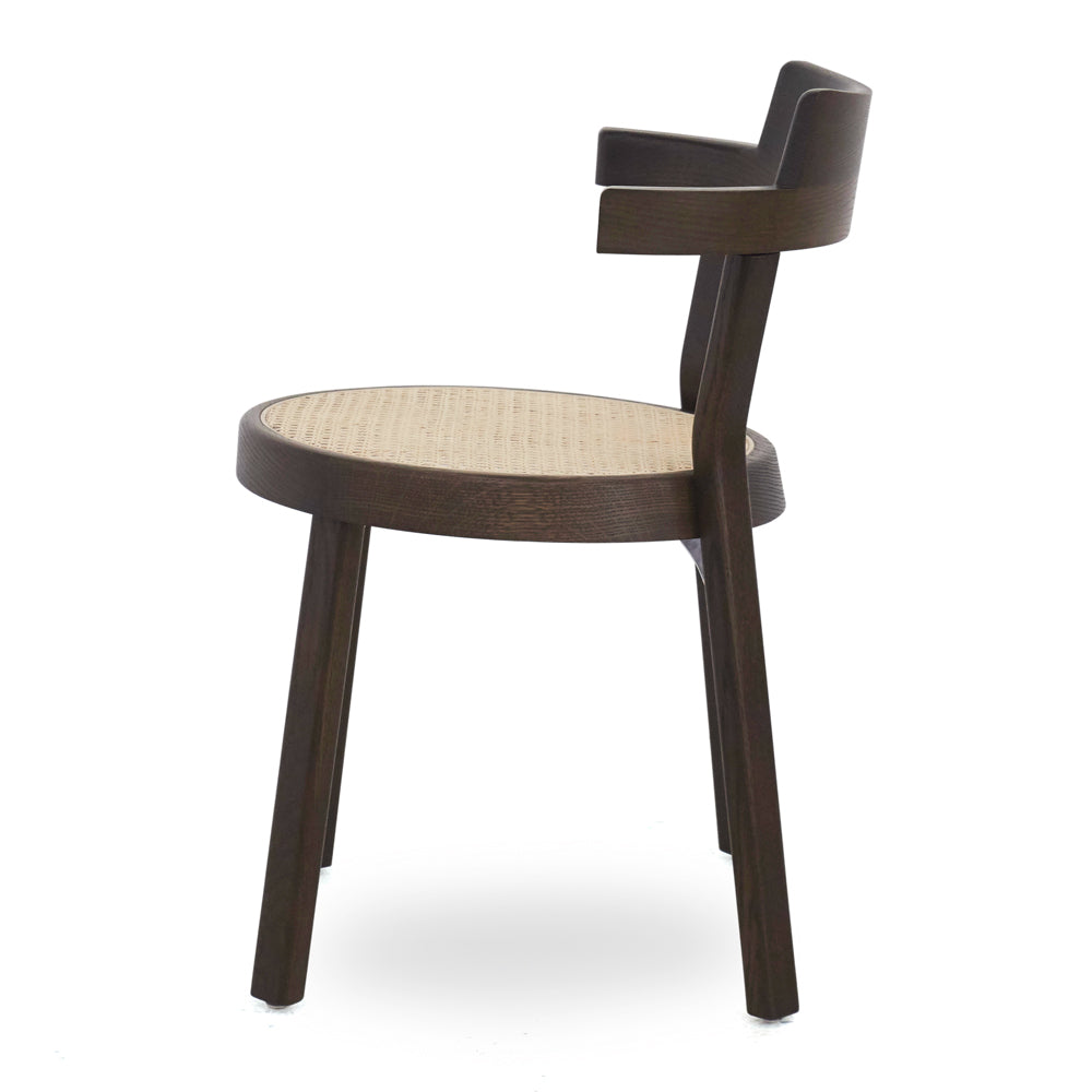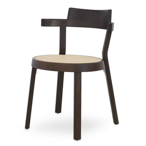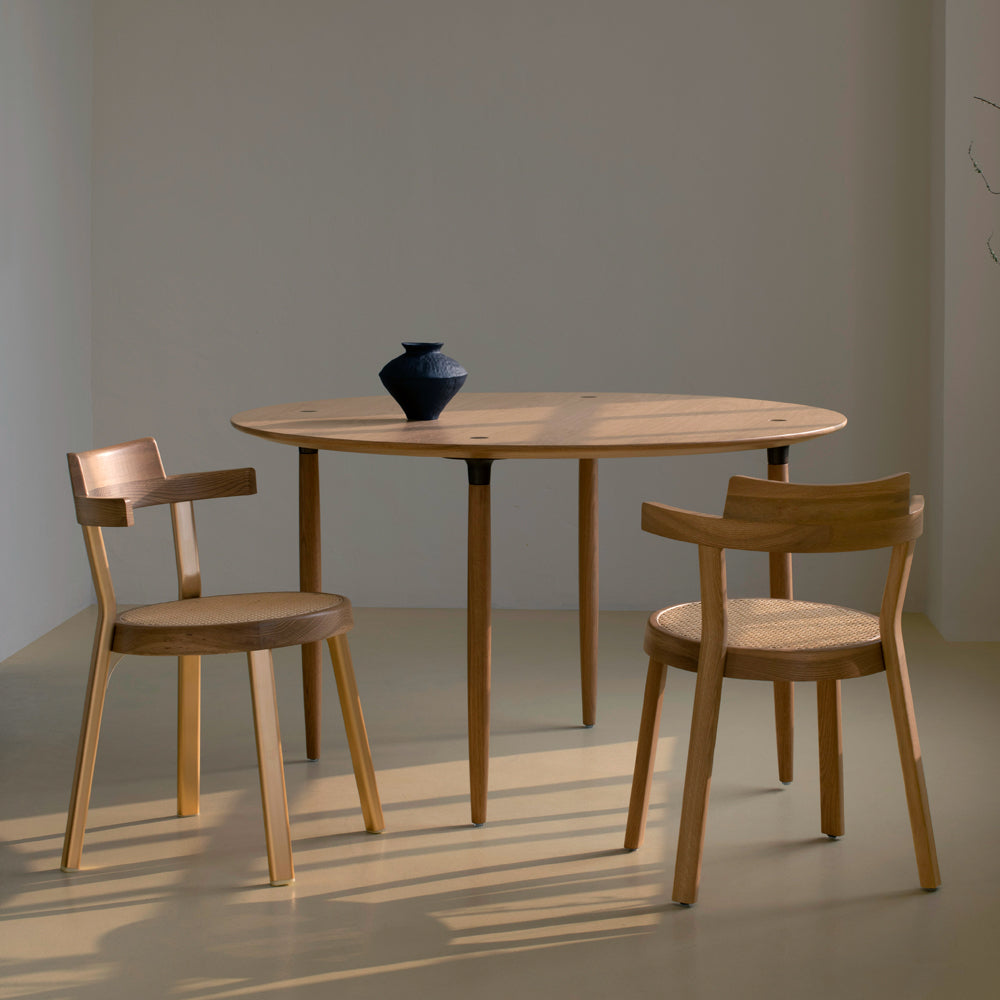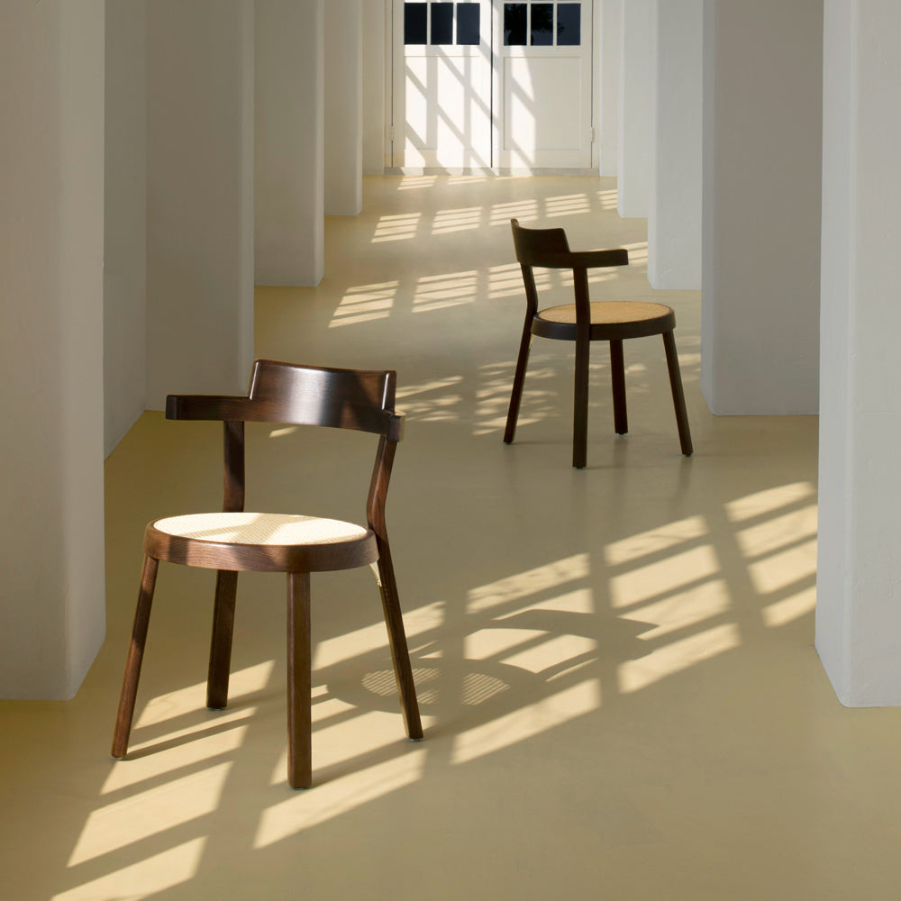 The Pagoda Chair Cane - Wood Leg is part of a collection of chairs inspired by the classic Viennese café chairs of the 19th century. The chair is supremely light and compact thanks to its structure which has been reduced to its very essence. The chair is made of only six parts – combining outstanding craftsmanship and efficiency while allowing multiple material configurations. The chair’s round seat stems from rationalisation while symbolising the “Way of Nature” or “oneness” of Chinese culture. Its two cantilevered arms and its back are a subtile reference to the Pagoda gates: they provide the chair with its own personality while also eliminating the need for an arm and armless version.