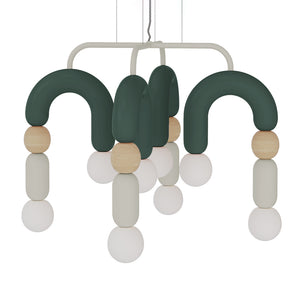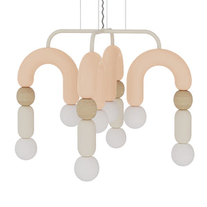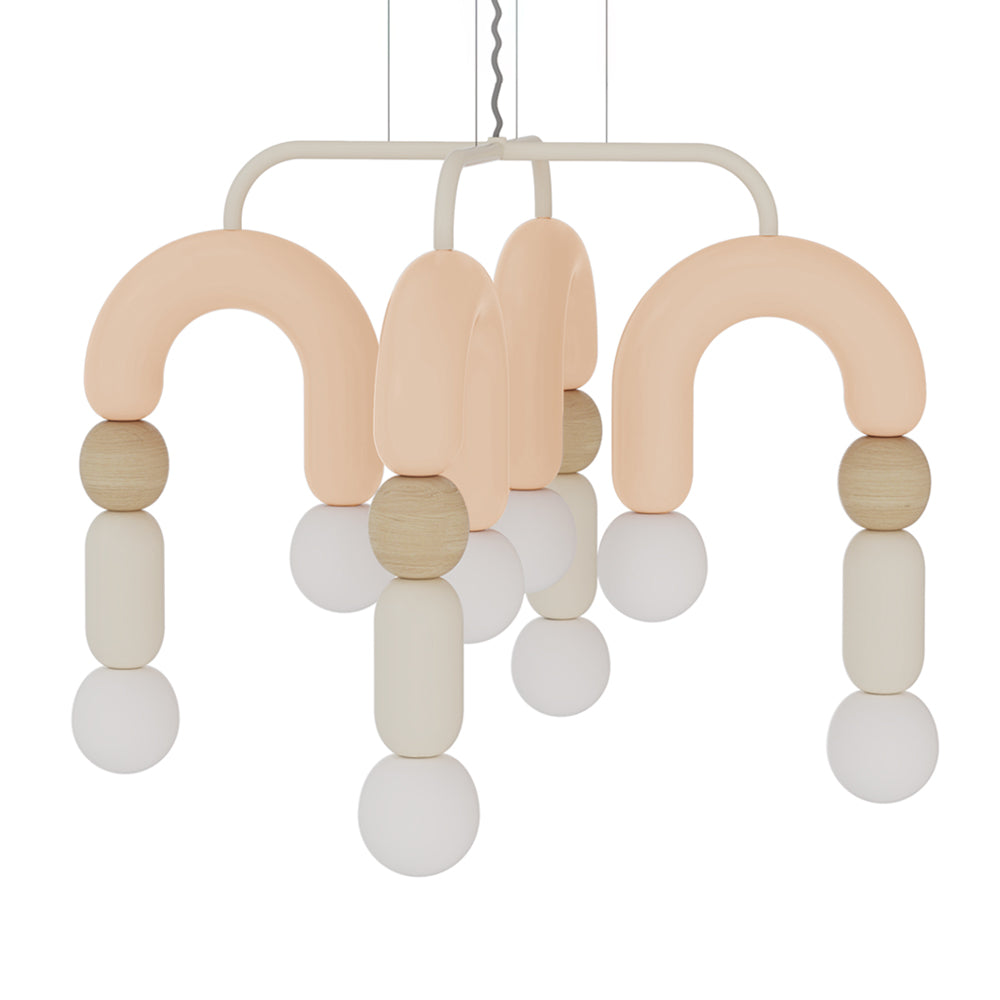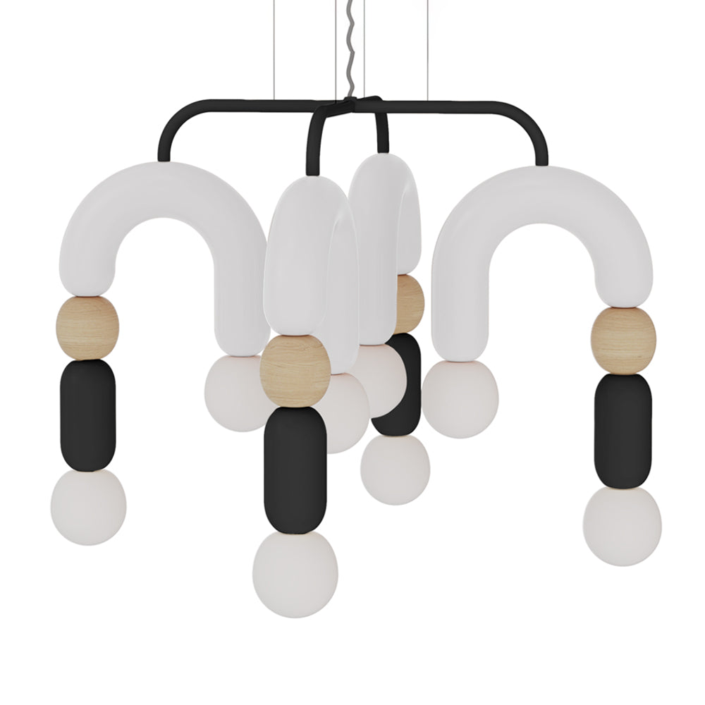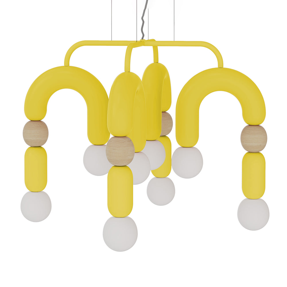 Play V - Suspension Light is a colourful, playful and sculptural suspension light featuring a metal structure with metal or wooden finishes.