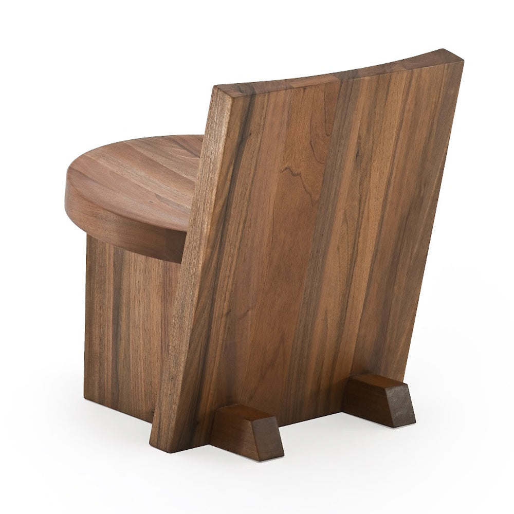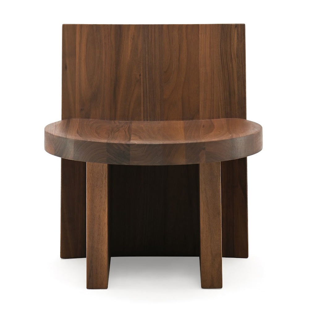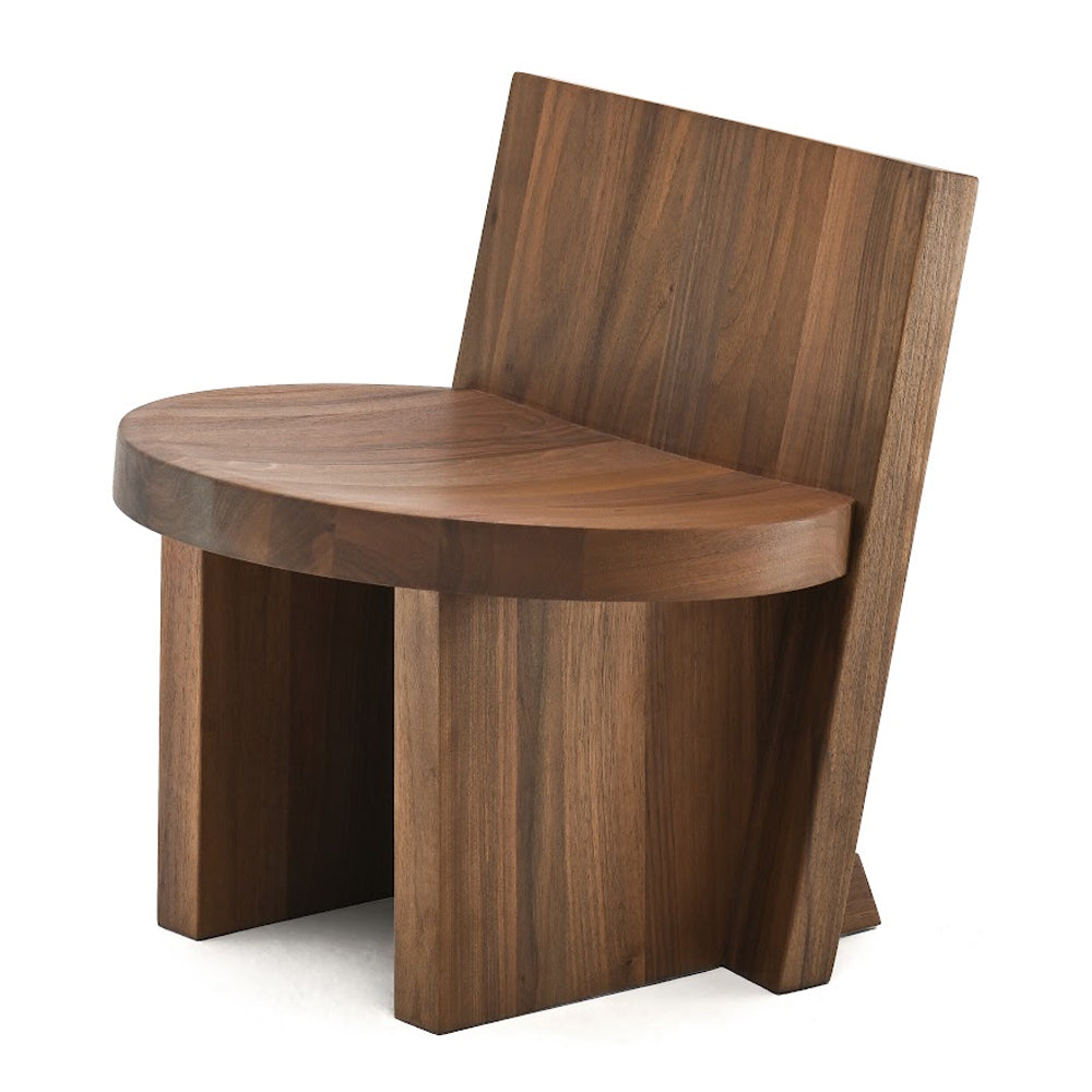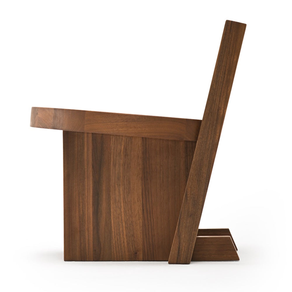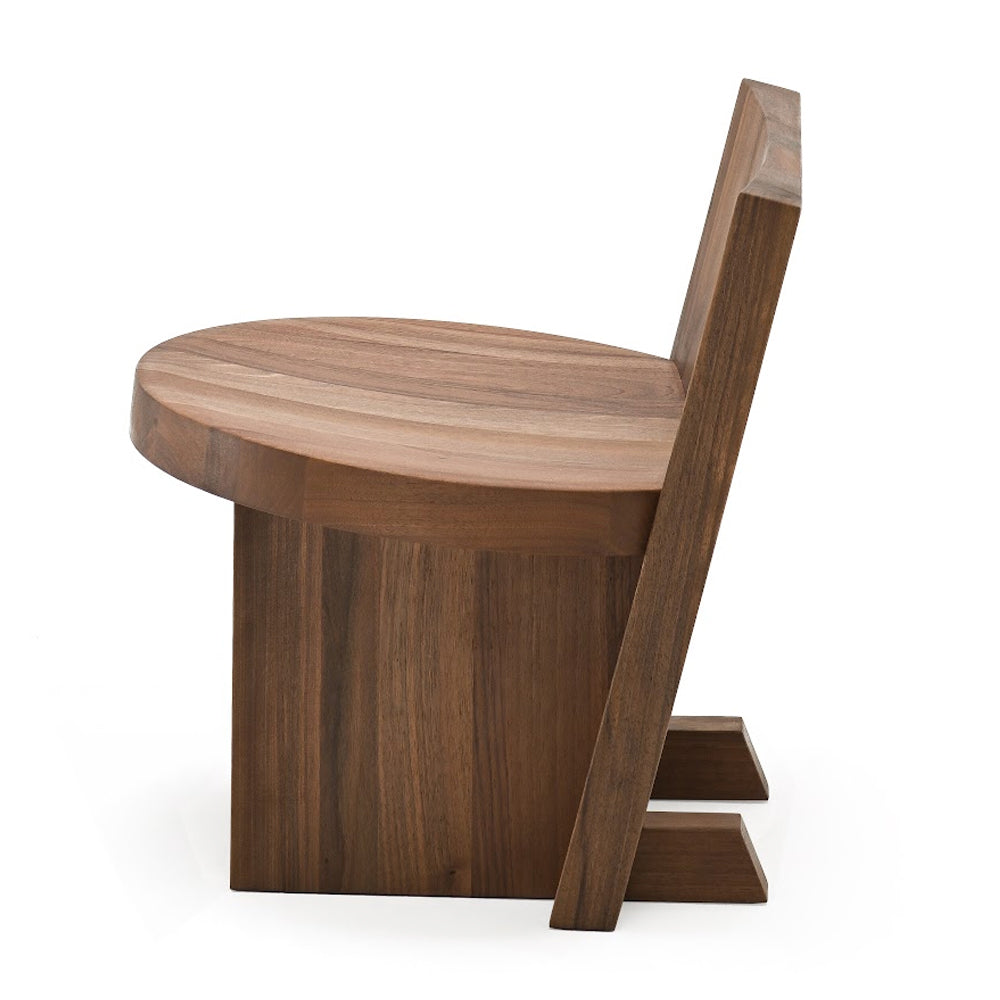 The design of the Rudi Chair emphasises the beauty of the raw material: solid oak and walnut sculpted with simple, clean lines. A familiar object with a minimalist aesthetic based on a few interlocking geometric elements – rectangular backrest and legs and round seat - joined together in meticulous yet primitive harmony. The Rudi Chair is available with either a low back or a high back.