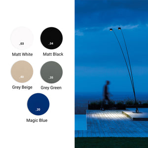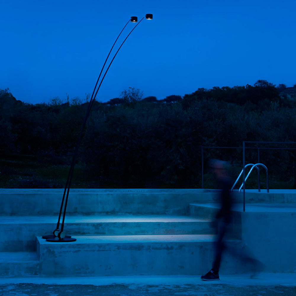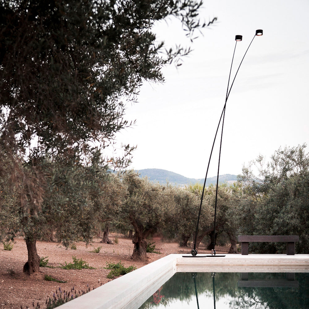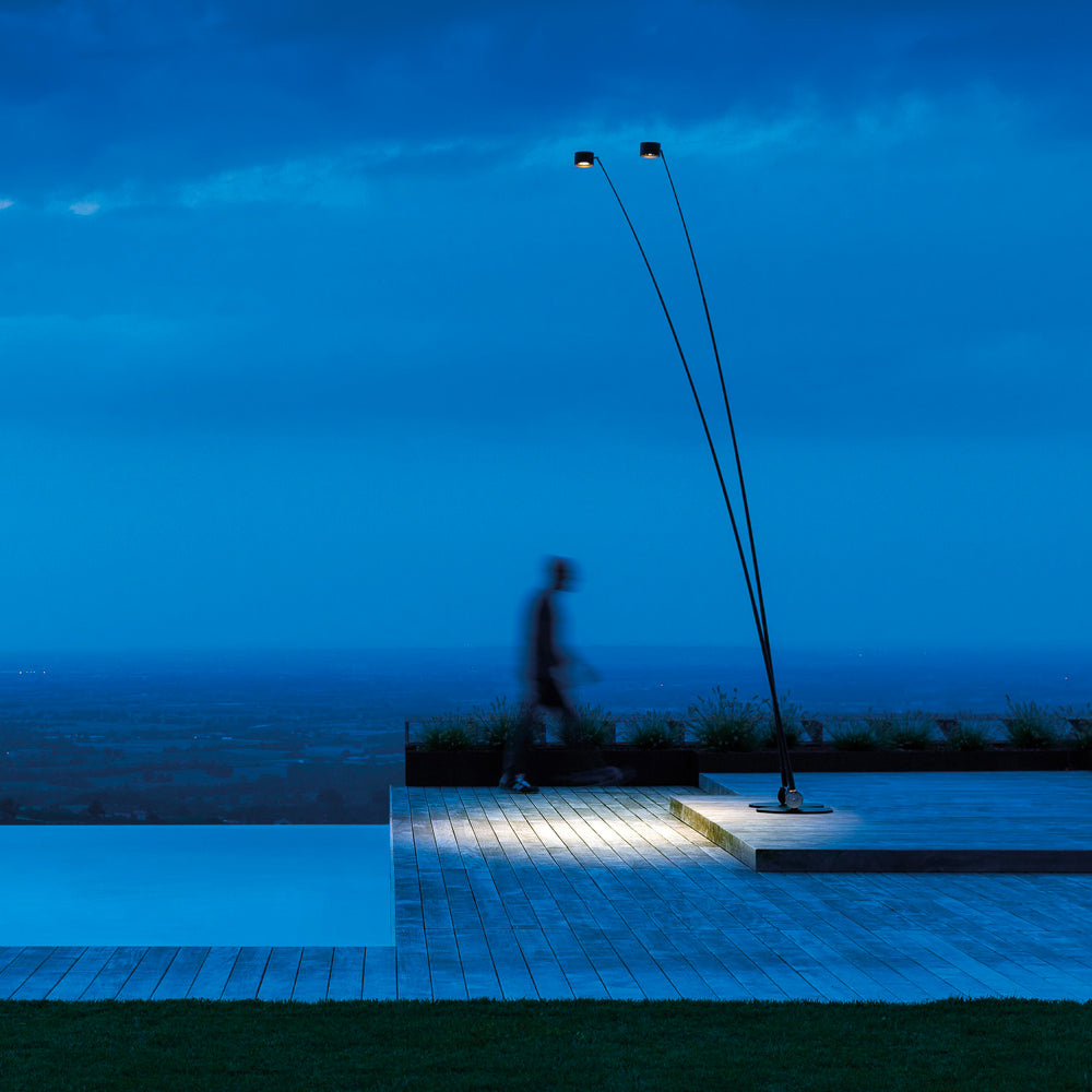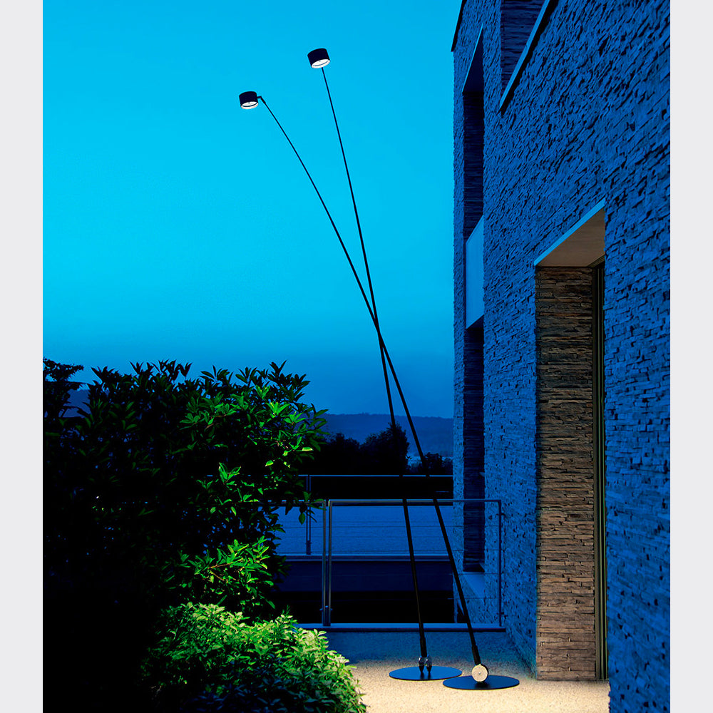 The Sampei Outdoor Floor Light is a stylish, sleek and highly effective floor light. Inspired by fishing rods, the slender telescopic stem of the light extends to over 3 metres high, working as a hybrid between a floor light and a suspension light. The arm tapers to a fine point at the top with a sleek lighting element creating a graceful arc. The Sampei Outdoor Floor Light is available in two colours (black and white) and in two colour temperatures (3000K and 2700K).