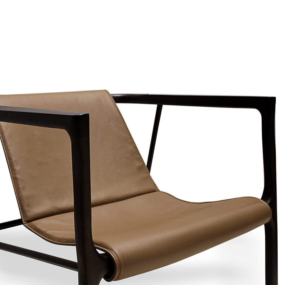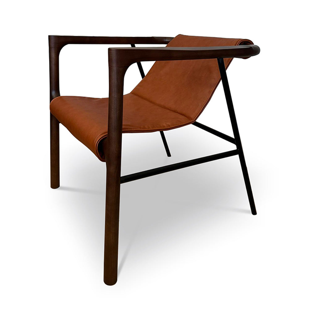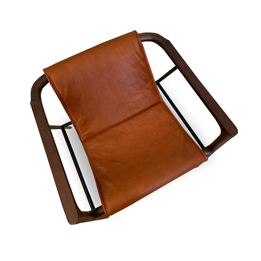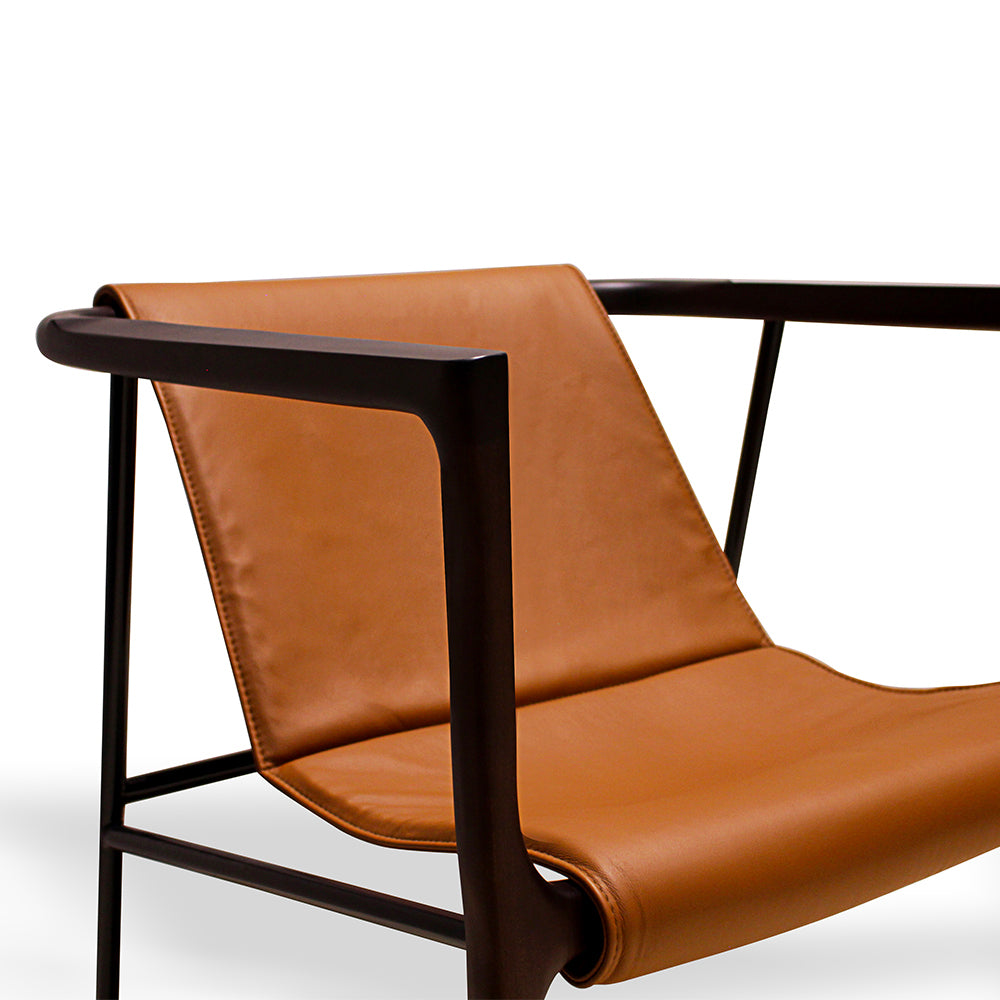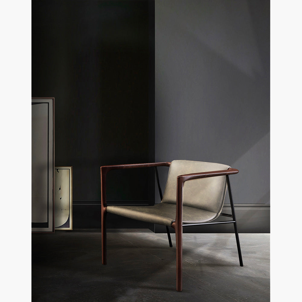 The Elliot Armchair is an elegant armchair with a design featuring a sleek leather seat supported by a metal frame with curved solid wood armrests. The bold shape and combination of materials impart a great deal of character to the chair. Alone or in pairs, covered in leather or fabric, the Elliot Armchair is the perfect complement for any sofa.