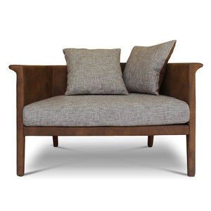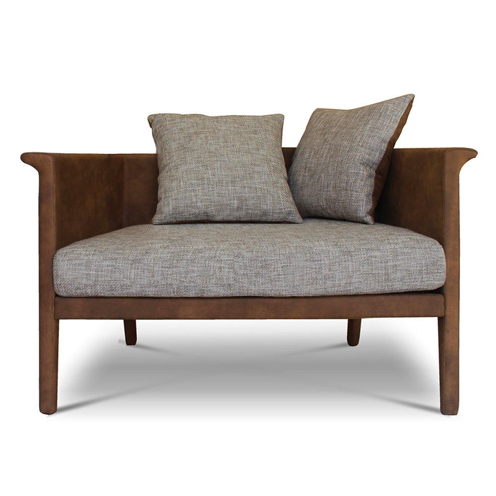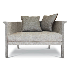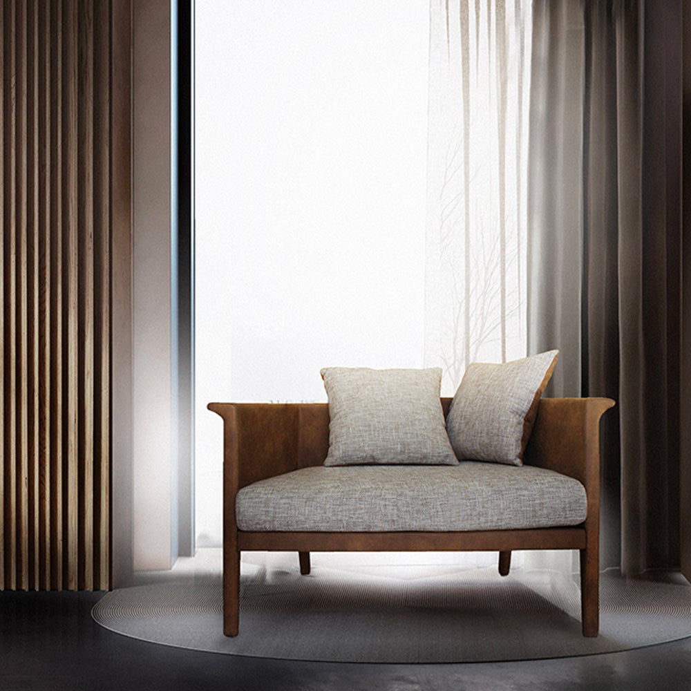 The Franz Armchair is a sleek and elegant armchair featuring a compact design: an upholstered back extends its curve to form the armrest which, together with a couple of scattered cushions, creates an inviting cocoon for reading and relaxing.