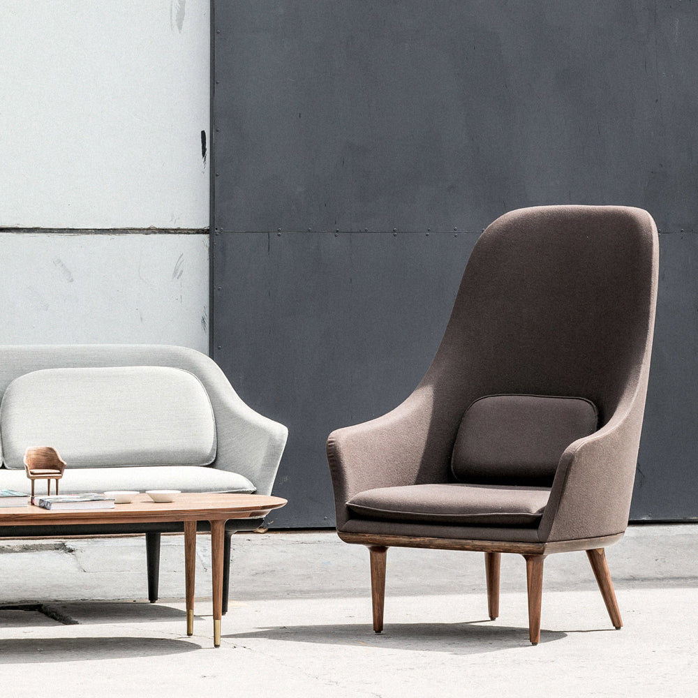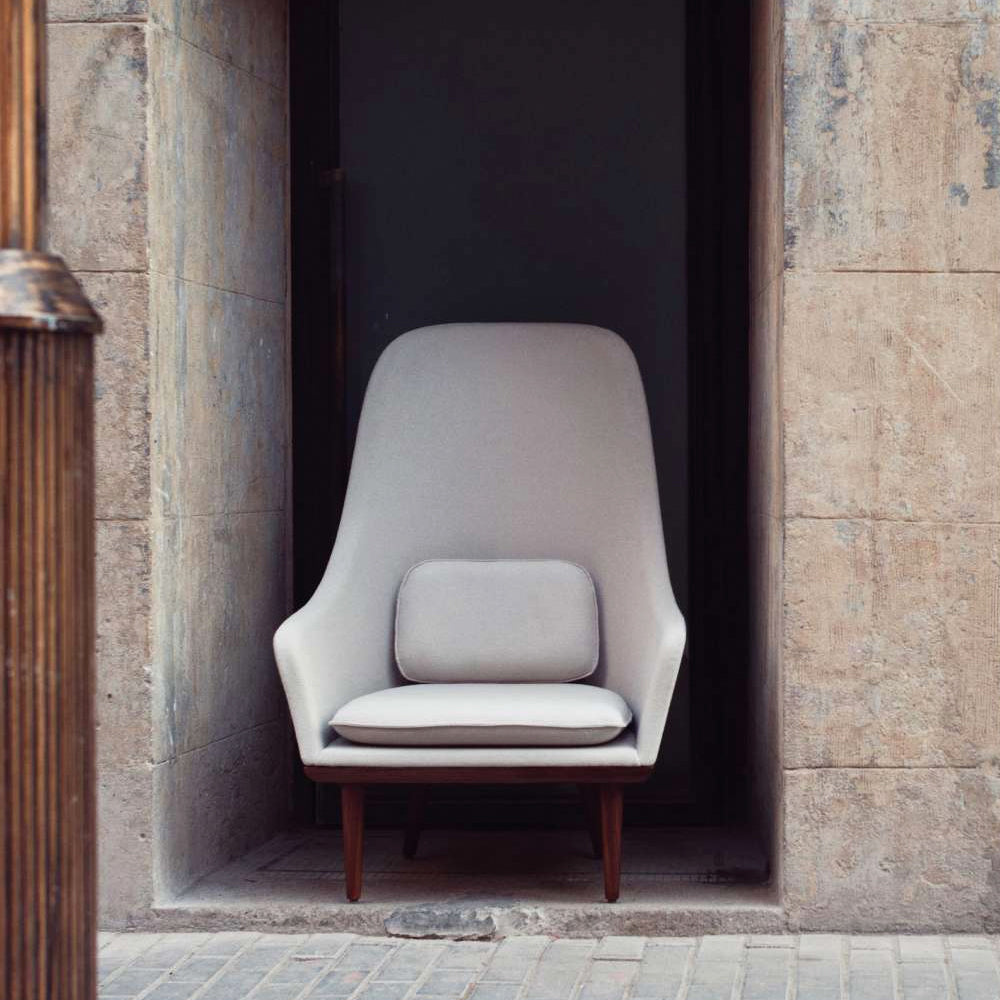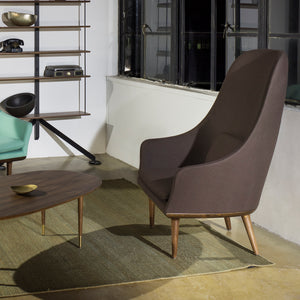 The Lunar Highback Chair is inspired by the legendary Chinese goddess of the moon: with its fully upholstered shell, the Lunar exudes feminine charm thanks to its gentle curves together with an air of studied coolness with its straight wooden legs tipped in brass finished steel. A perfect marriage of oriental inspirations with contemporary Nordic design.