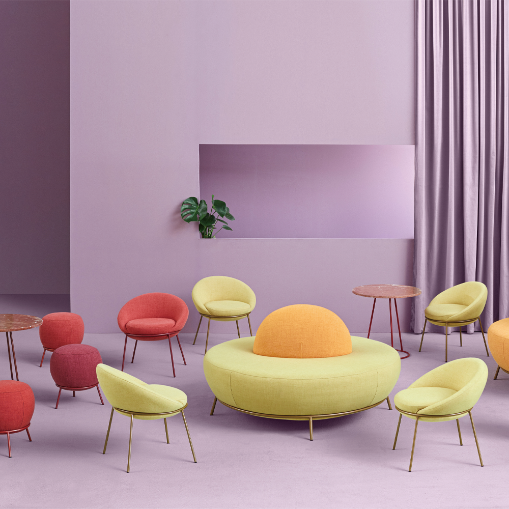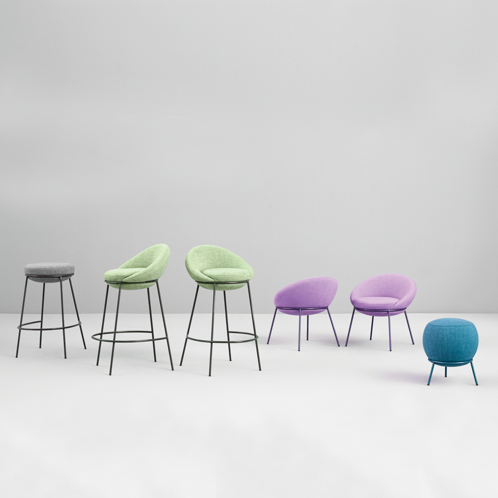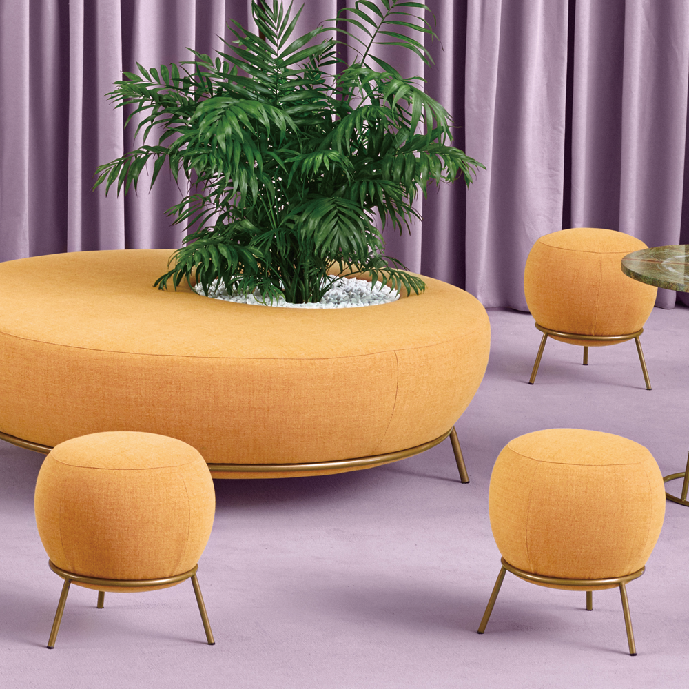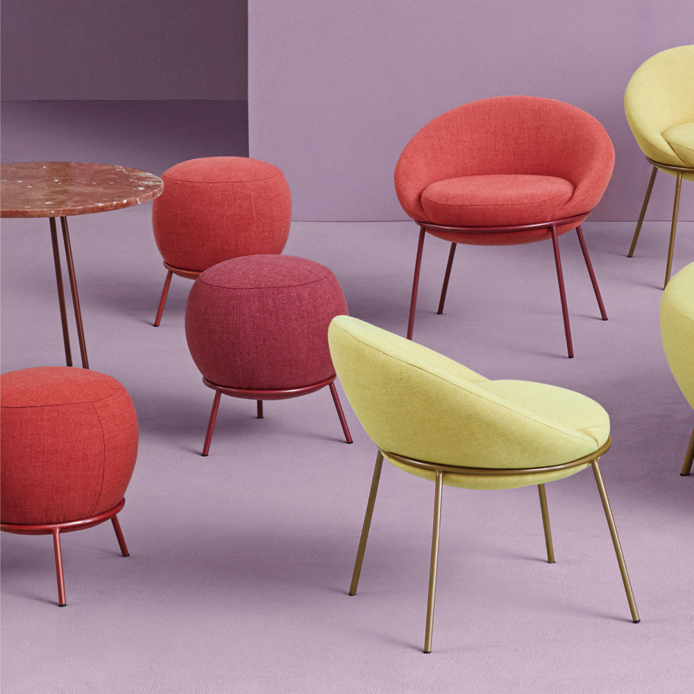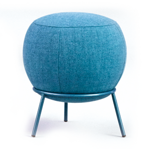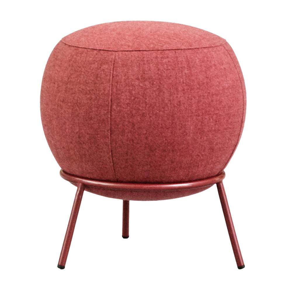The Nest Pouf is a comfortable and versatile stool. The stool takes on the form of a bulbous, upholstered block sitting on a tubular metal frame with three legs.
