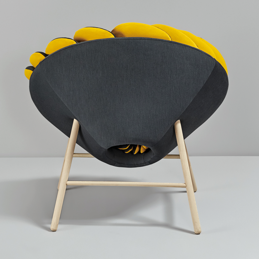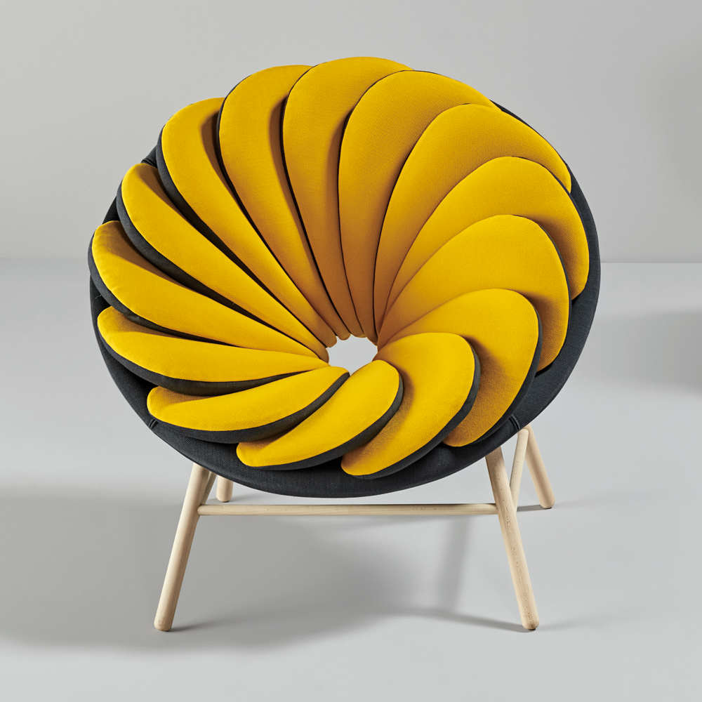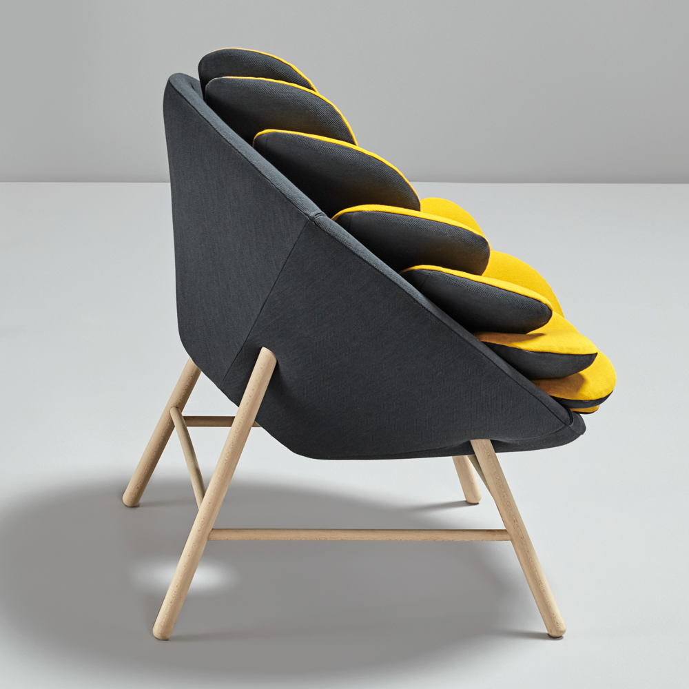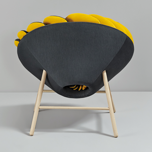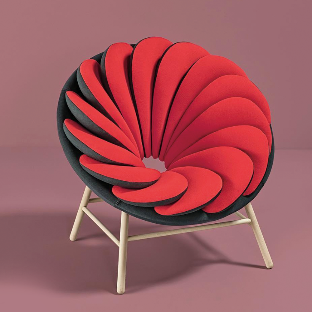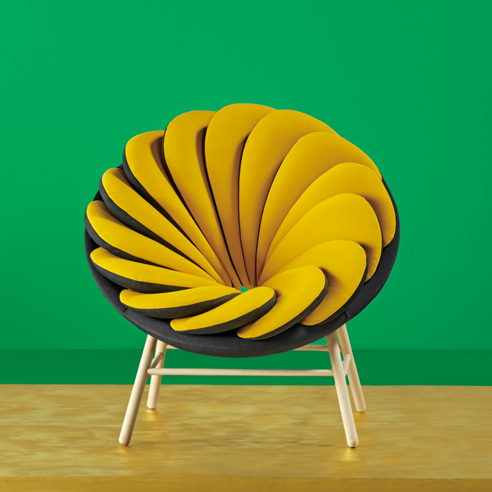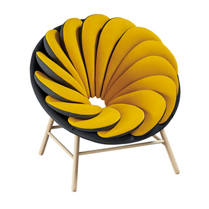 The Quetzal Armchair is a visually stunning armchair. The conical seat of the armchair is covered by 14 overlapping feather-shaped bi-colour cushions, inspired by the striking plume and bright colours of the Quetzal bird from South America. The clever design enables the colour of the armchair to be changed easily by turning the bi-colour cushions the other way round.