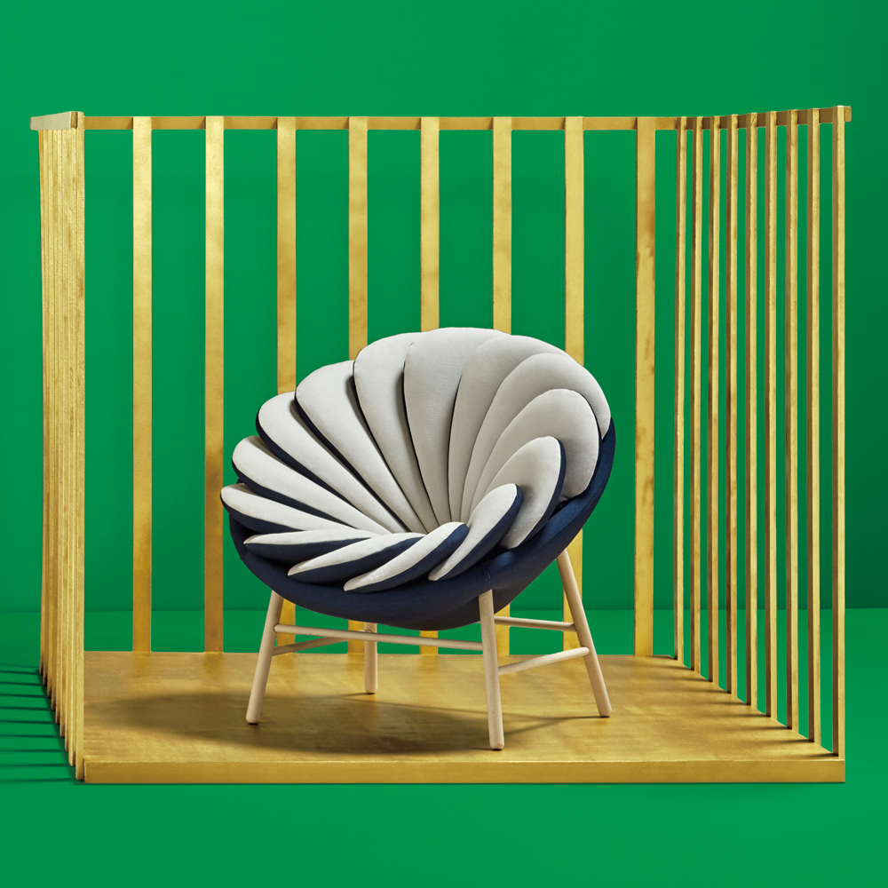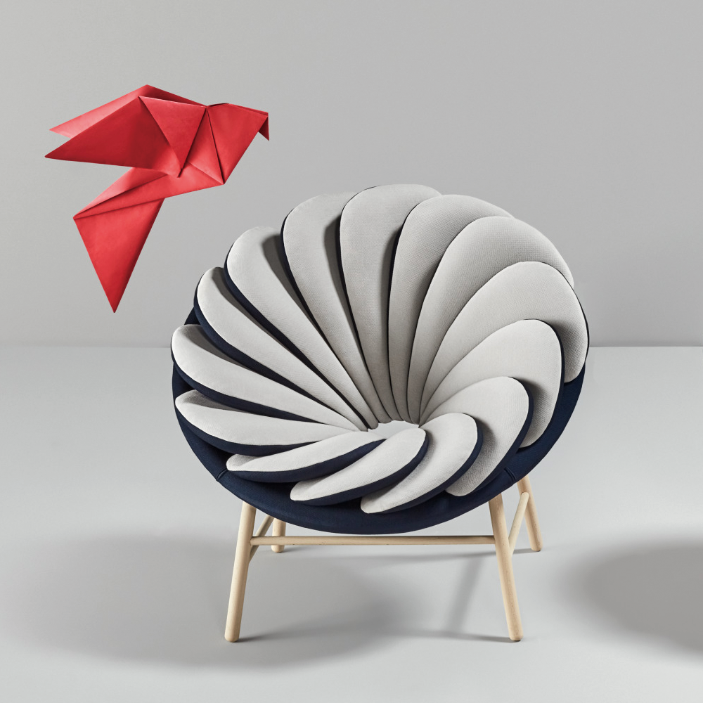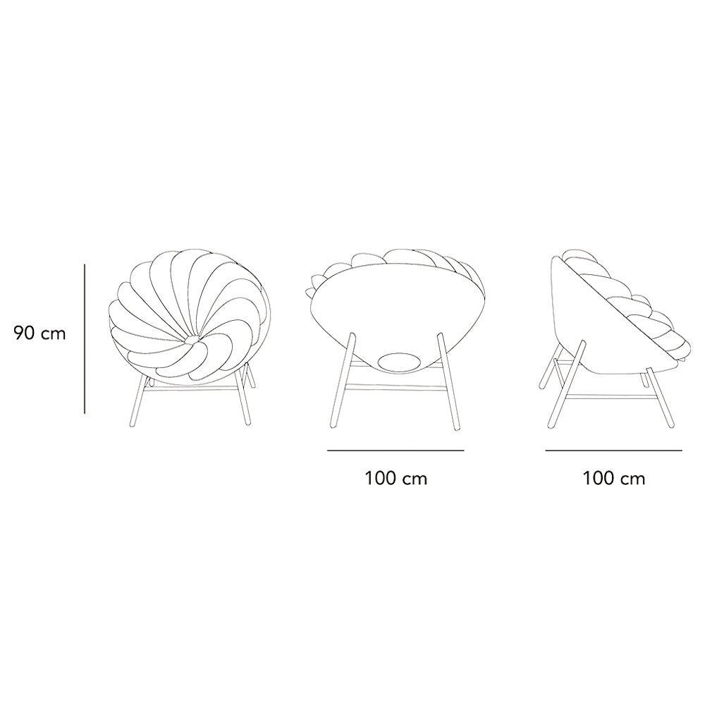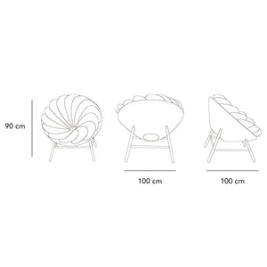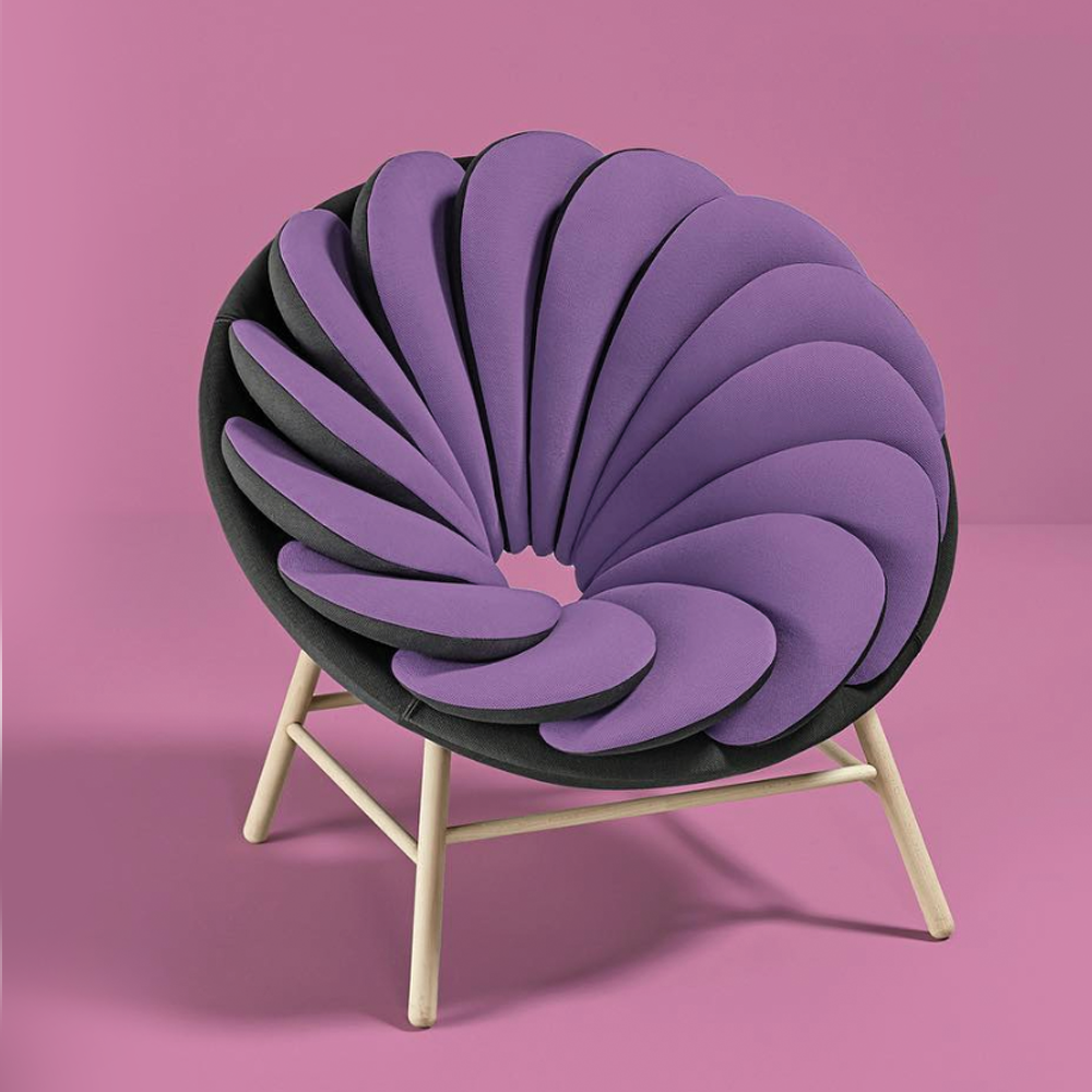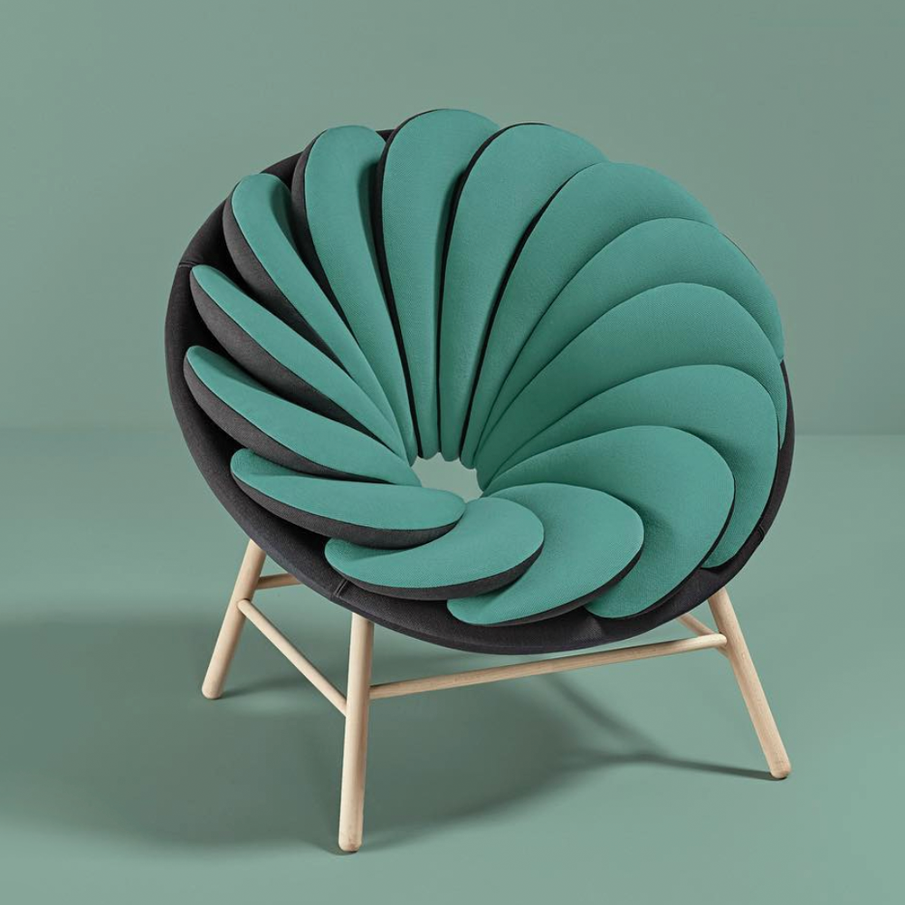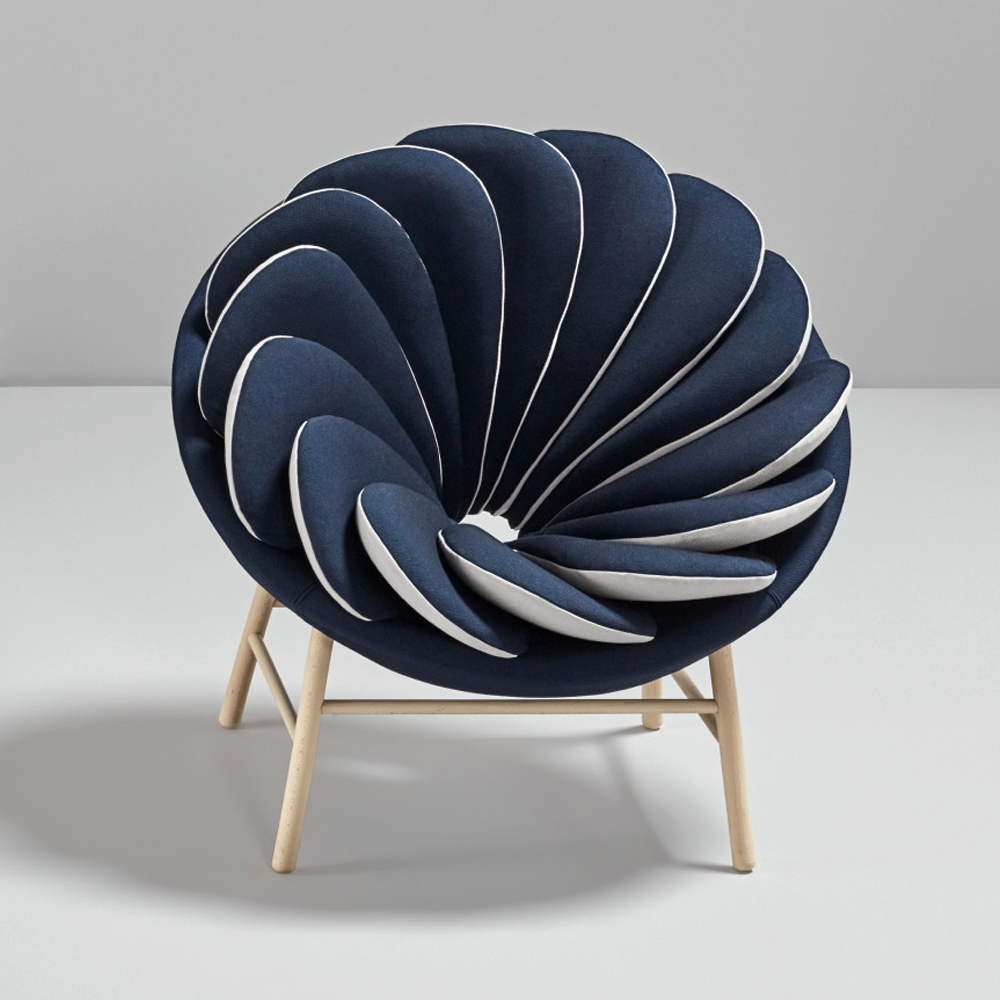 The Quetzal Armchair is a visually stunning armchair. The conical seat of the armchair is covered by 14 overlapping feather-shaped bi-colour cushions, inspired by the striking plume and bright colours of the Quetzal bird from South America. The clever design enables the colour of the armchair to be changed easily by turning the bi-colour cushions the other way round.