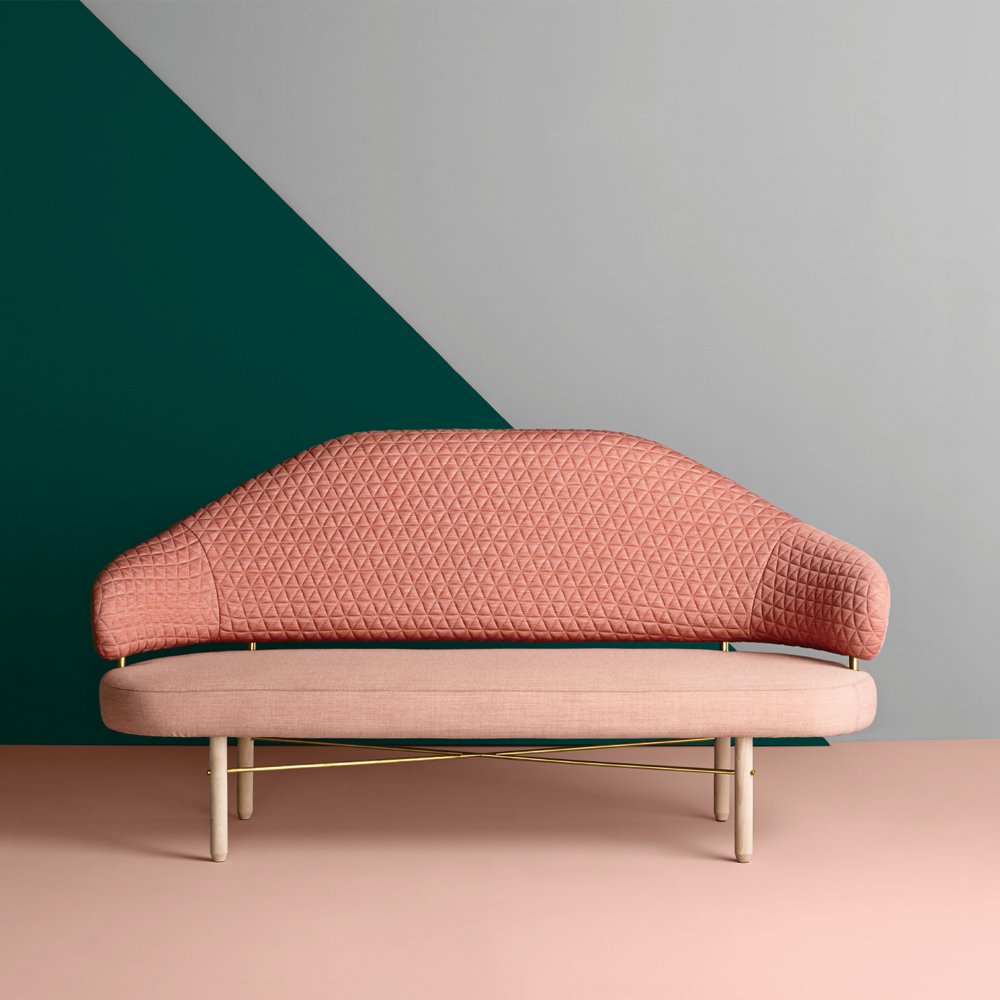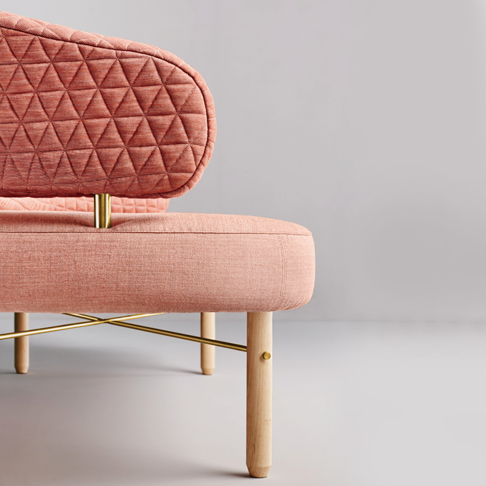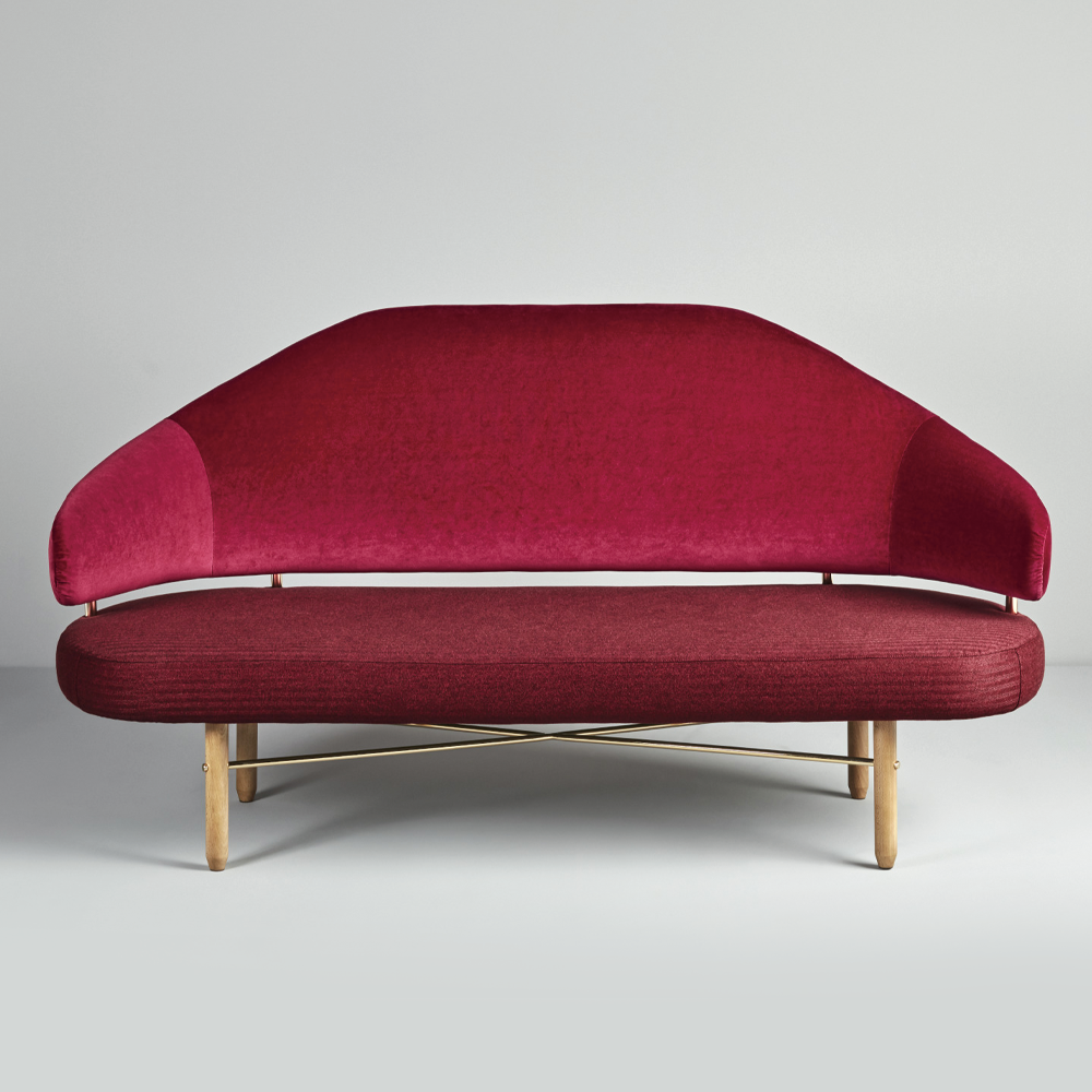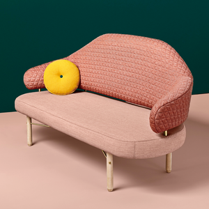 Simone is an eye-catching and compact sofa. Curvy and flirtatious, the sofa looks good from every angle, even from behind. This is a sofa which catches the attention of everyone in the room and does not want to be pushed against the wall. The back and seat of the sofa are separated by elegant gold metal tubes, a detail repeated in the legs of the sofa.