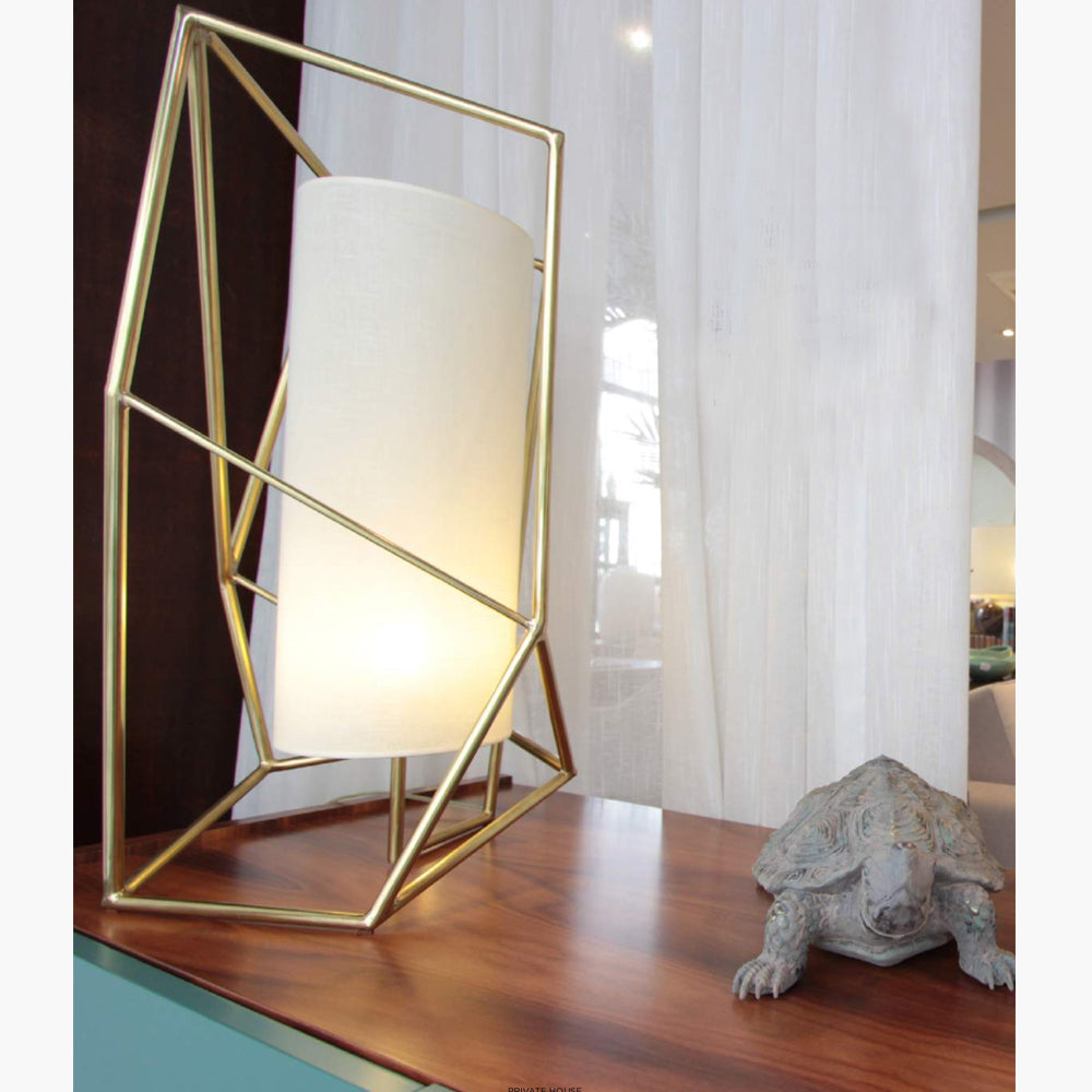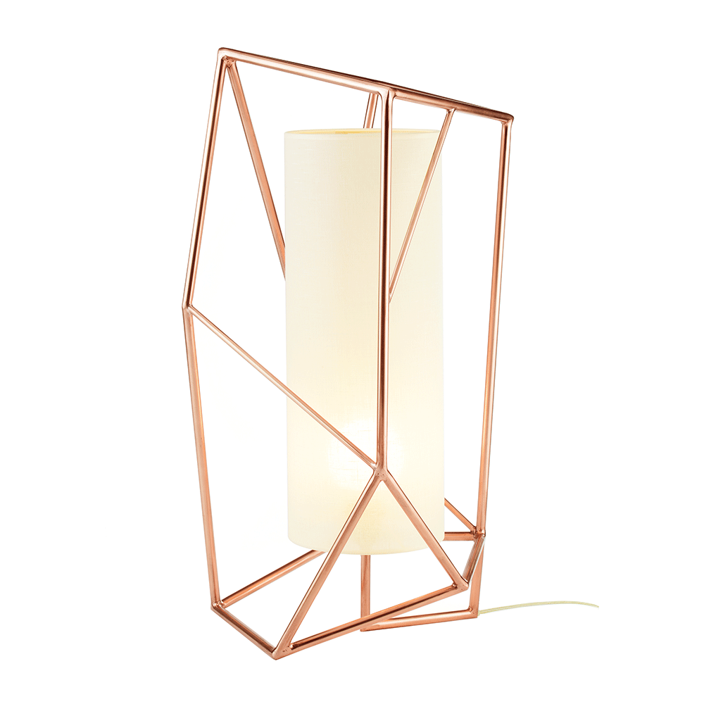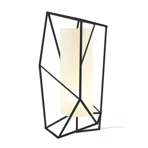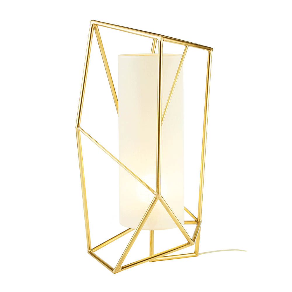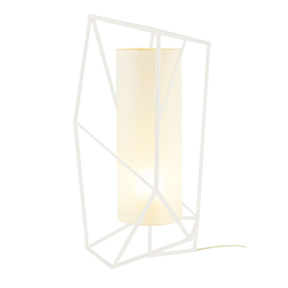 Star - Table Light is an elegant and sculptural table light featuring a drum-shaped cotton lampshade encased within a cage-like structure made of metal rods, highlighting the contrasts between hard and soft textures as well as regular and random shapes.