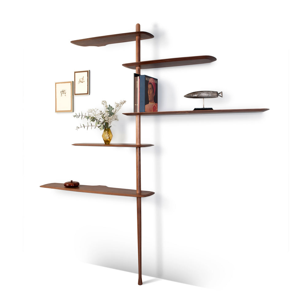 The Shelving System - Única is a clever system which allows fixed or pivoting shelves of different sizes to be attached to an elegant solid walnut pole, thus providing endless design possibilities. This beautiful and sophisticated set of shelves is ideal for use both at home and in commercial spaces, from living rooms and hallways to reception areas and hotel suites.