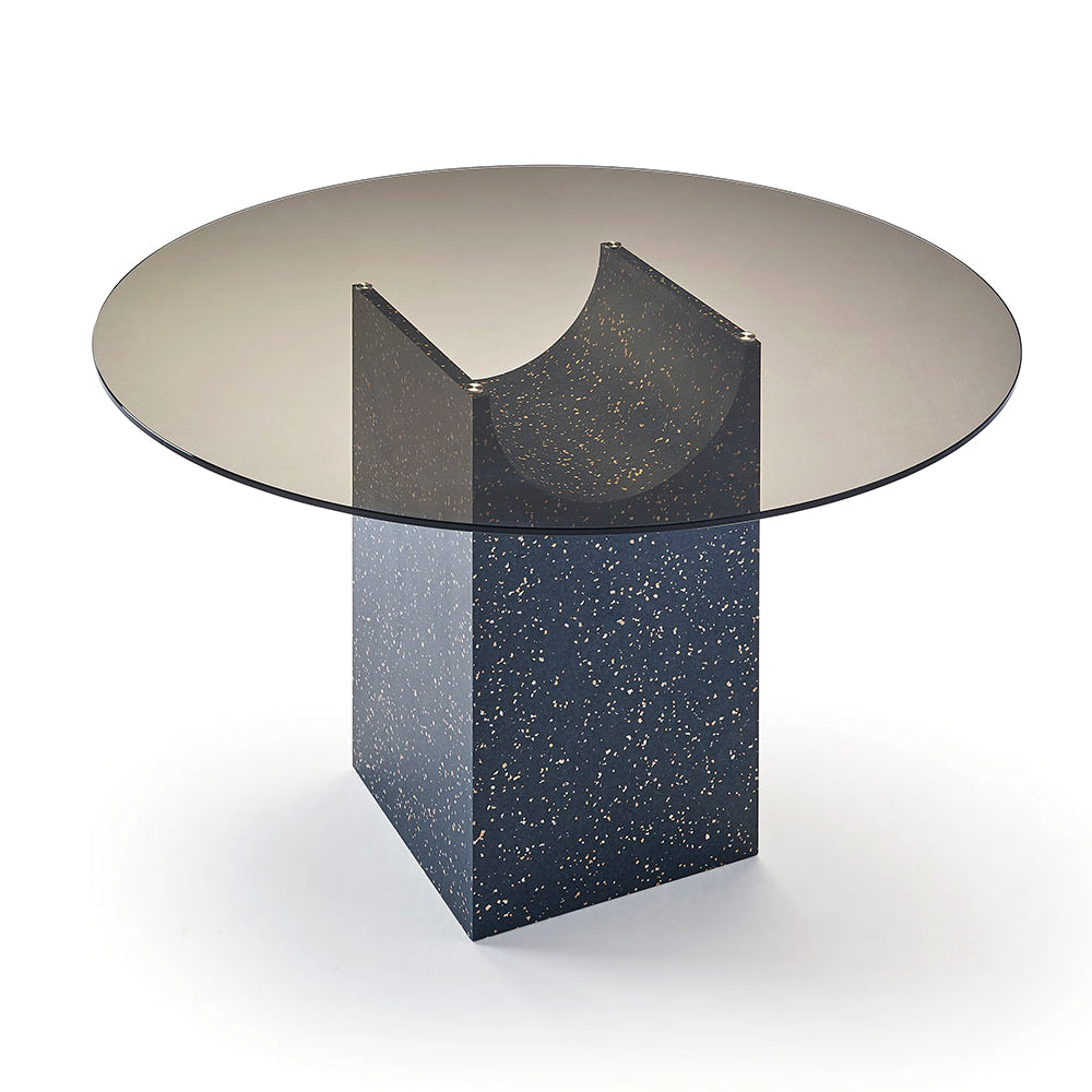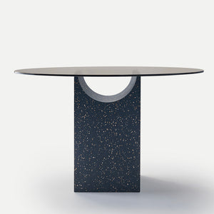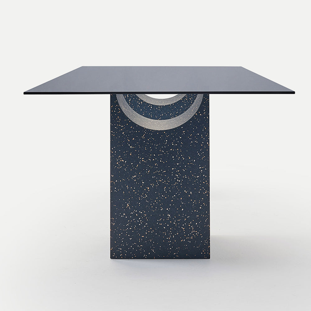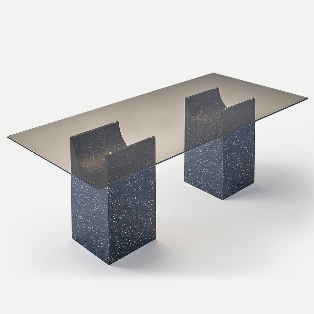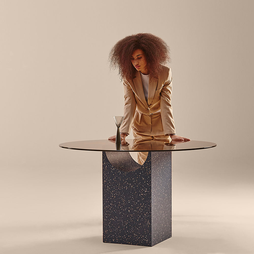 The sculptural base of the Vestige Dining Table is formed by a rectangular block from which a cylindrical section has been carved away, a distinctive shape which evokes the spirit of classic buildings from ancient civilisations. A tempered glass top rests delicately on the fine lines, showcasing the intersection of shapes. This collection of sculptural tables is perfect for minimalist contemporary design schemes, both in domestic and public spaces.