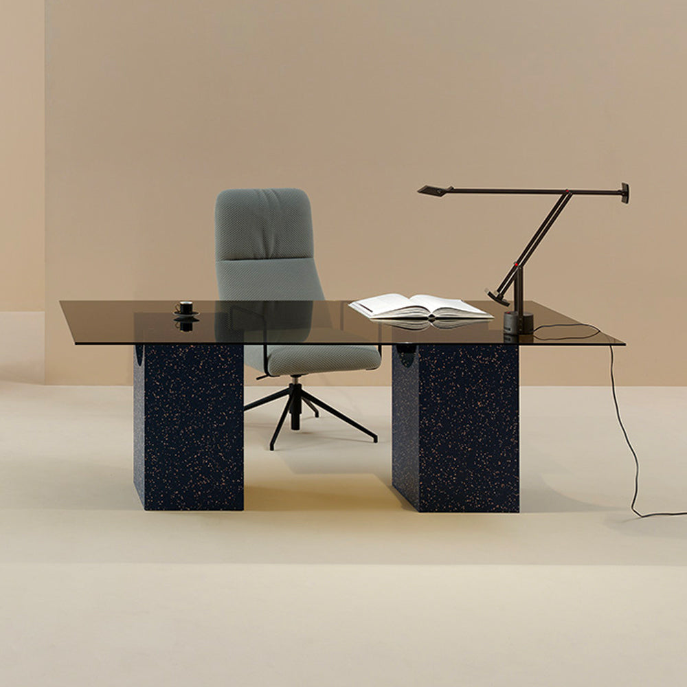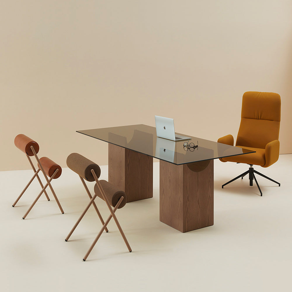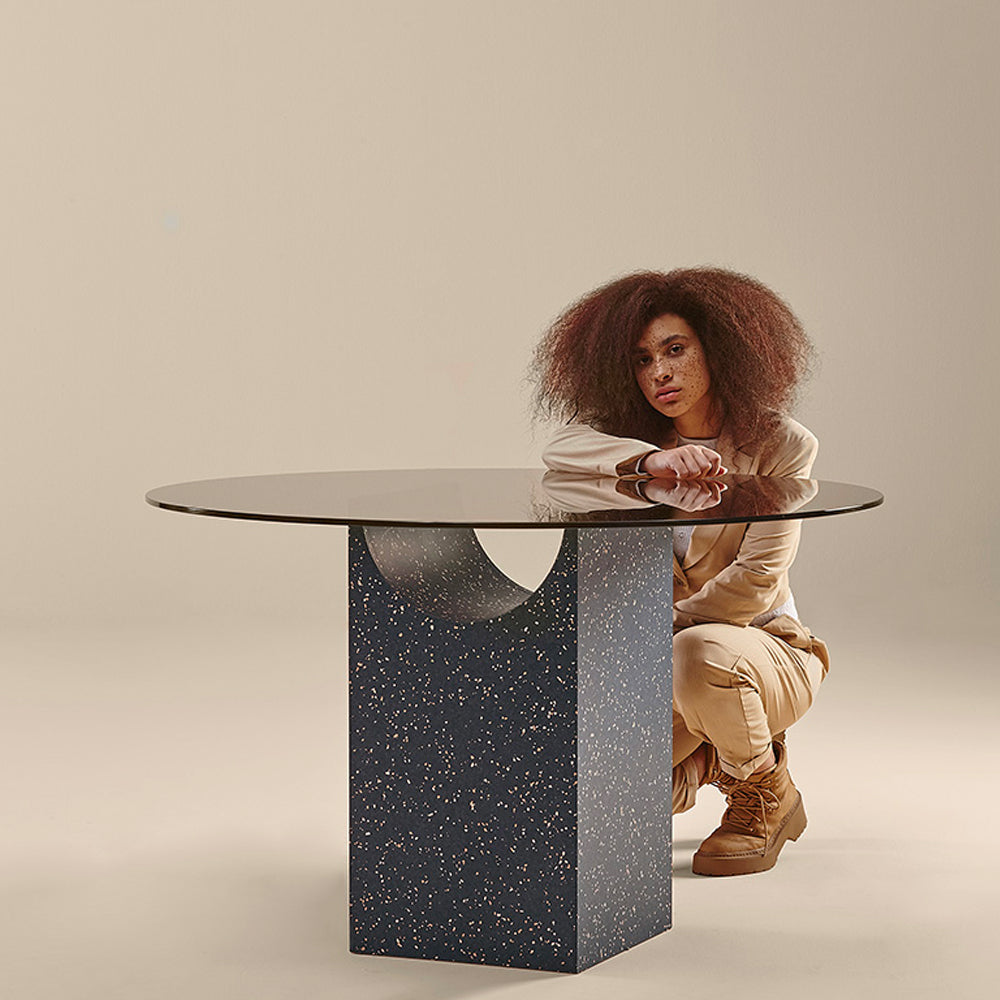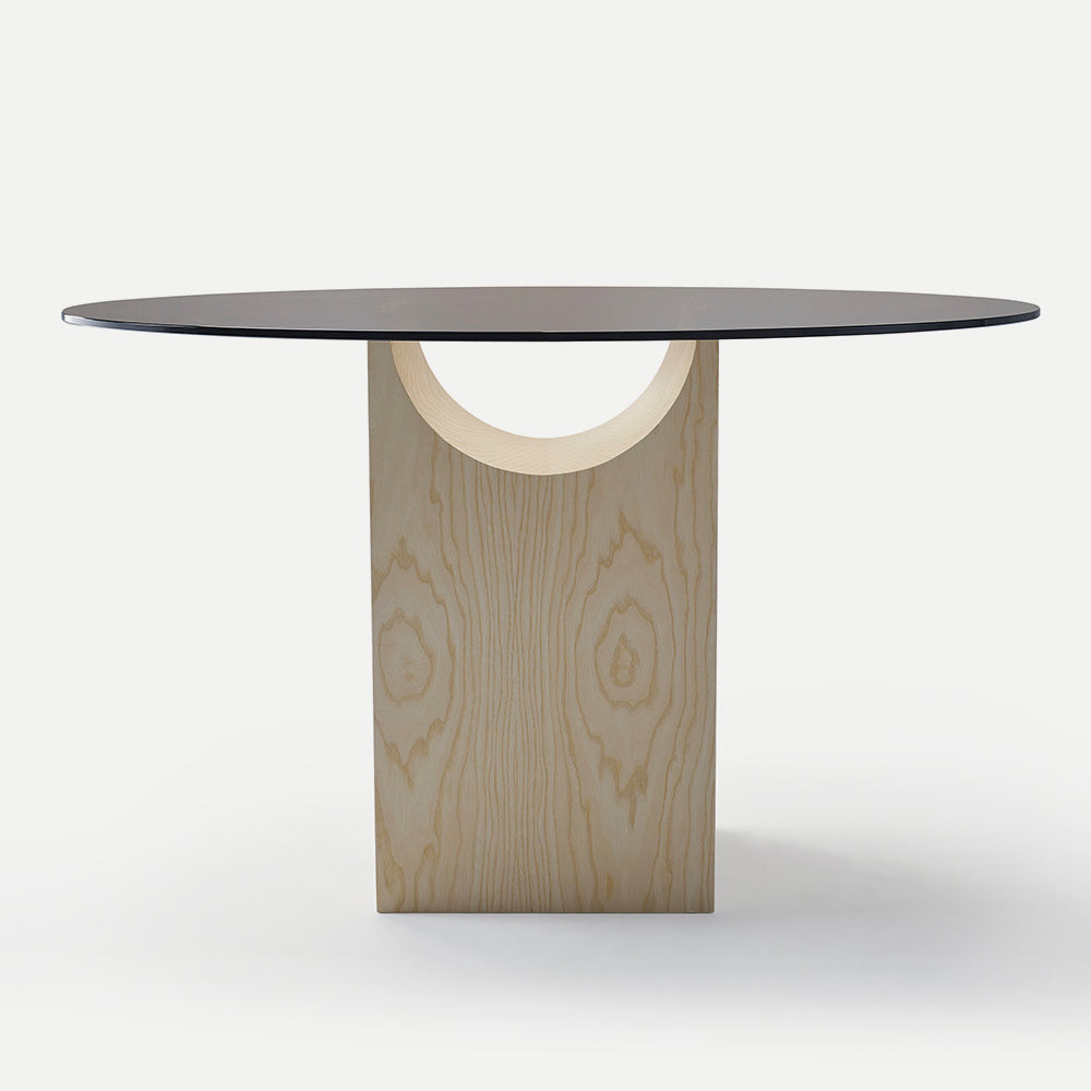 The sculptural base of the Vestige Dining Table is formed by a rectangular block from which a cylindrical section has been carved away, a distinctive shape which evokes the spirit of classic buildings from ancient civilisations. A tempered glass top rests delicately on the fine lines, showcasing the intersection of shapes. This collection of sculptural tables is perfect for minimalist contemporary design schemes, both in domestic and public spaces.