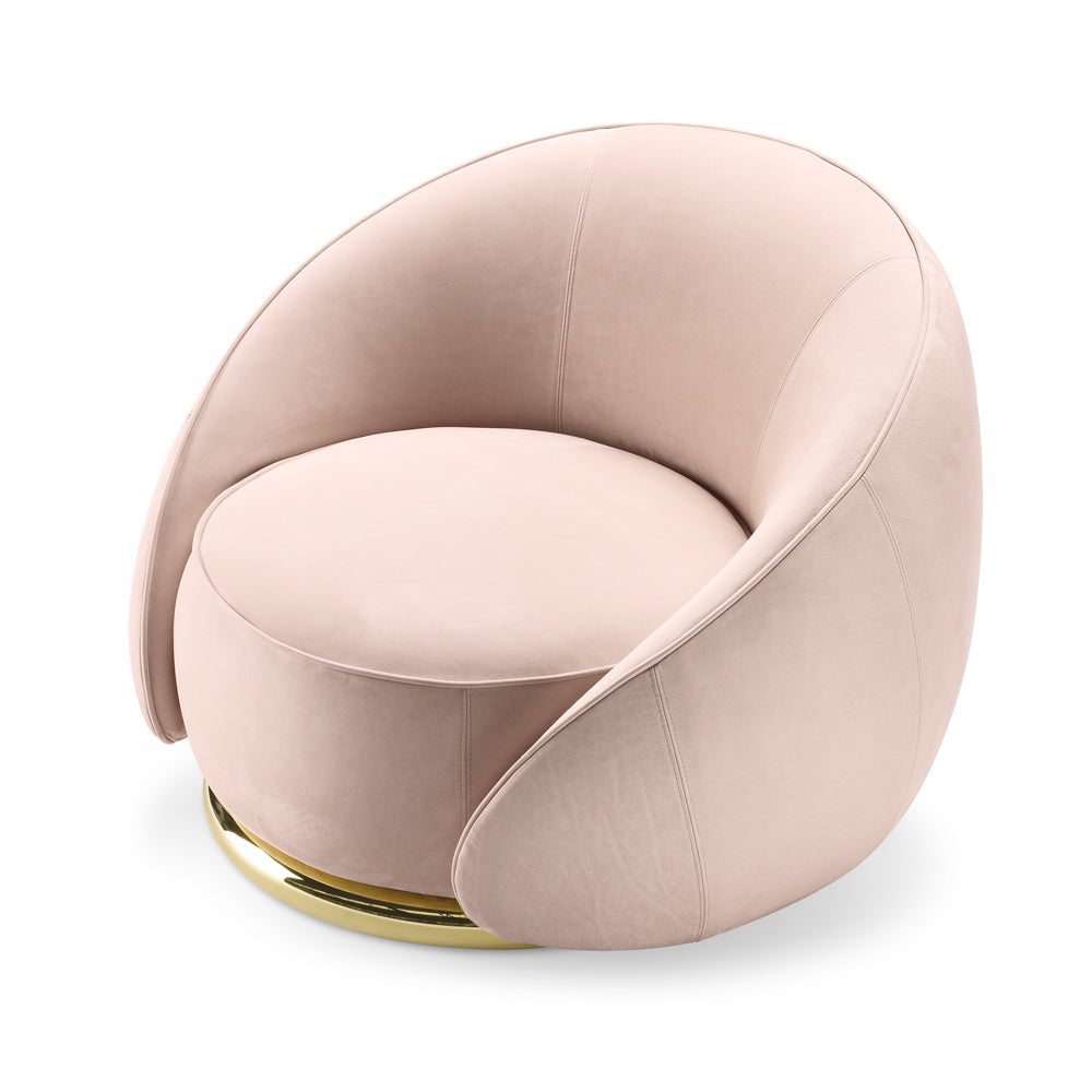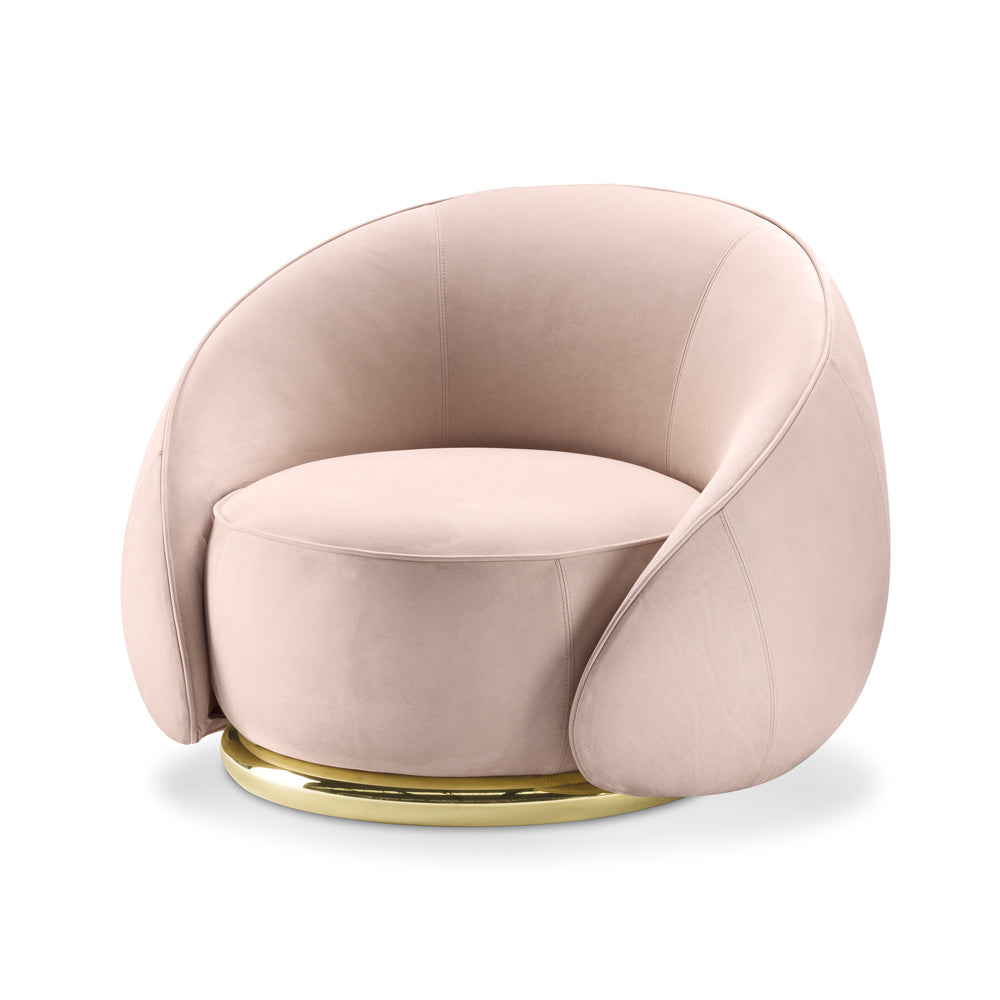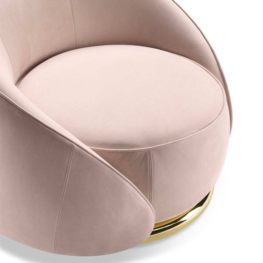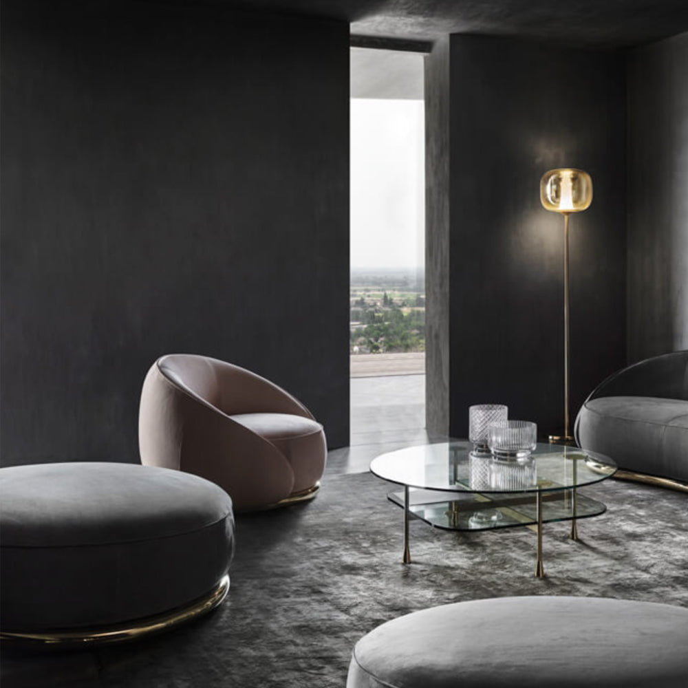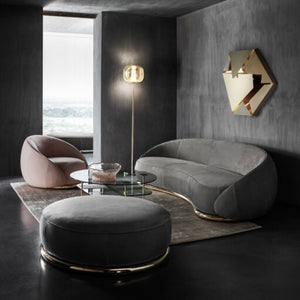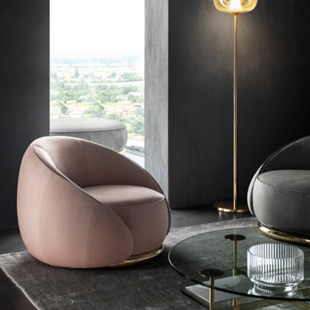 The Abbracci (hug in Italian) Armchair is inspired by the way hugs convey love and friendship. The armchair features distinctive wraparound arms and a voluptuous seat, upholstered in luxurious fabric or leather, with a brass metal tube at the base underlining the welcoming shape.