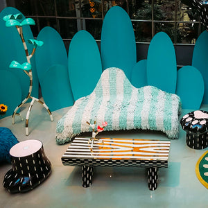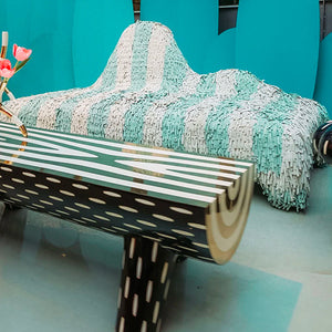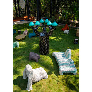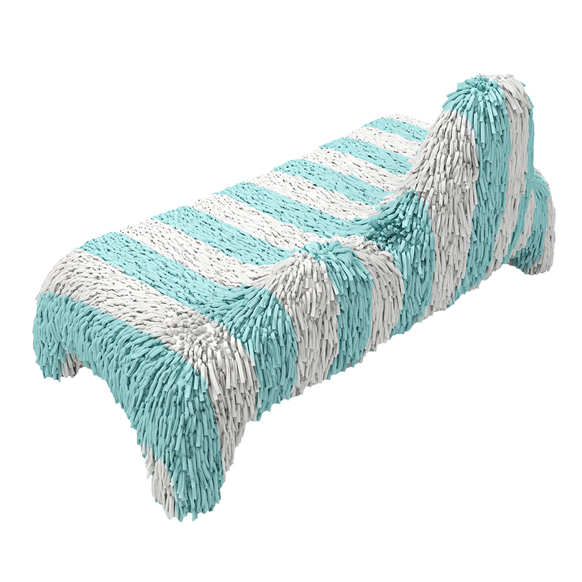 The Animal Seat is a quirky and comfortable armchair and also ottoman. The Animal Seat features an animalistic-shaped seat with a rich leather covering, available in multiple colours. The Animal Seat is available in one standard version: white and azure stripes.