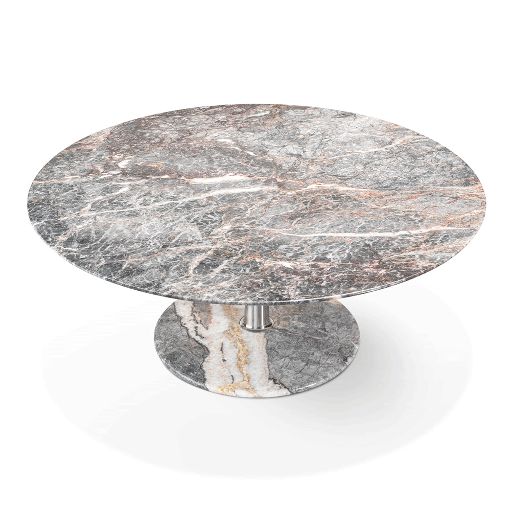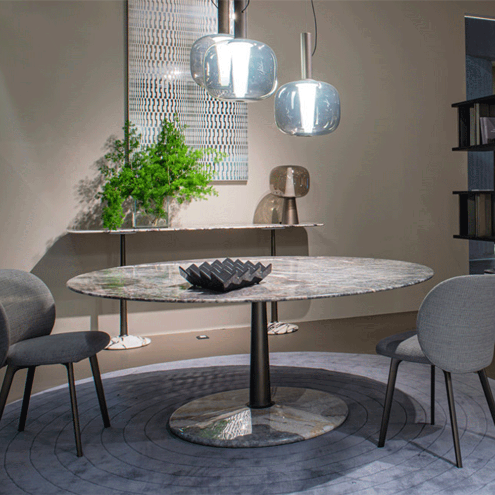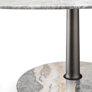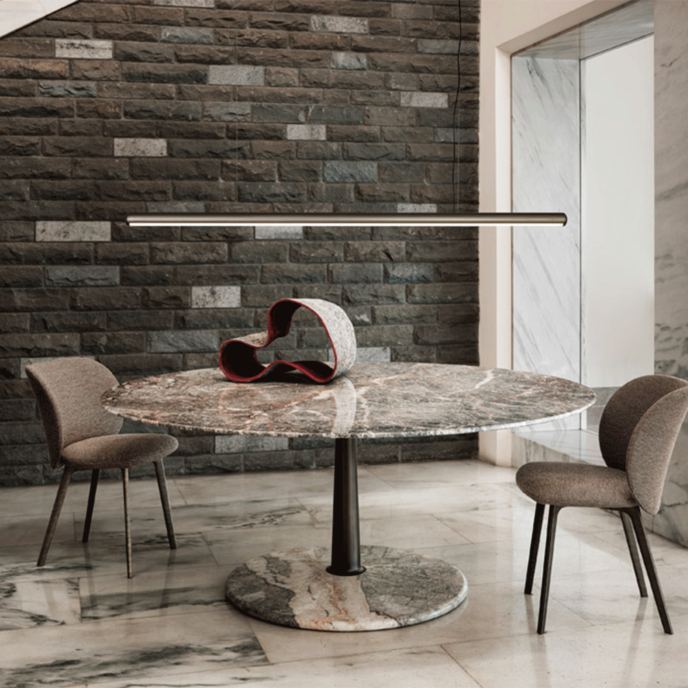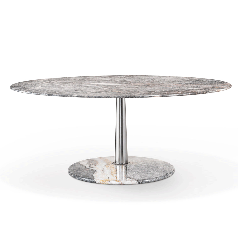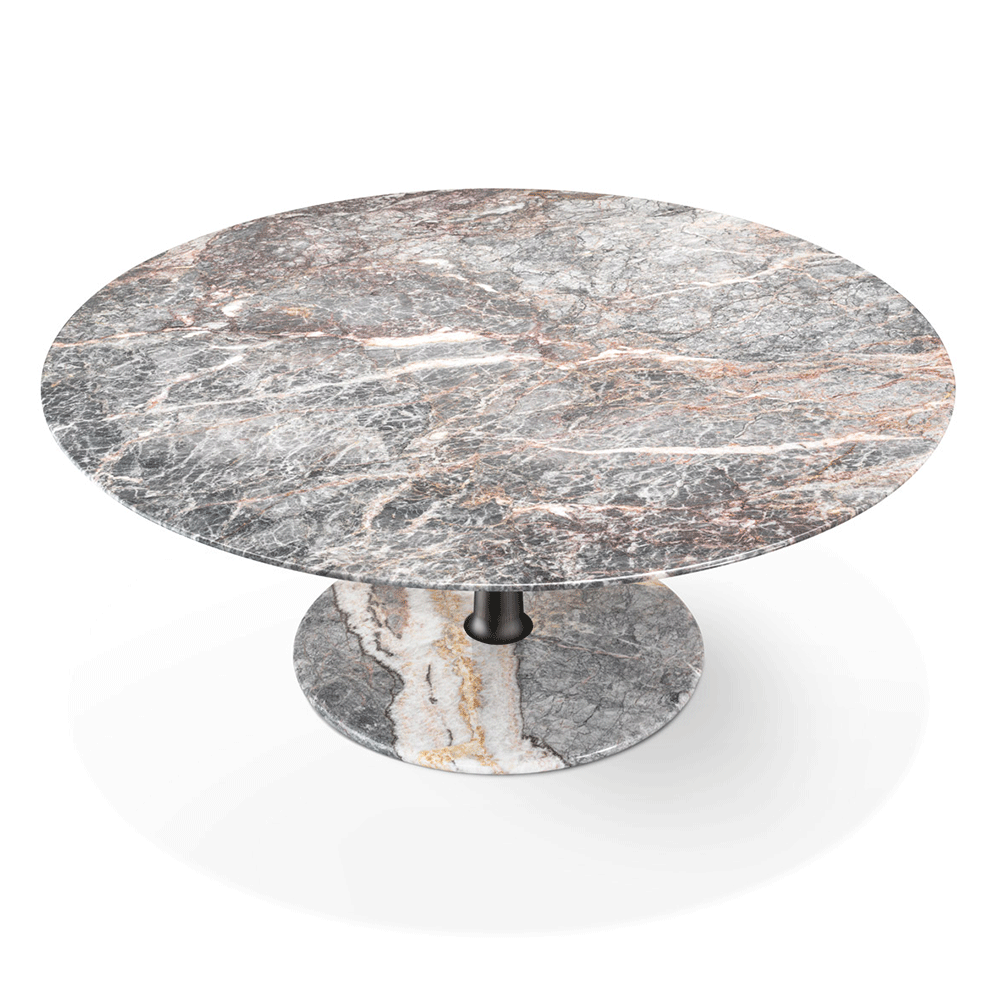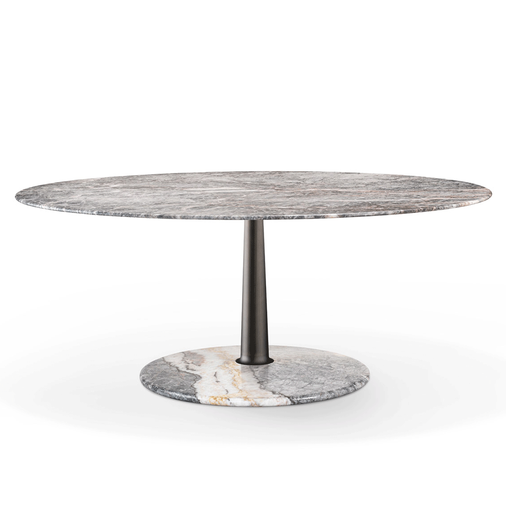 The Arnold Dining Table is made by using the artisanal techniques of "tapering". Three geometric shapes - a Line, a Plan, a Volume - and three materials - Metal, Wood, Marble - illustrate the "tapering" technique at its best ! A solid tapered column completed with connections at the base and at the head providing a comfortable support surface characterised by a thin rounded edge and a stable truncated cone base. The several combinations of the three geometries and the three materials are enriched by some dimensional variations and, with the study and fine-tuning of their overall proportions, take their definitive and complete form where the elegant aluminum column, which draws and solves the connection and attachment between the top and the base, becomes the distinctive element of the project without taking over the other elements that take part in the compositional game.