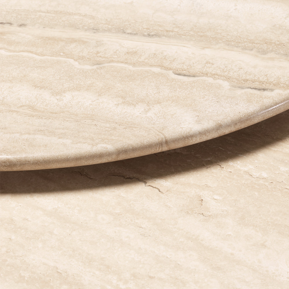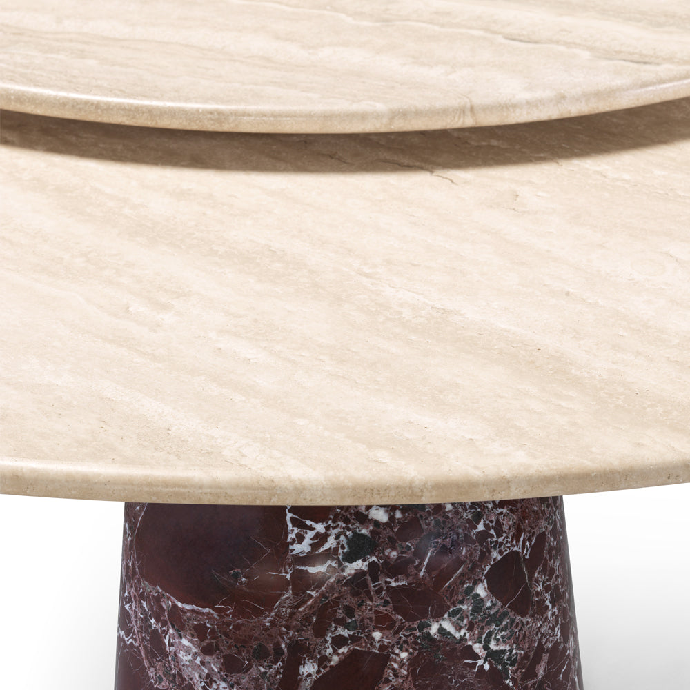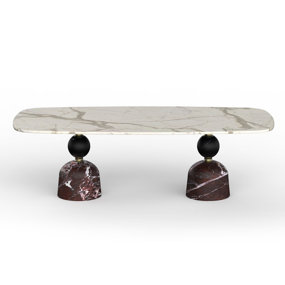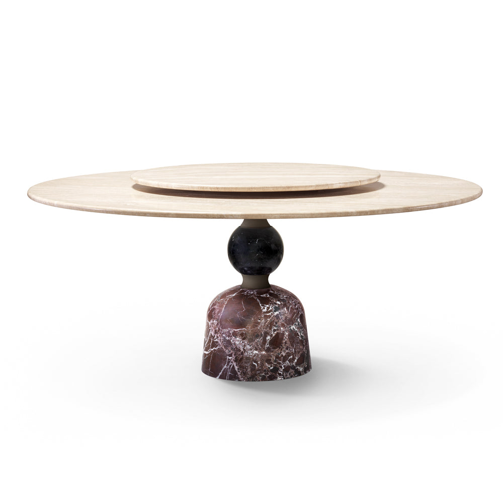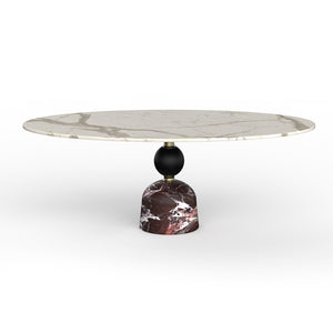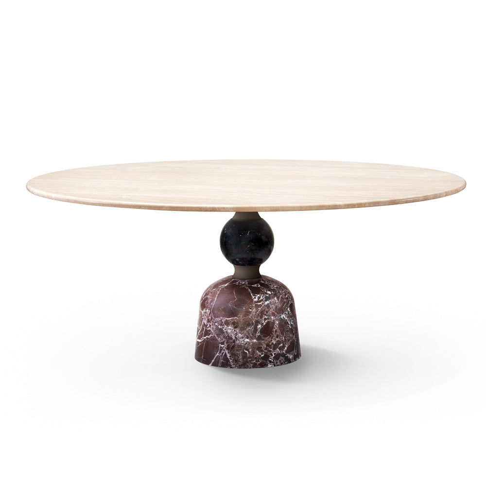 The Artù Table has a large round marble top supported by a solid base composed by a series of overlapping concave and convex circular parts, alternating metal (brushed burnished metal) and coloured marble. The circles evoke the legend of the “Knights of the Round Table” and “King Arthur”, whereas the marble stone and metal recall the “Sword in the Stone” back to Excalibur. Arthur translates Artù in Italian - hence the table of the table. Whilst the Artù round small, round large, oval and rectangular small rest on one marble base, the rectangular medium and large rest on two marble bases.