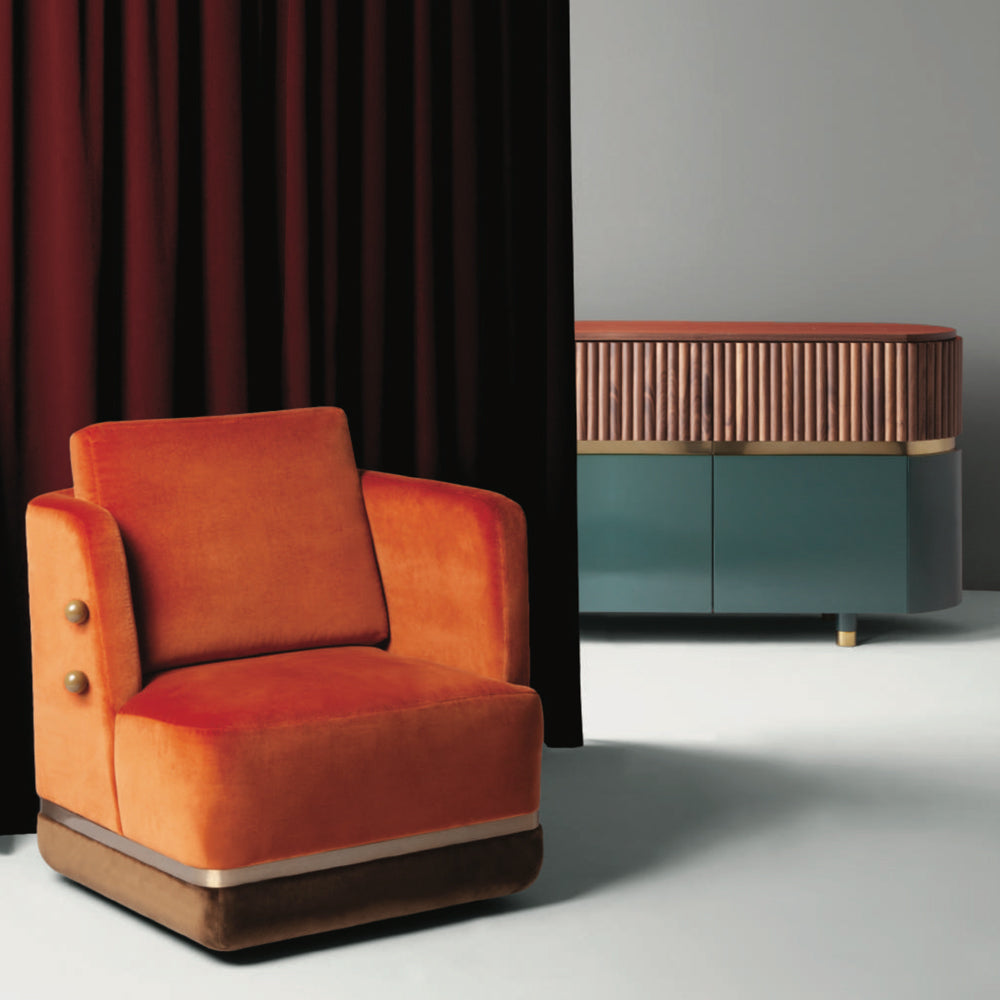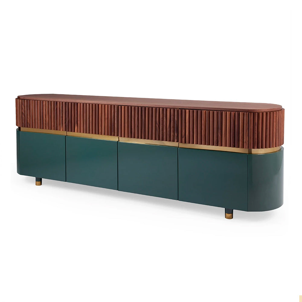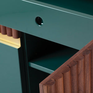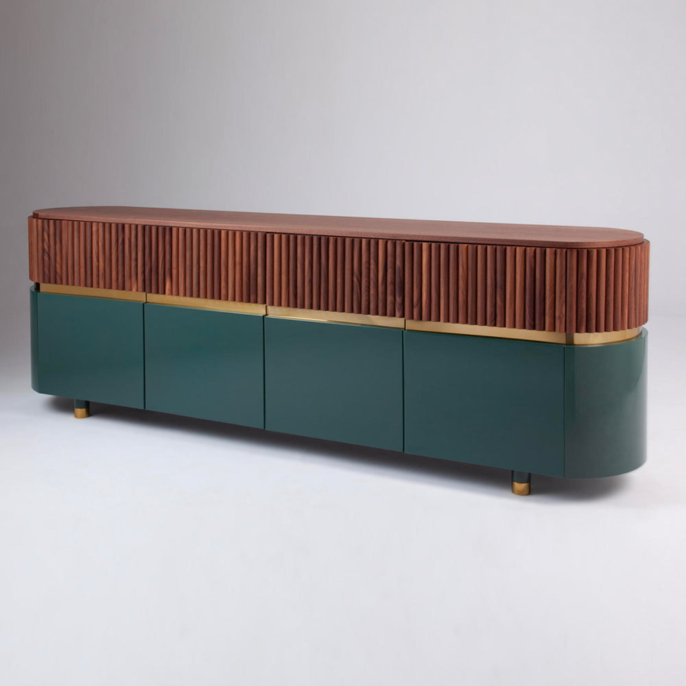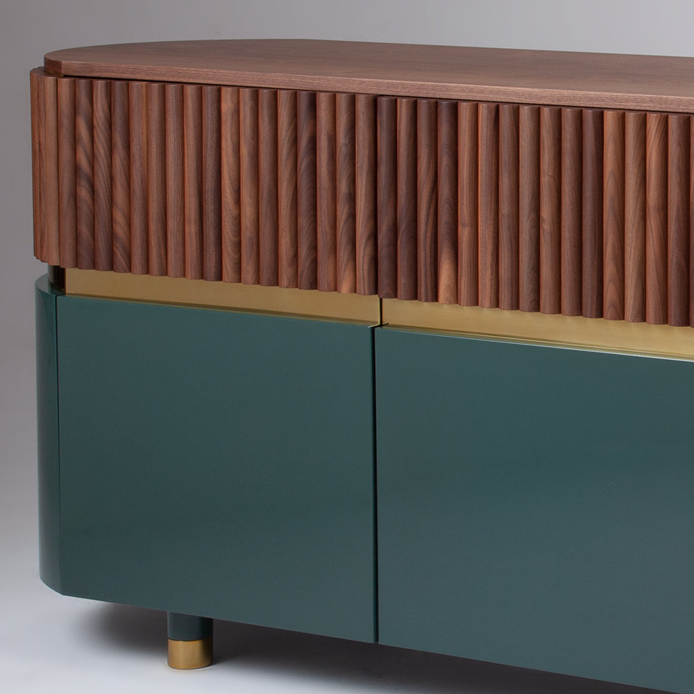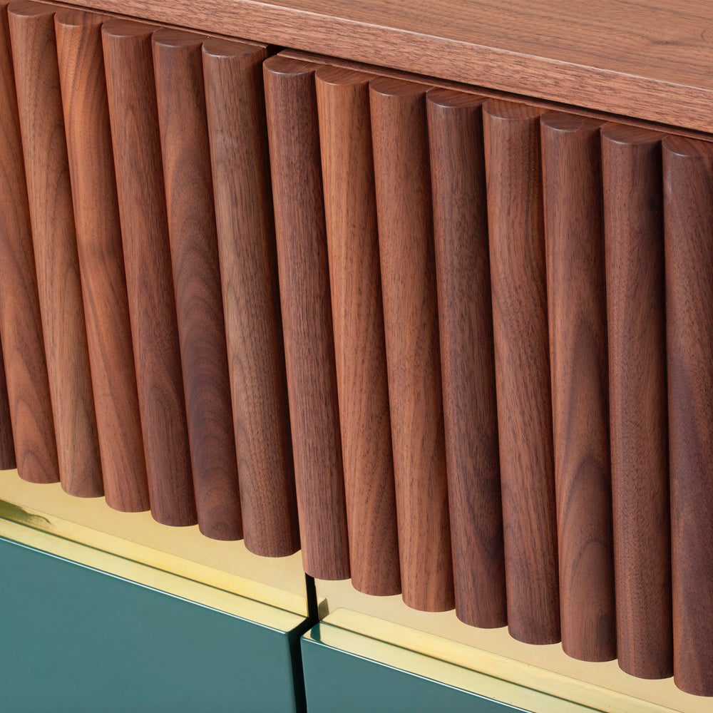 - First image: top and reliefs: solid walnut in natural finish; metal applications: stainless steel plate in polished brass finish; base and feet: MDF lacquered in olive finish