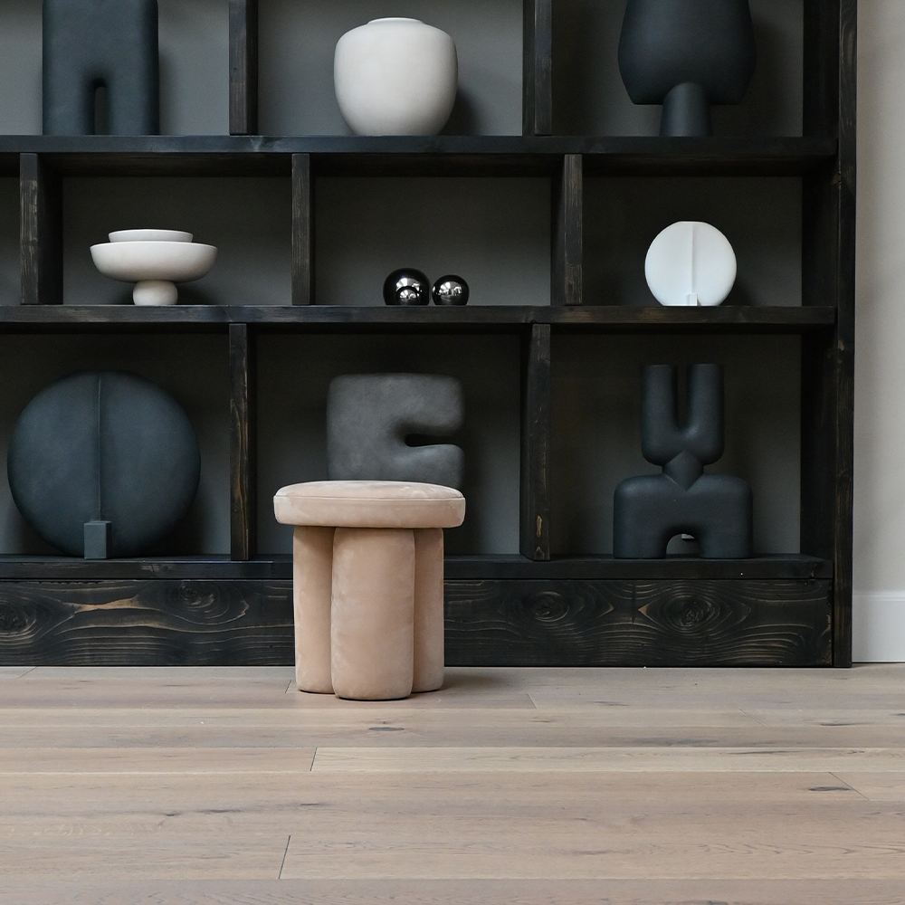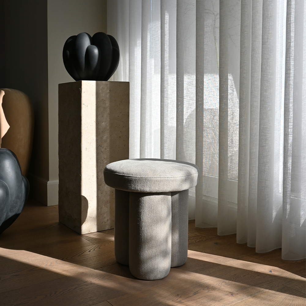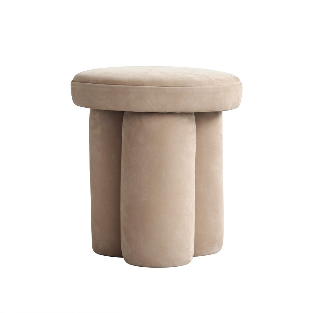 The Big Foot Stool is characterised by its sculptural cylinder-shaped legs, creating a massive and heavy appearance inspired by brutalist architecture from the mid-20th century. The stool is upholstered in multiple fabric options.