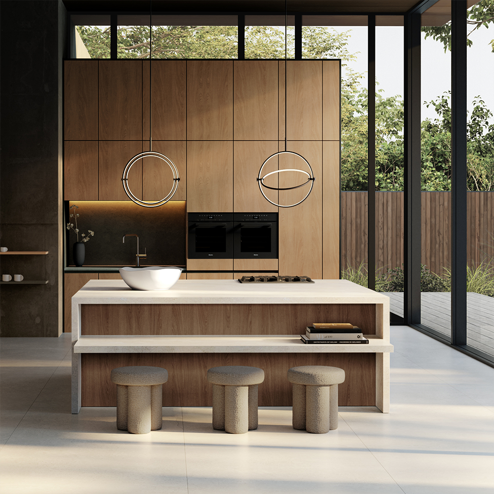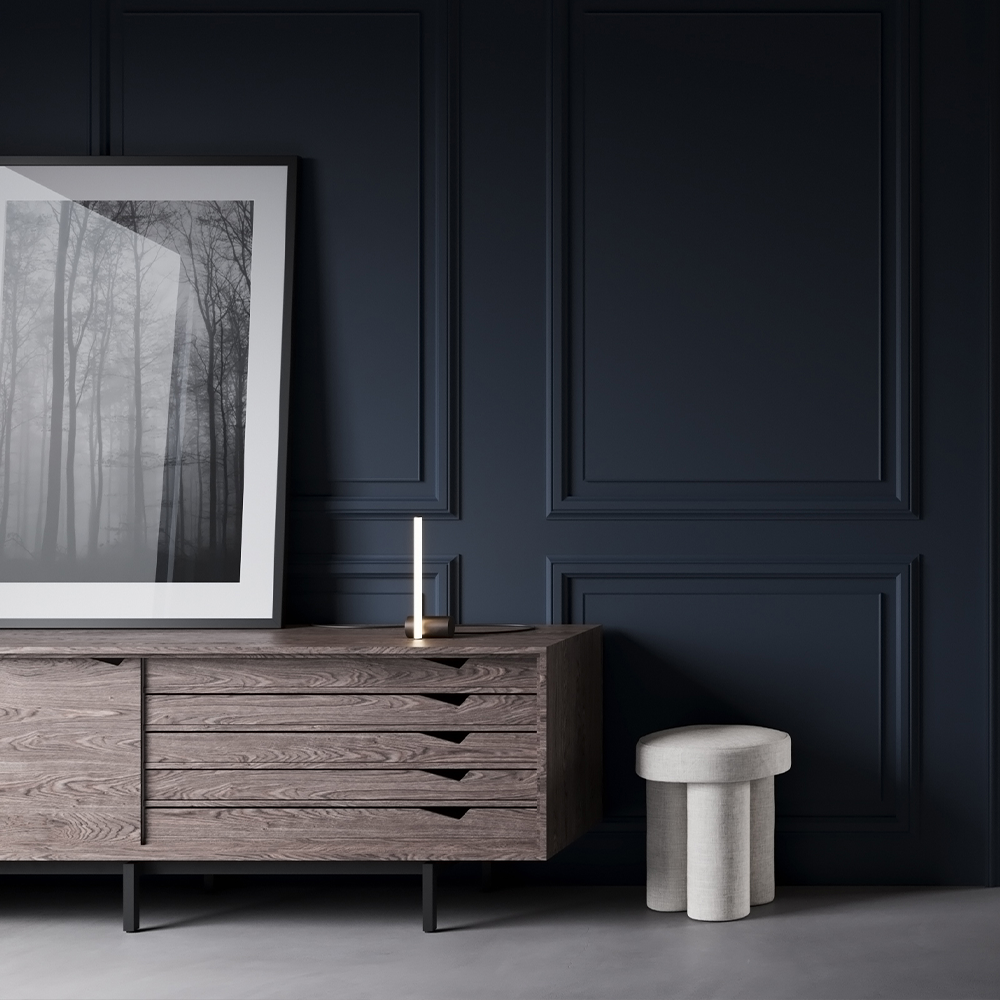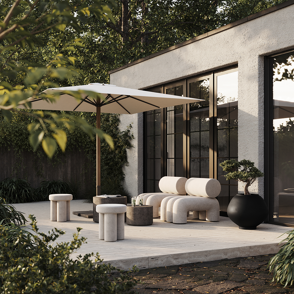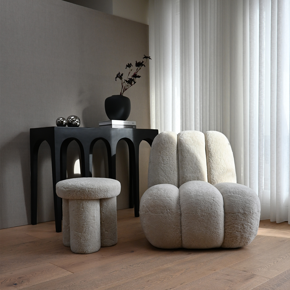 The Big Foot Stool is characterised by its sculptural cylinder-shaped legs, creating a massive and heavy appearance inspired by brutalist architecture from the mid-20th century. The stool is upholstered in multiple fabric options.