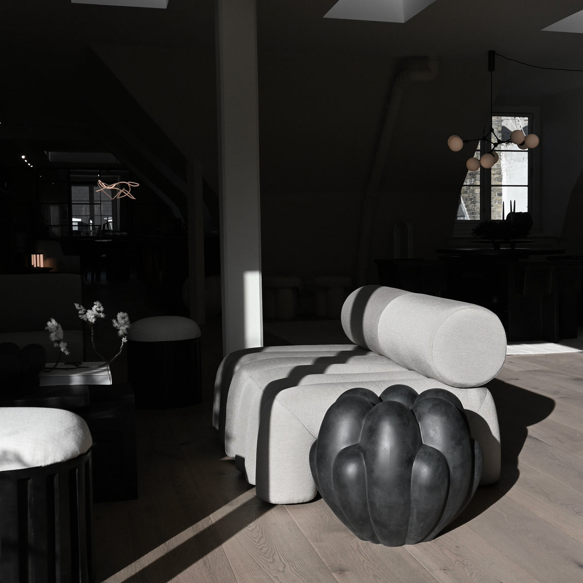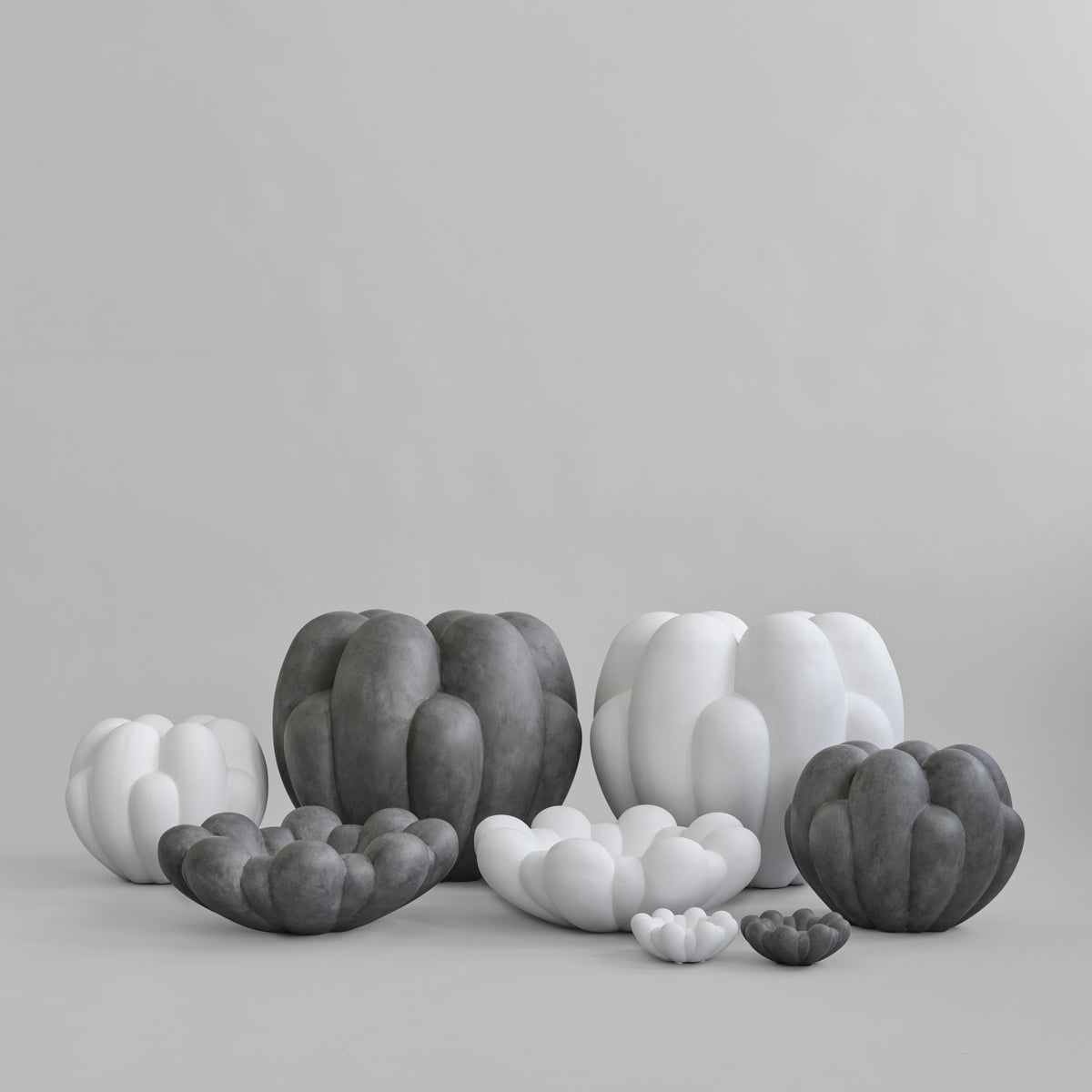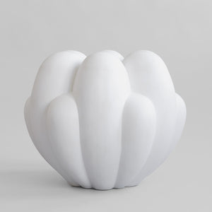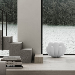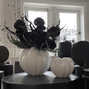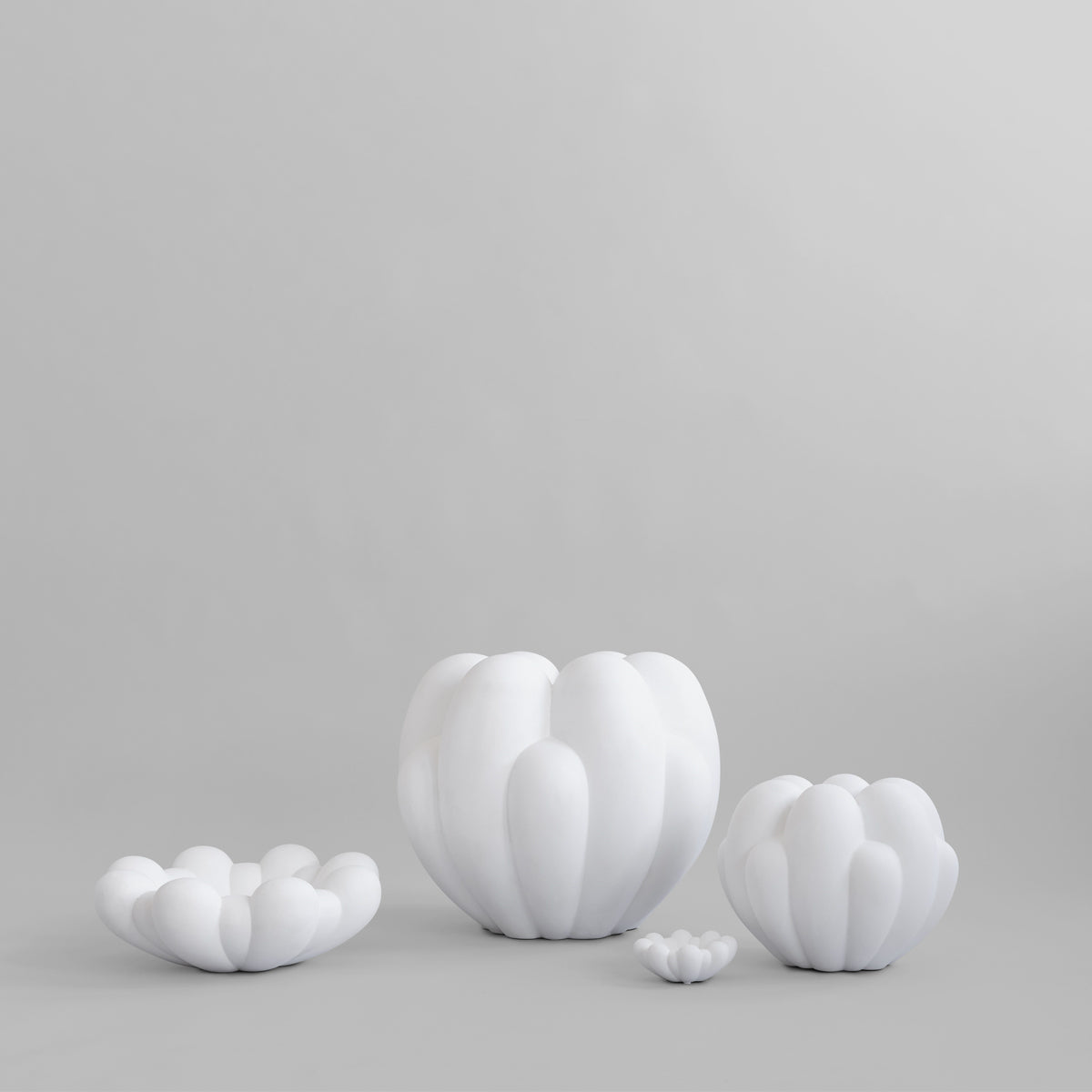 Bloom is an interpretation of 70s floral inspired design. But with a more raw and clean expression. The smoothly curved surface is contrasted by a strong underlying geometry and is enriched by a beautiful play of shadows around the depths of the surface. Due to its expressive design, the Bloom vases changes experience throughout the day, according to the position of light and shadows.
