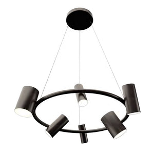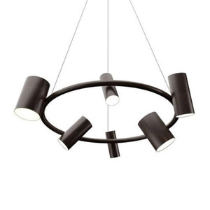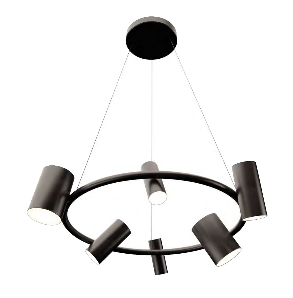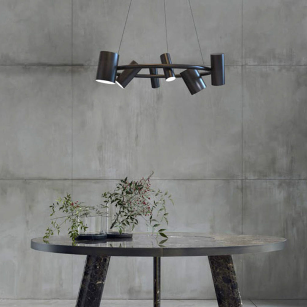 The Can Can Suspension Lamp features six can-shaped spotlights of different sizes attached to a suspended ring. Each spotlight can be easily adjusted in multiple directions, including upwards and downwards, thereby working as a task, ambient and accent light all at the same time.