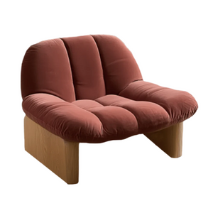 - First image: wood base in Camel oak with seat and back fully upholstered in Fine Terracotta fabric