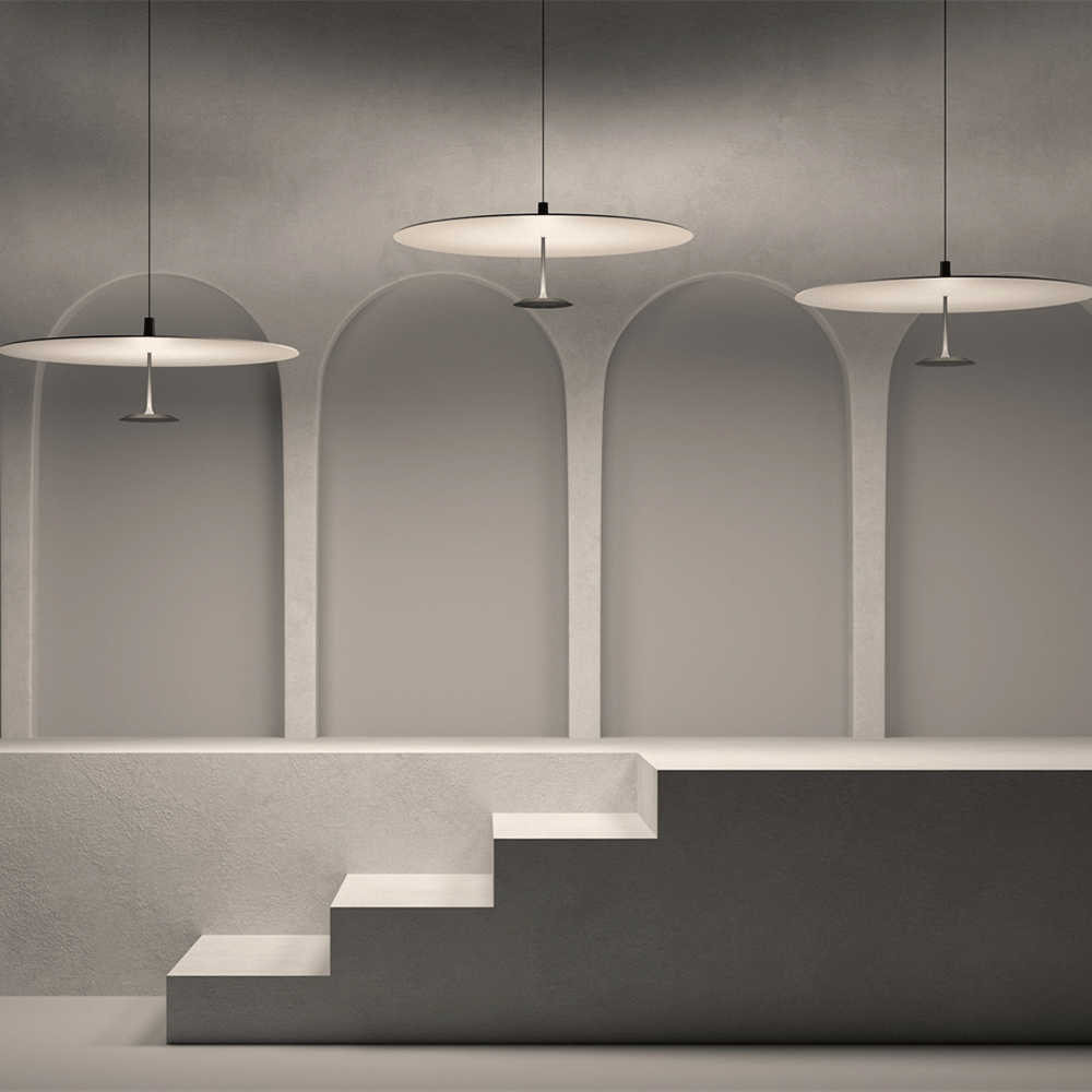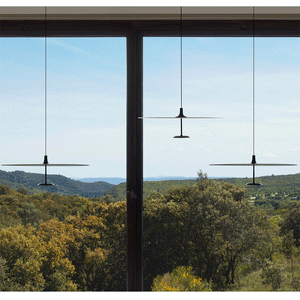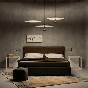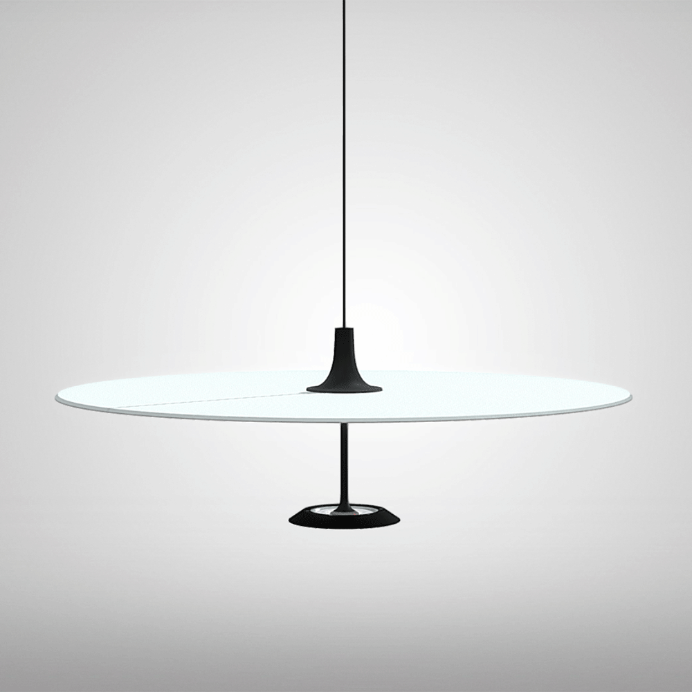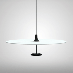 The Dot 600 Lite Modular Suspension Light, designed by Foster + Partners for Lumina, is made of two discs connected by a slender metal tube. The smaller disk at the bottom, made of turned aluminium, contains the LED element which has been optically engineered to cast a strong beam of light. This light is directed at the top disc, made of lacquered aluminium, which acts as a diffuser. When switched on, the light looks like a thin, lightweight disc, seemingly suspended in mid-air, generating an enveloping flux of light without shadows. This version of the Dot Suspension Light is designed for use in clusters, featuring a new smart electrical connection system which connects the different components and simplifies and speeds up installation. In addition, the light is suspended by the power cable without the need for a separate cable, which makes the light look particularly sleek. The lower disc and the metal rod is available in semi-glossy black and ultra-matte white finishes.