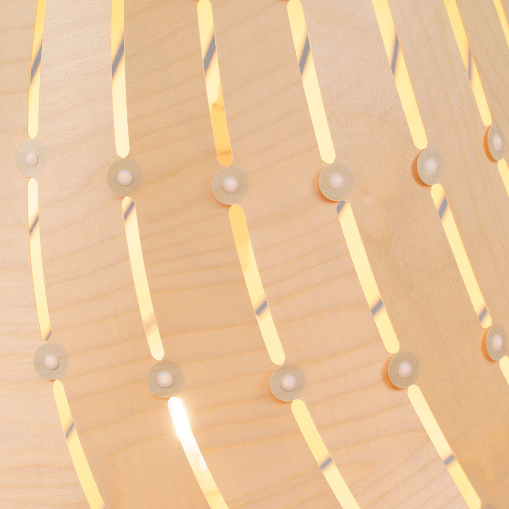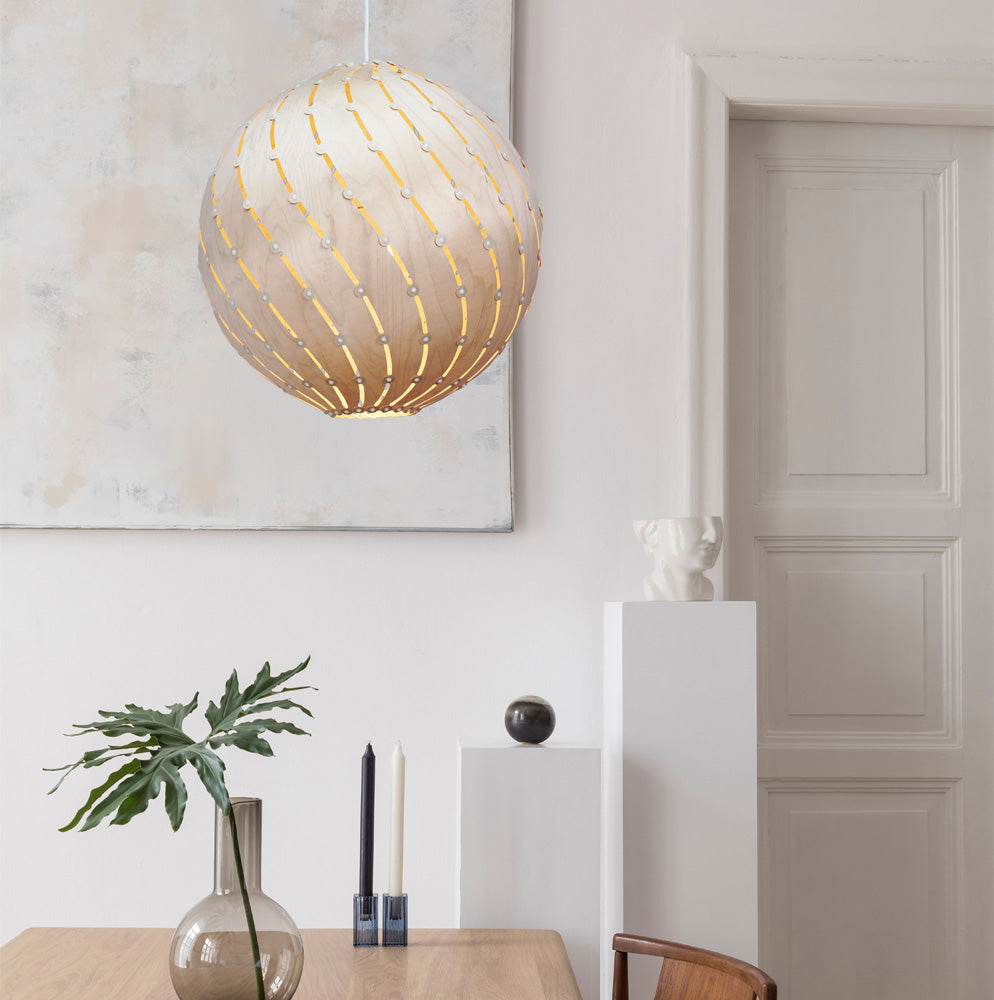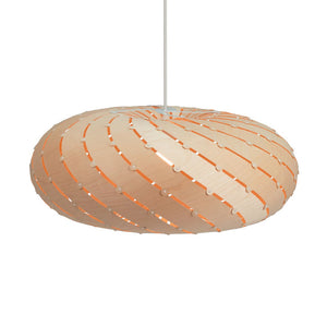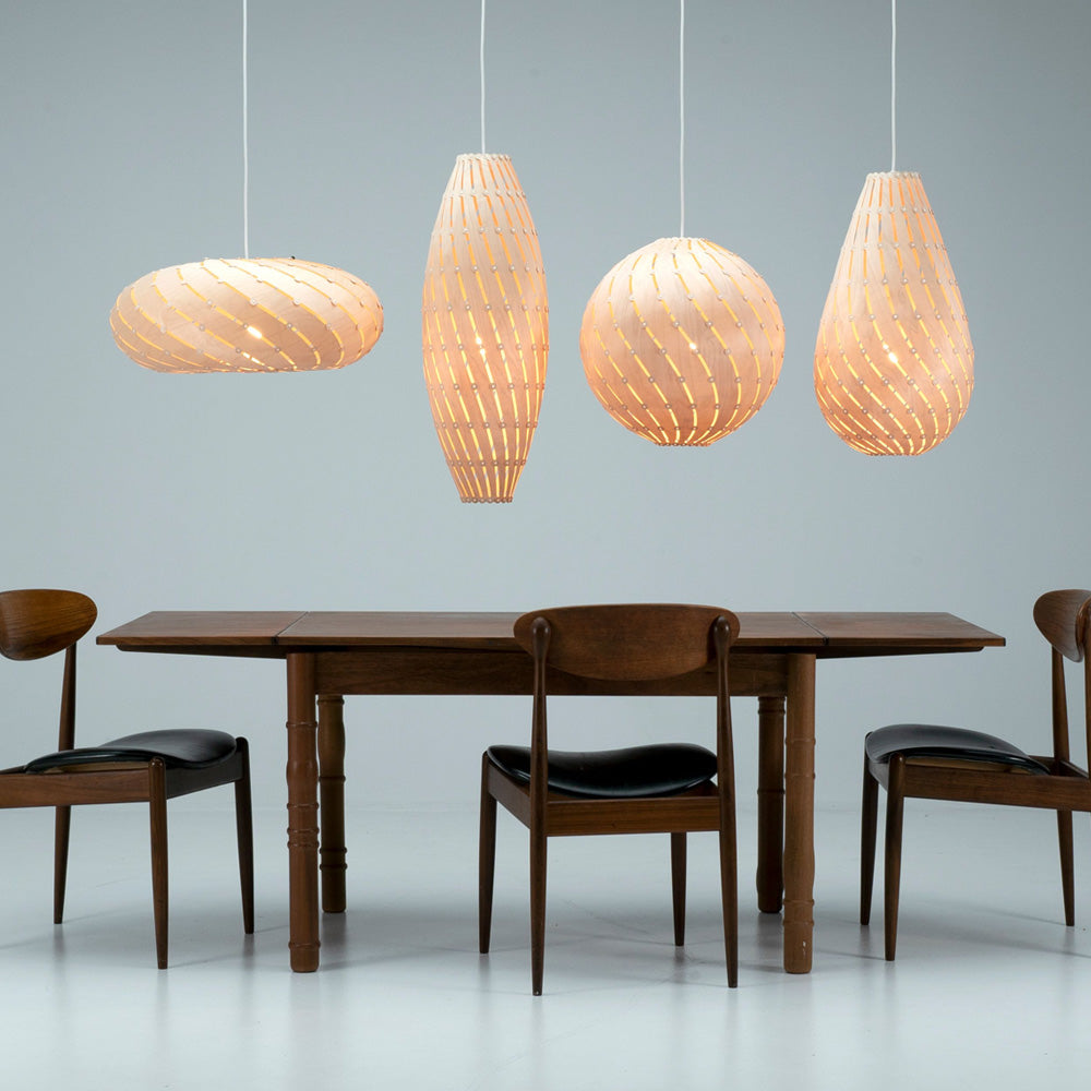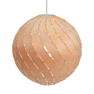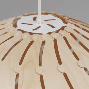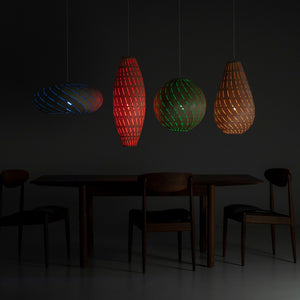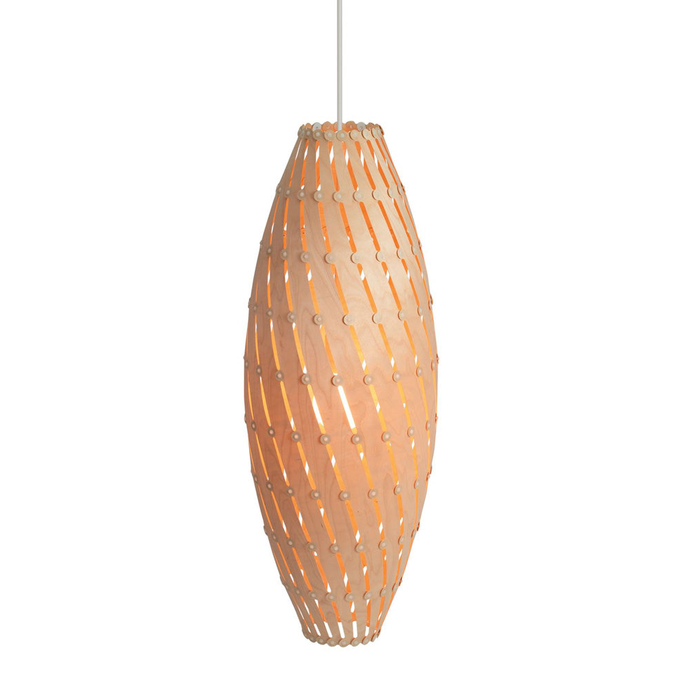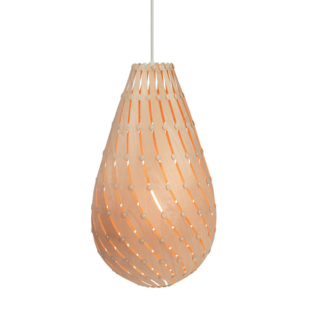 Ebb is a family of four organic shaped suspension lights with a weave pattern inspired by the way light plays on water ripples. The light is made of birch plywood strips which are clipped together to create a three dimensional shape. The design highlights the grains of the natural birch and enables the light to cast beautiful shadows through the lantern shaped shade. This clever flat-packed kit system also lowers the shipping weight of the light substantially, thereby reducing its carbon footprint.
