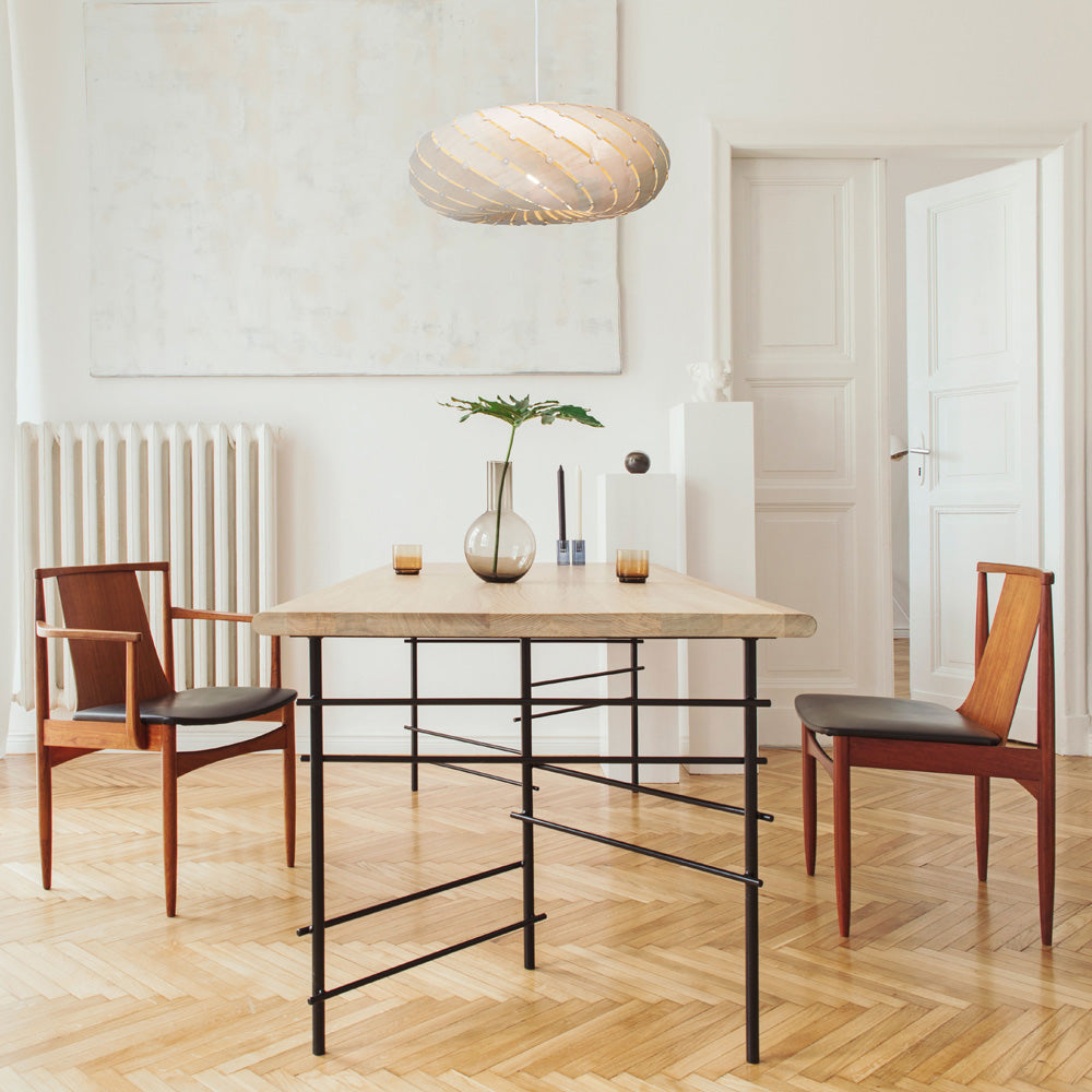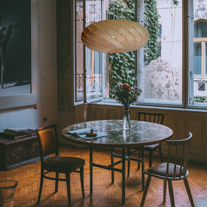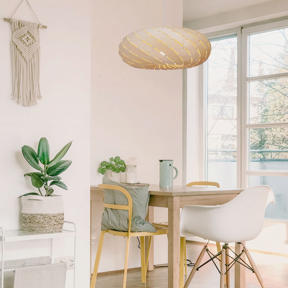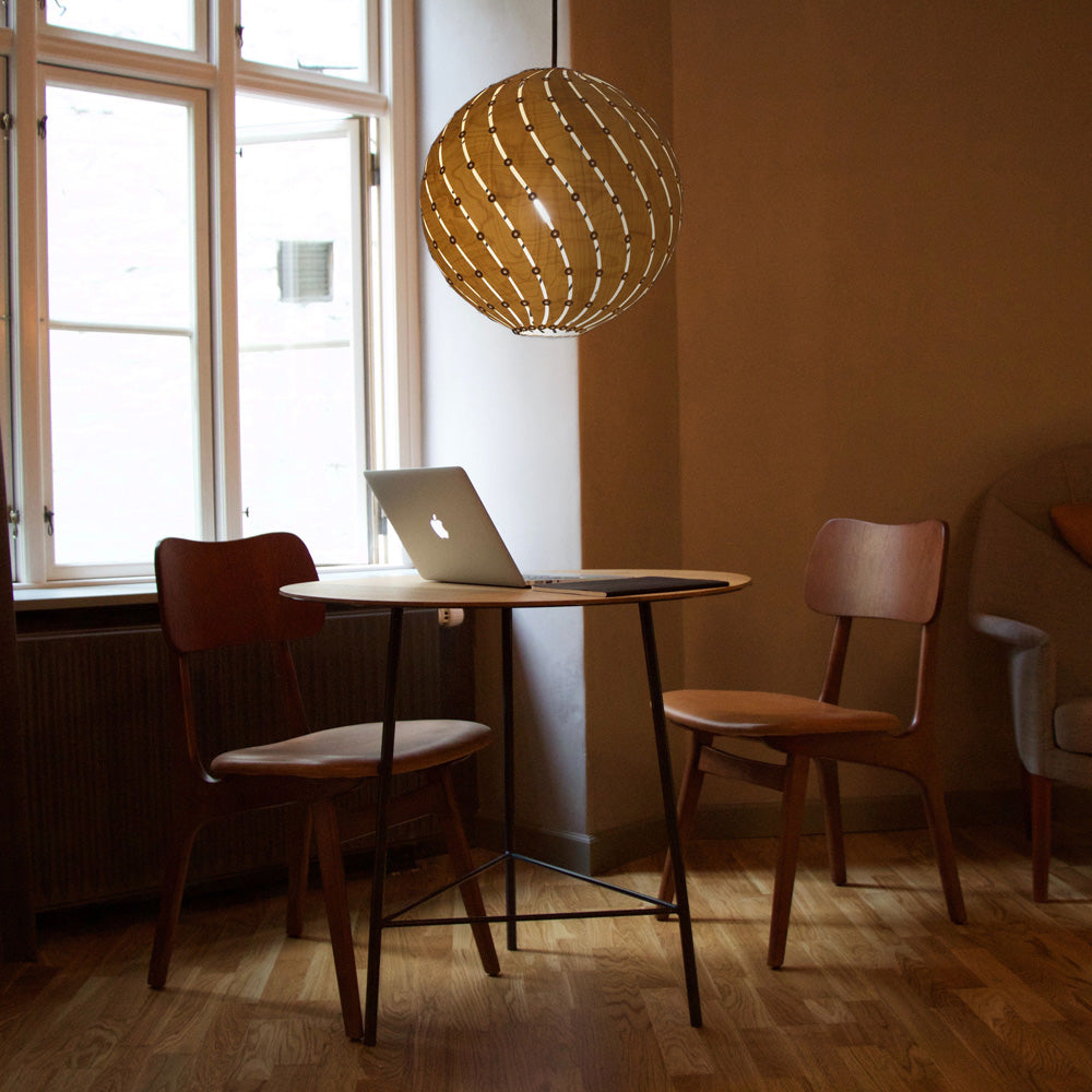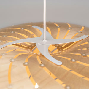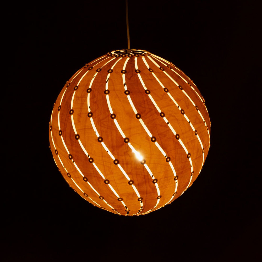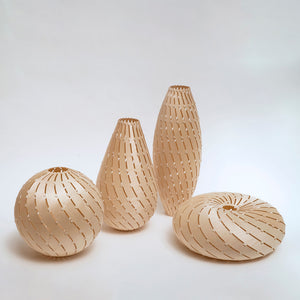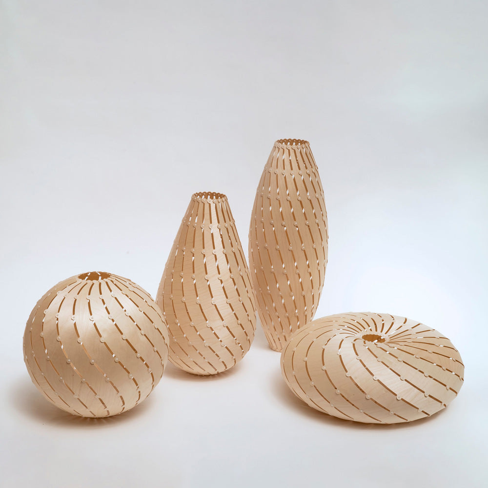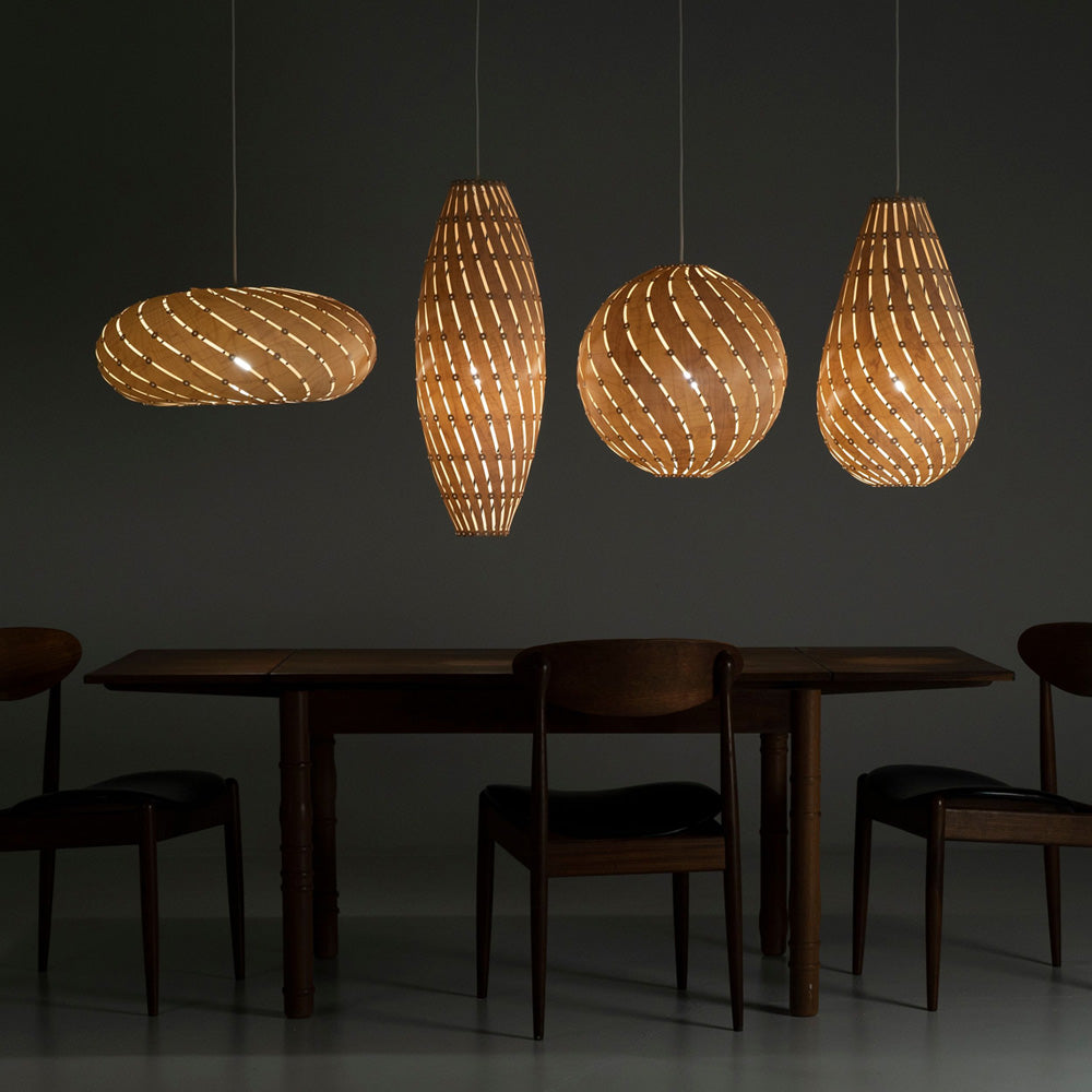 Ebb is a family of four organic shaped suspension lights with a weave pattern inspired by the way light plays on water ripples. The light is made of birch plywood strips which are clipped together to create a three dimensional shape. The design highlights the grains of the natural birch and enables the light to cast beautiful shadows through the lantern shaped shade. This clever flat-packed kit system also lowers the shipping weight of the light substantially, thereby reducing its carbon footprint.