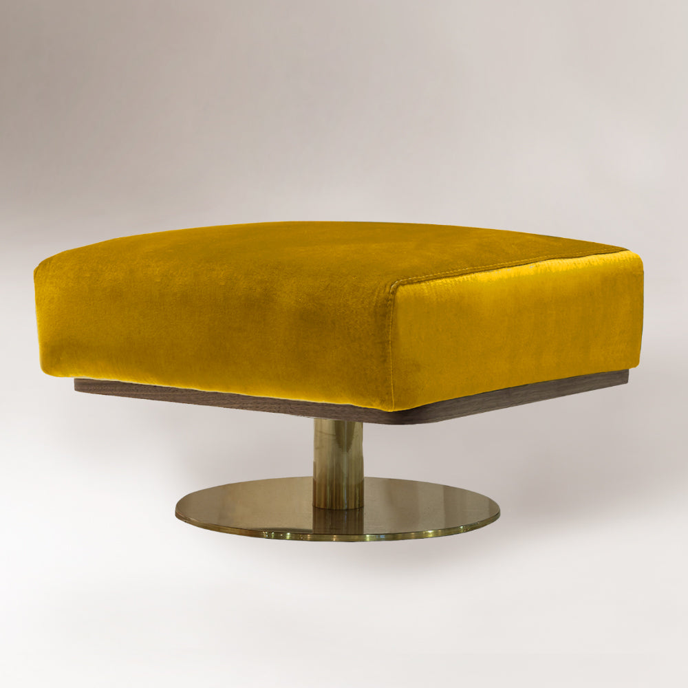 - First image: structure in solid walnut wood in natural finish; upholstery in Velvet Safran; swivel base in stainless steel plate in polished brass finish