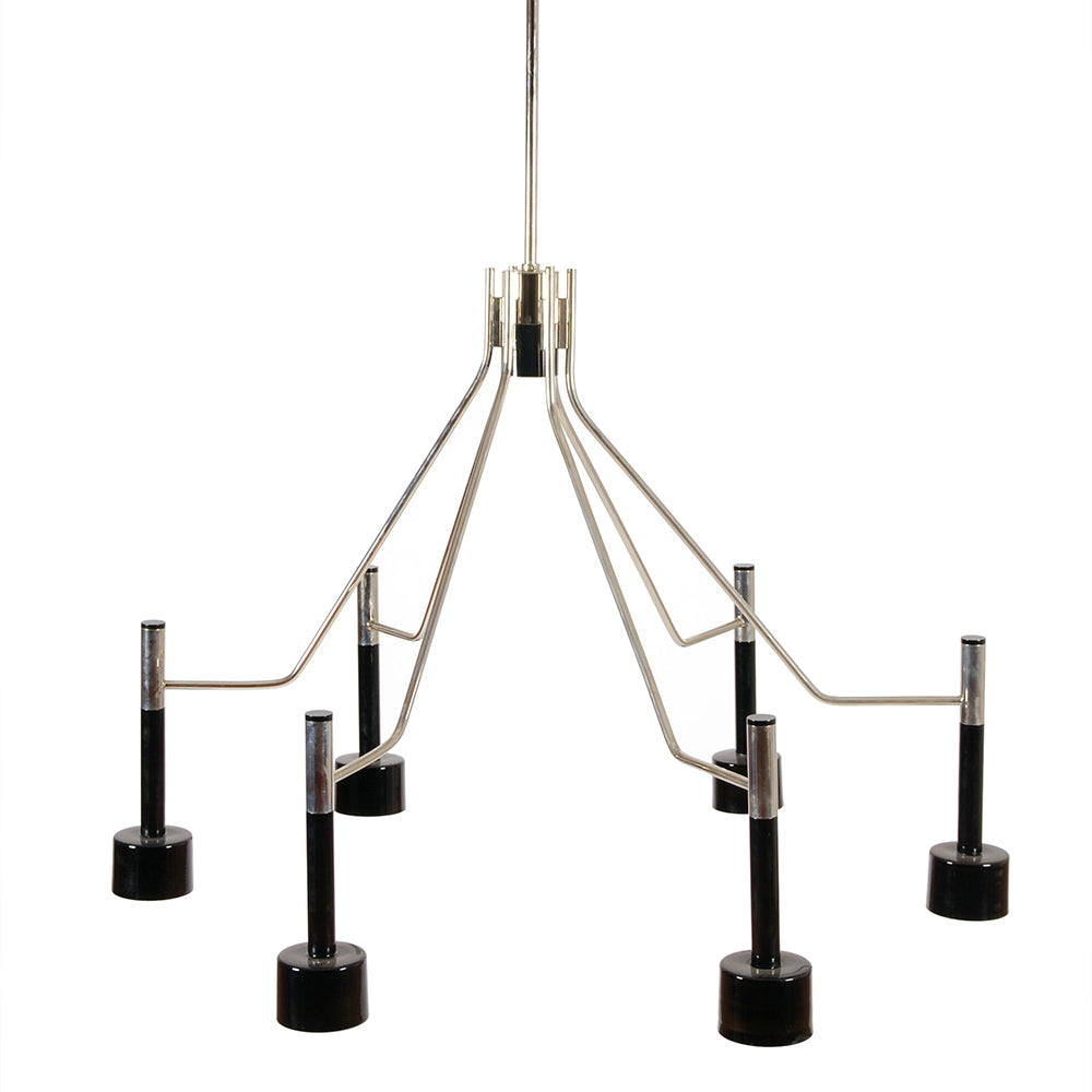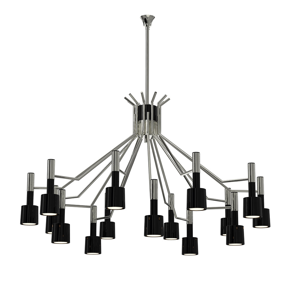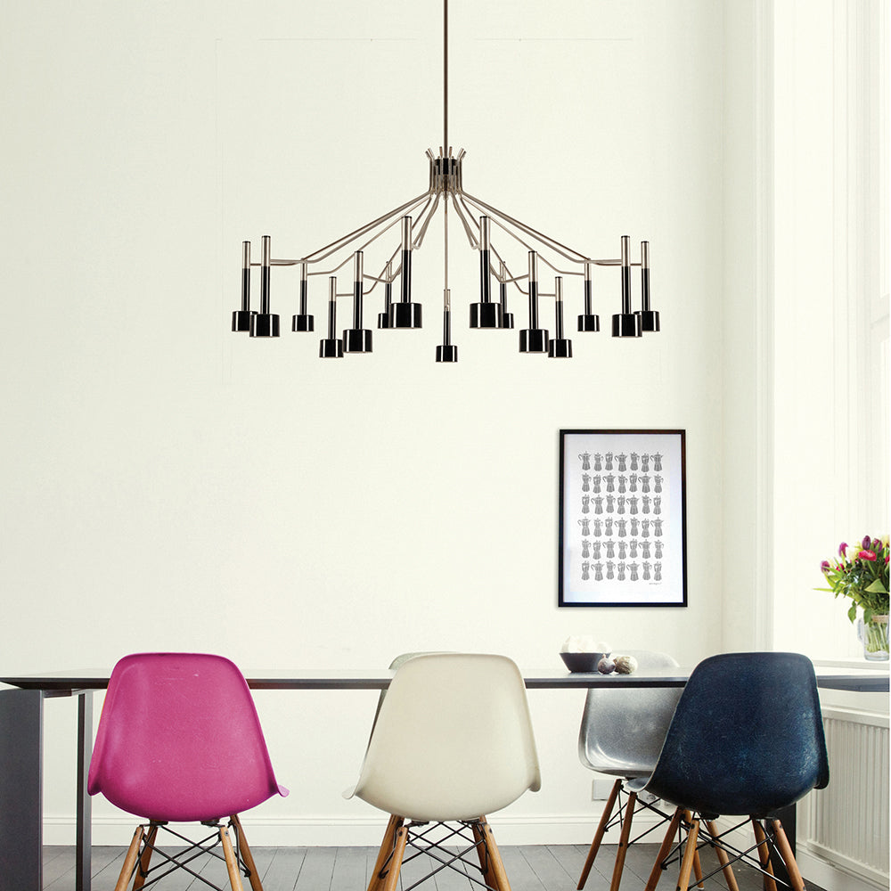 The Ella Suspension Lights evoke the sophisticated style of 1960’s Palm Springs. They are also a tribute to the late Ella Fitzgerald, the Queen of Jazz. The body of the lights is entirely cast in brass with a nickel plated finish and its shades are made in aluminium lacquered in glossy black as a standard. Ella Suspension lights are available in two versions: Ella 6 and Ella 15.