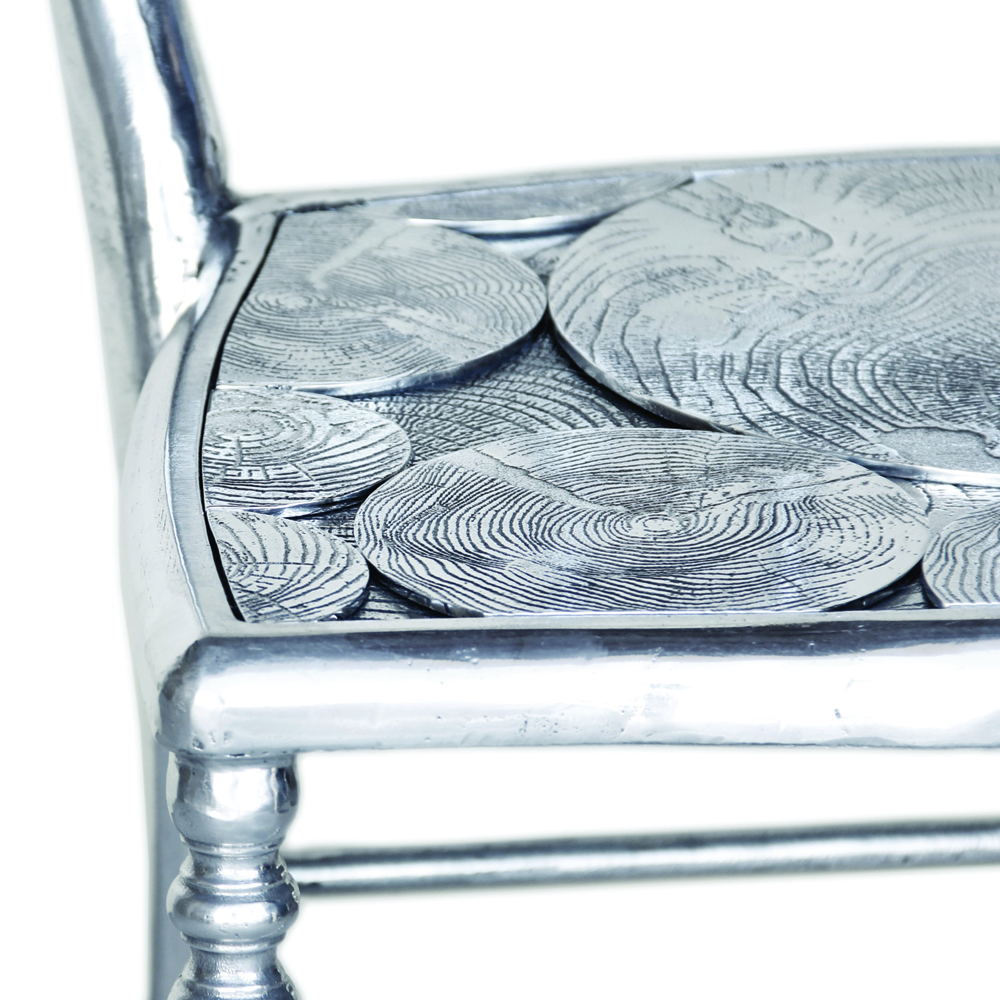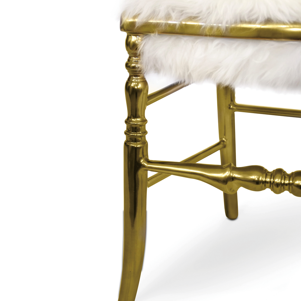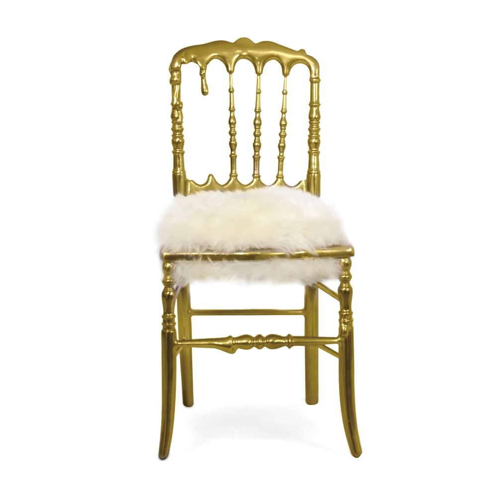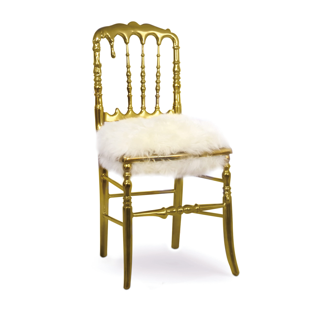 Materials: gold or chrome painting over aluminium casting, upholstery (fur fabric); includes pads on the base to protect the support area