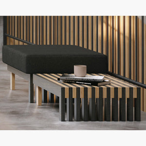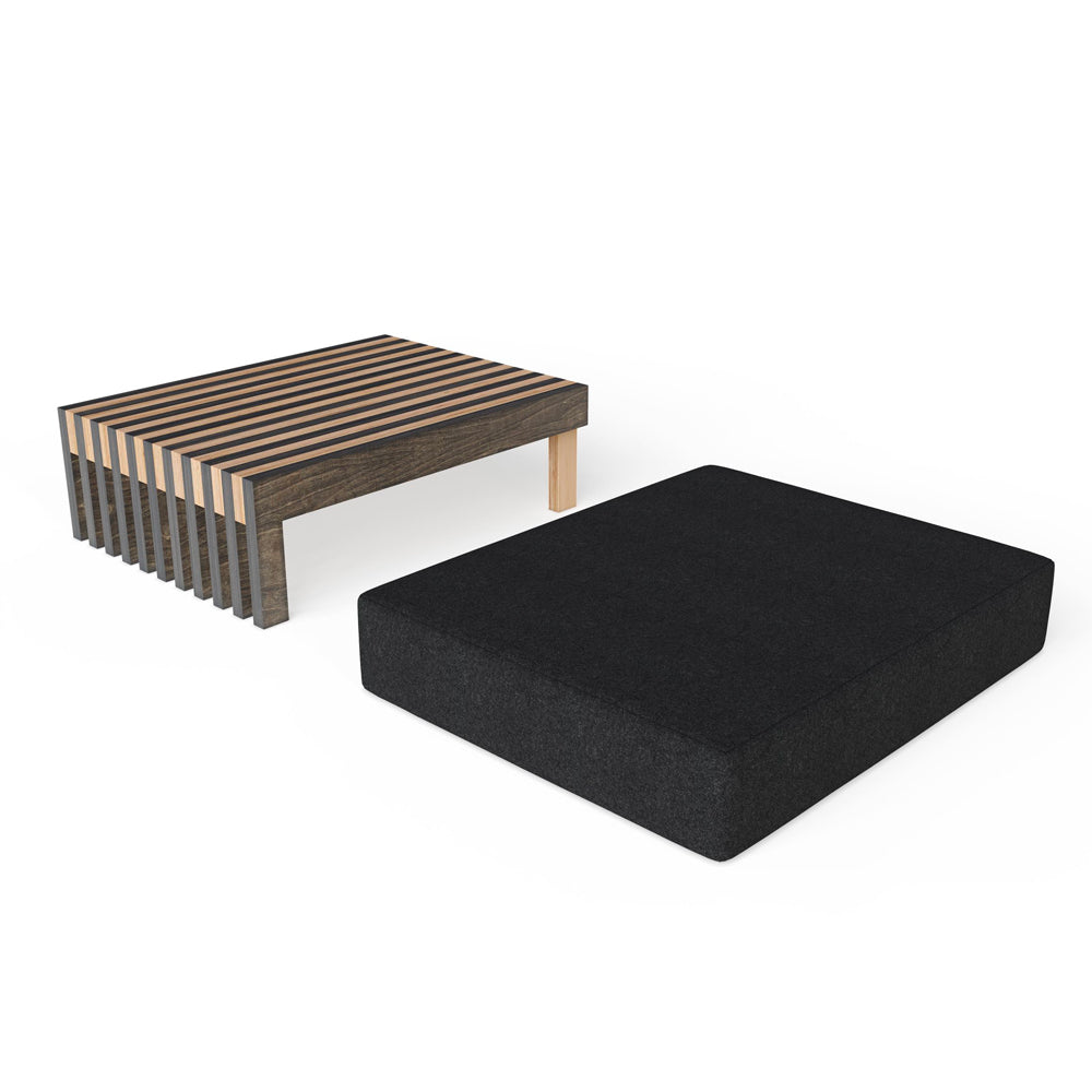 The Eyja Ottoman (Hygge Collection) is a comfortable and distinctive ottoman or pouf. Hygge is in the Danish DNA: a warm feeling of coziness, comfort and safety; qualities which are embodied by this ottoman. The Eyja ottoman has an asymmetrical and eye catching design with clean and crisp lines. The wood contrasts give it a dynamic twist and enhance the shapes, an intrinsic part of Laegnsel's idendity. This ottoman is very versatile with its multifunctional pillow and modular applications.