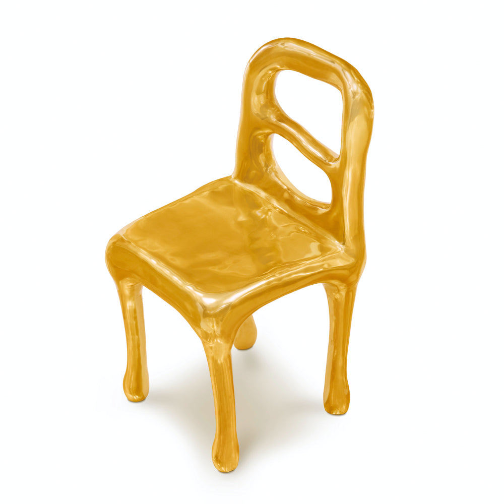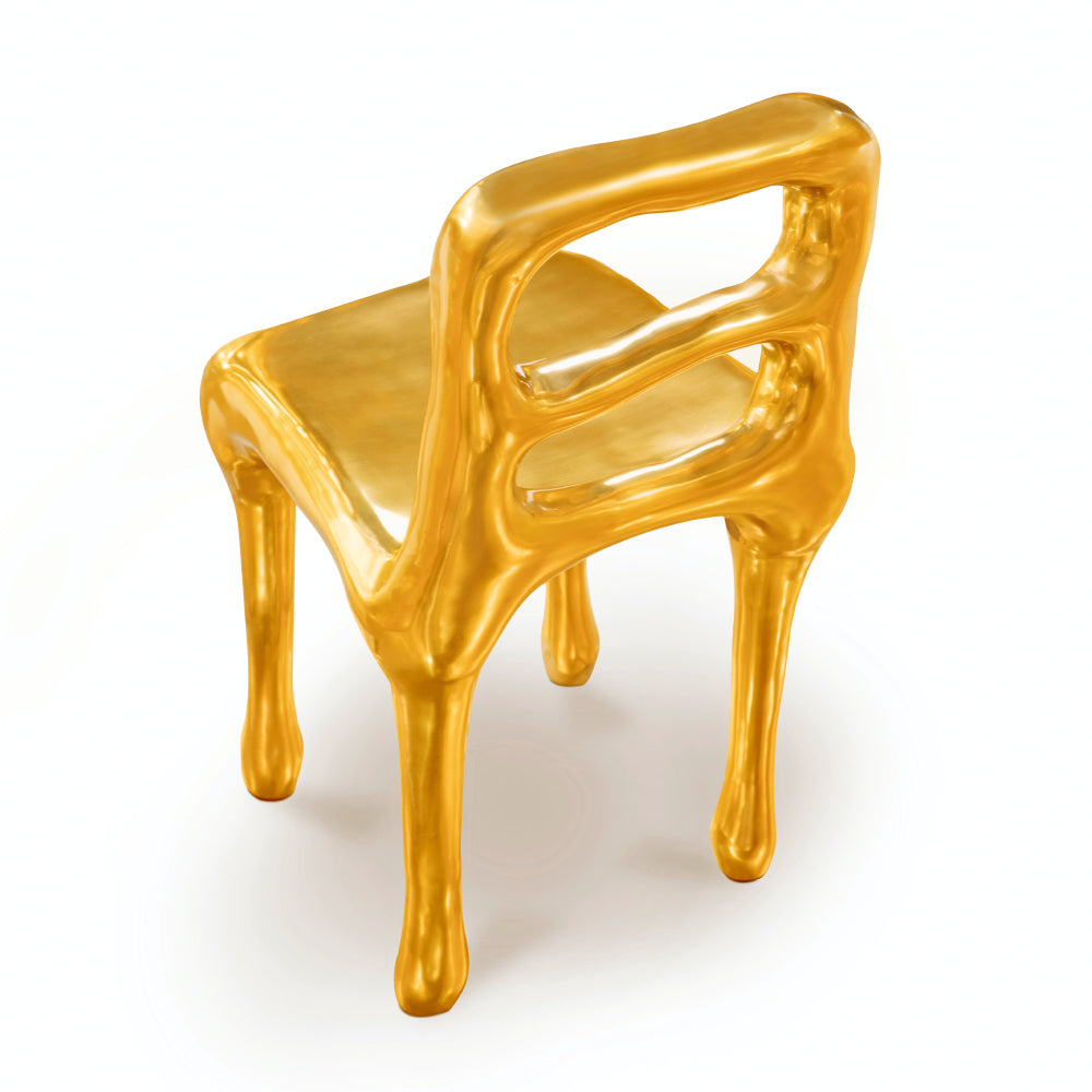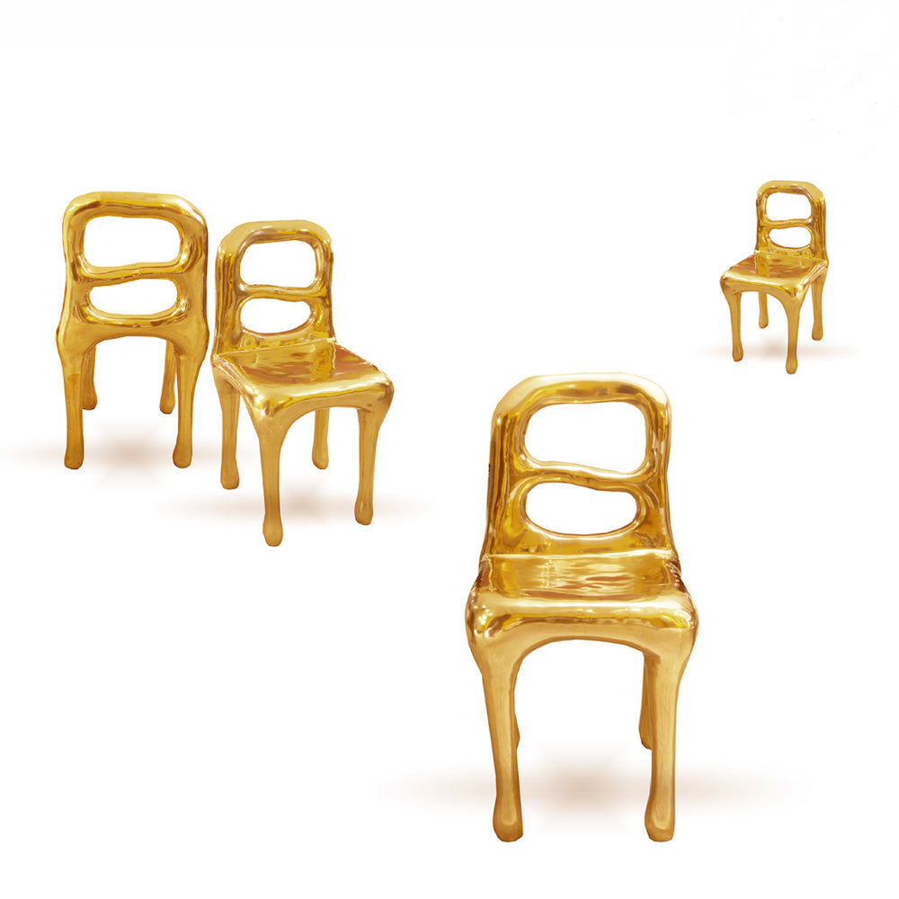The Fools' Gold Rapture Chair is a quirky and luxurious chair. The design of the chair is inspired by the story of 16th century English sailors who mistakenly thought they had discovered gold when they reached Canada. The chair is made entirely in brass with a hand sculpted finish which looks as if it was freshly cast from molten gold. The Rapture Chair is the perfect complement to any of the eleven tables available within the same collection. The Fools' Gold Rapture Chair is available in one only finish.