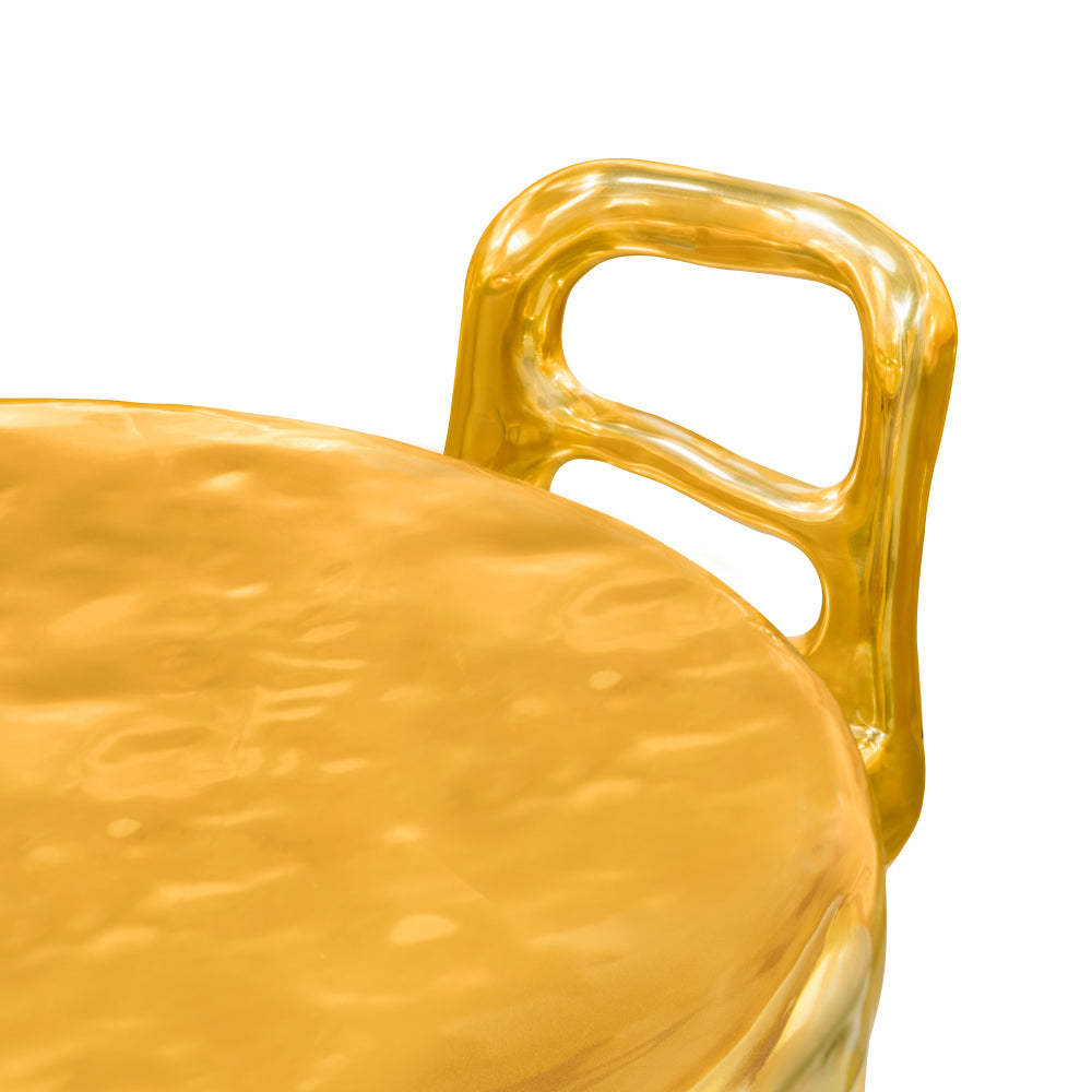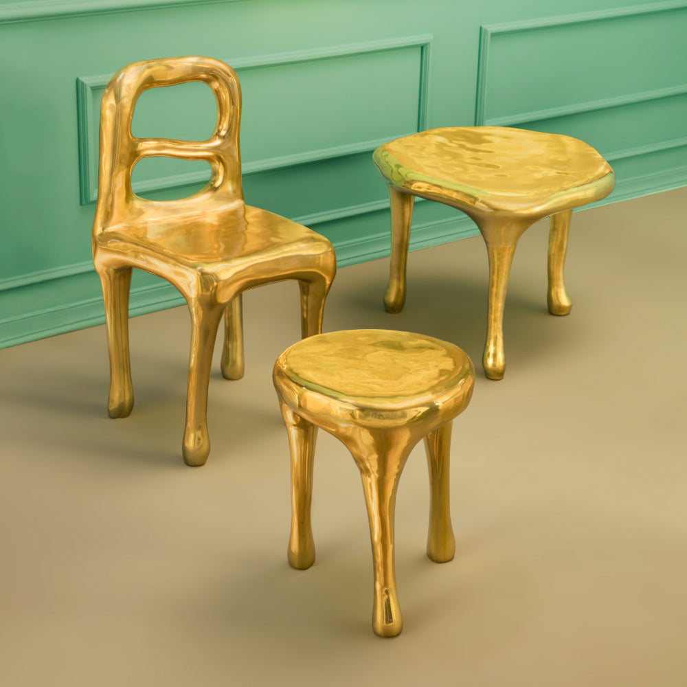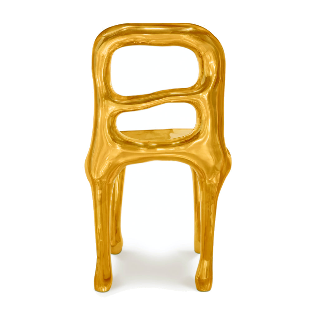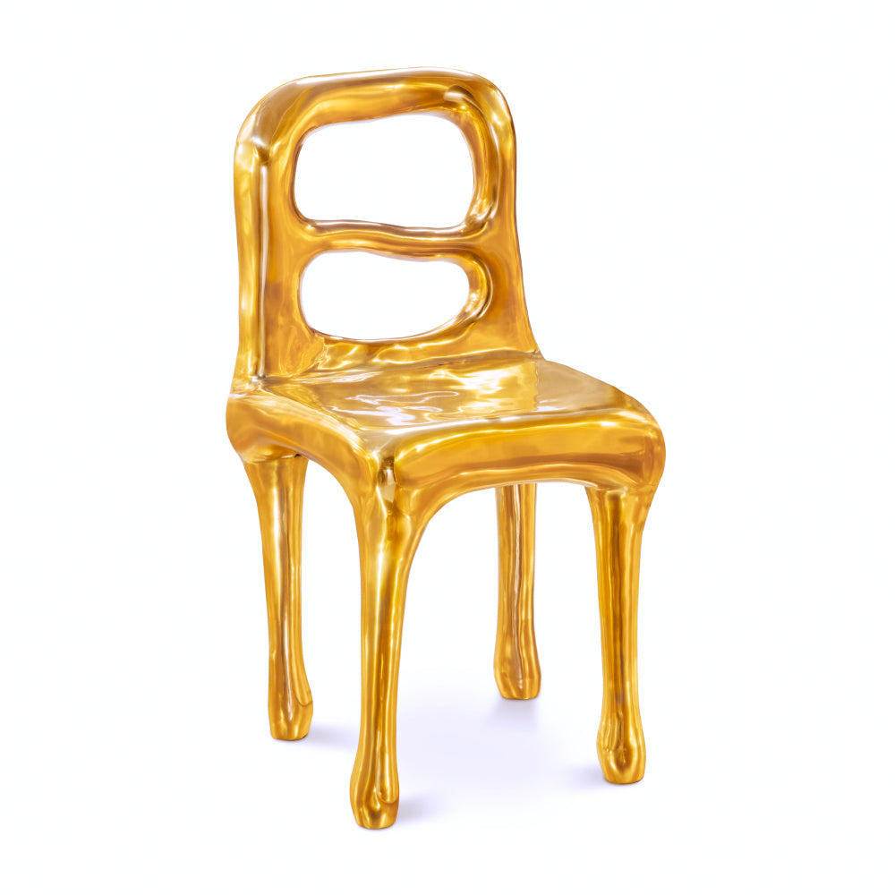 The Fools' Gold Rapture Chair is a quirky and luxurious chair. The design of the chair is inspired by the story of 16th century English sailors who mistakenly thought they had discovered gold when they reached Canada. The chair is made entirely in brass with a hand sculpted finish which looks as if it was freshly cast from molten gold. The Rapture Chair is the perfect complement to any of the eleven tables available within the same collection. The Fools' Gold Rapture Chair is available in one only finish.