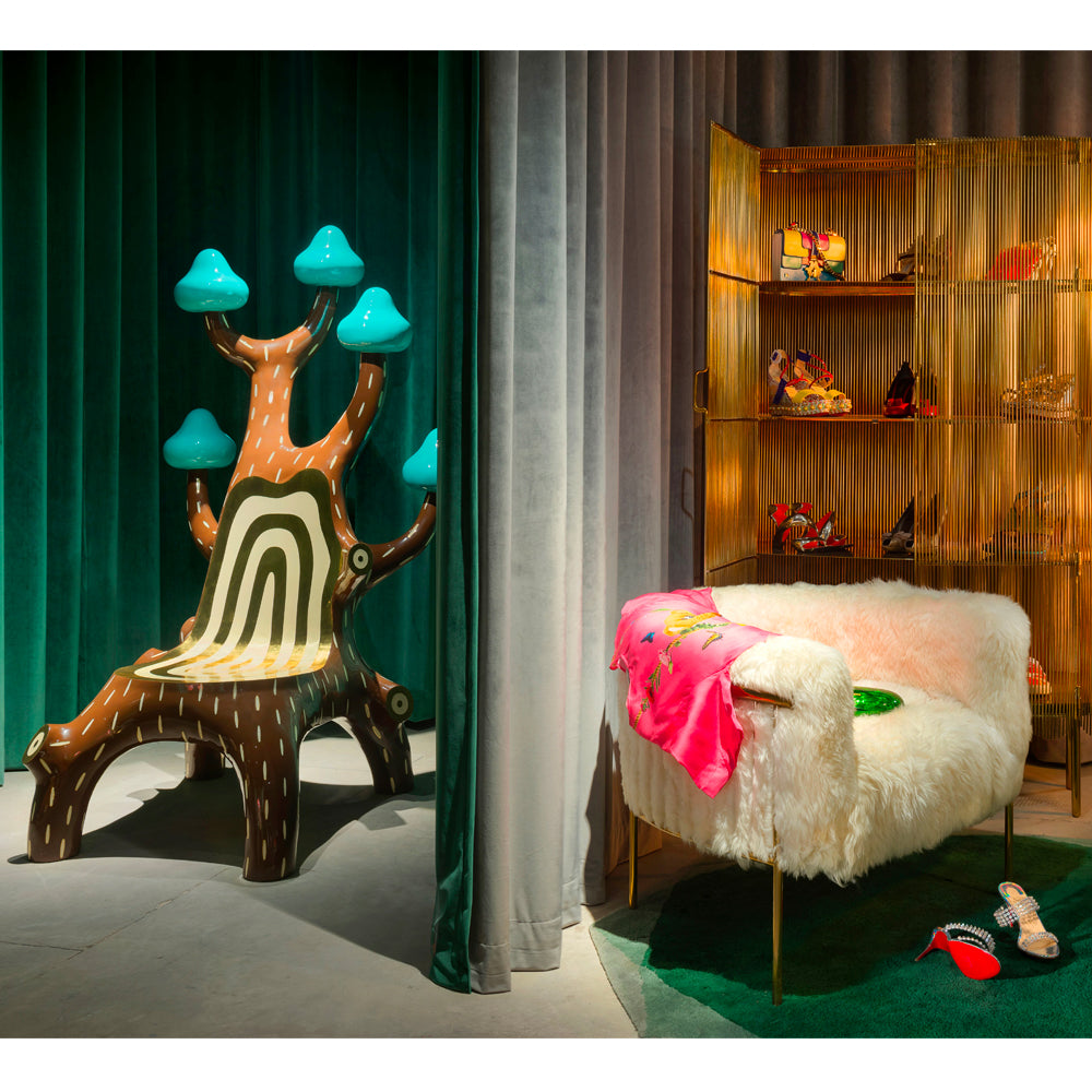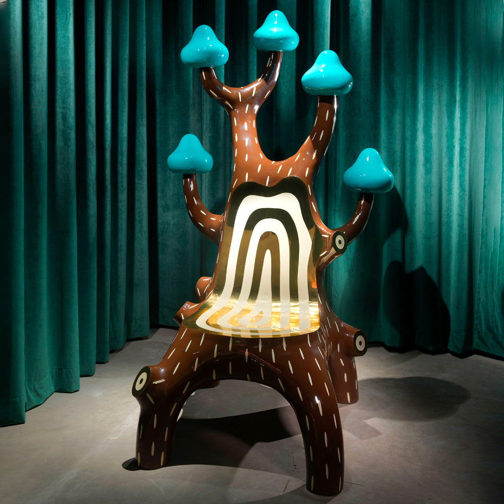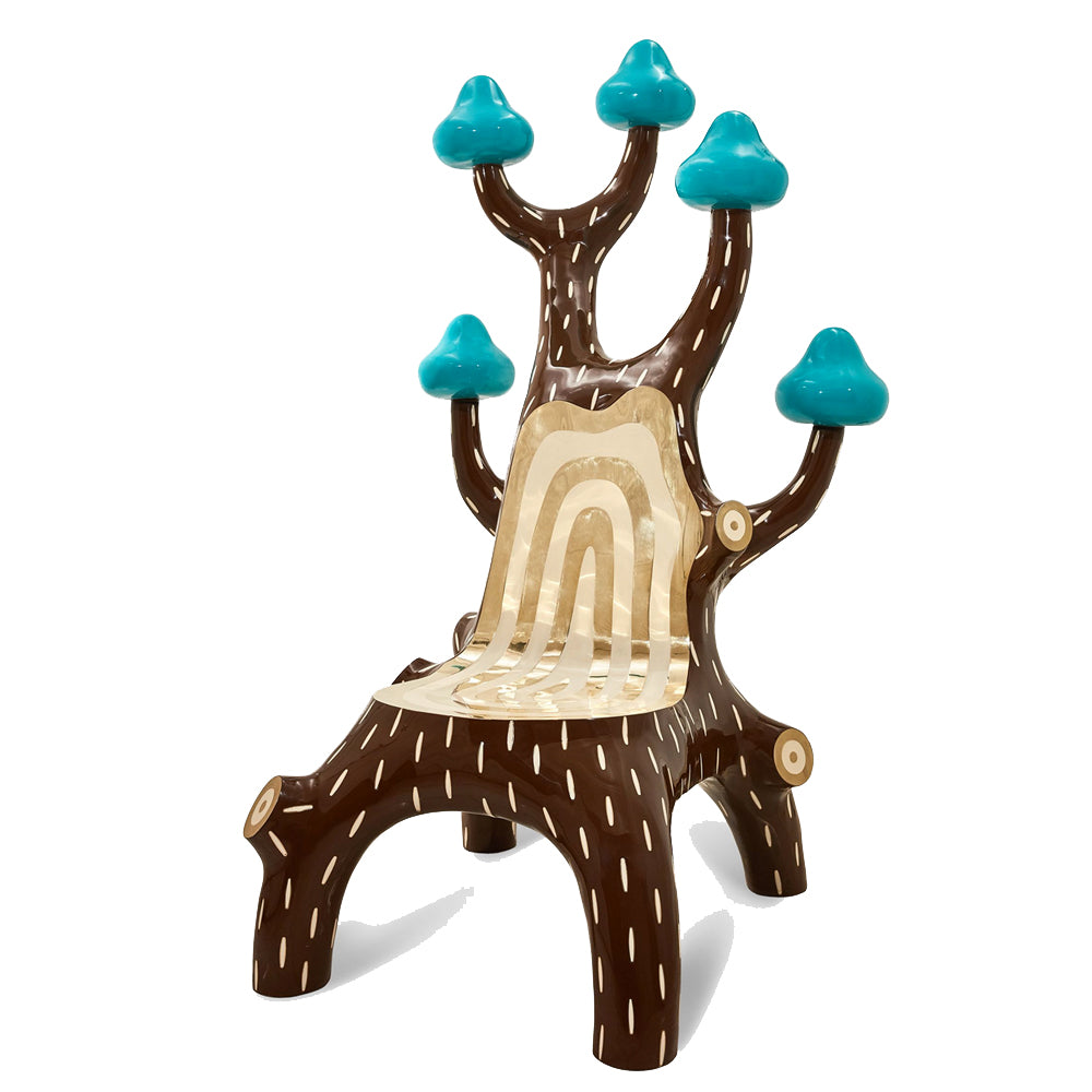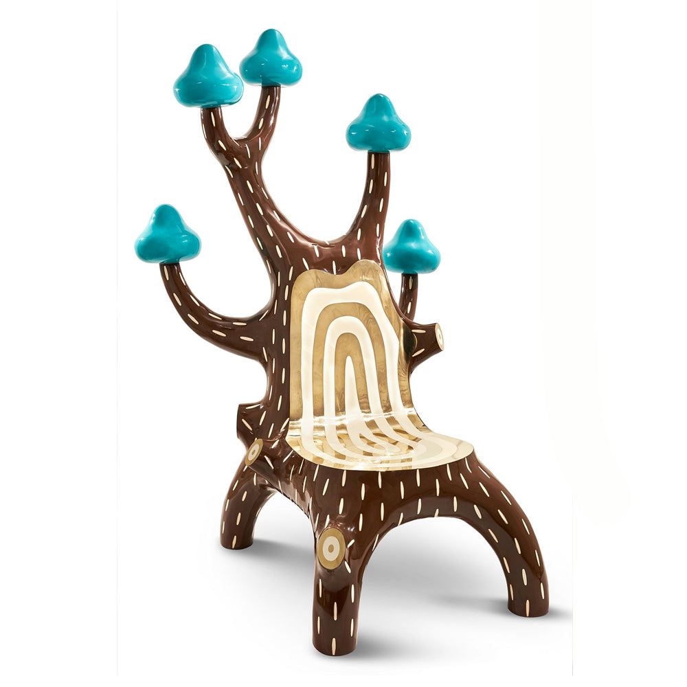 The Forest Chair is a quirky and comfortable lounge chair. The chair is covered with a brass "fur" and it includes some intricate "wood grains" details, topped by a magical tree with its bushy leaves. The Forest Chair is available in one finish only.