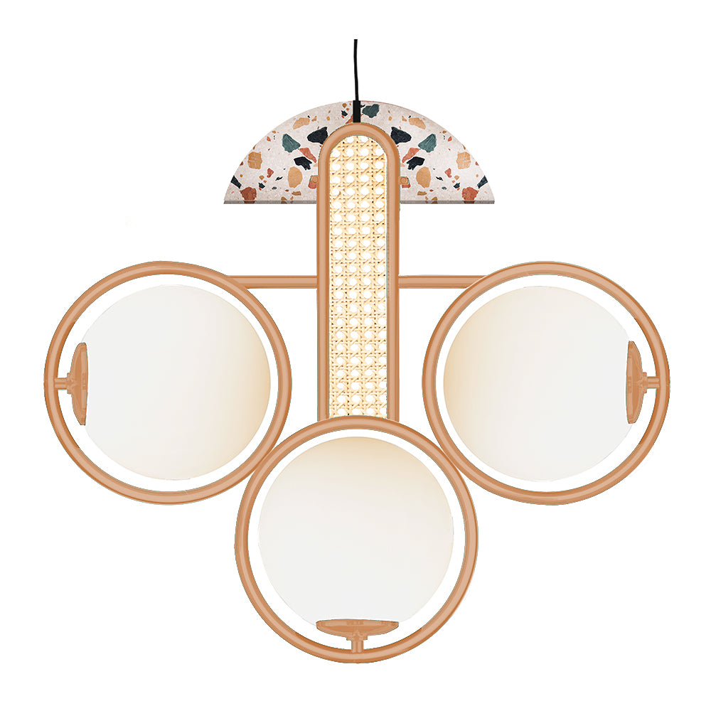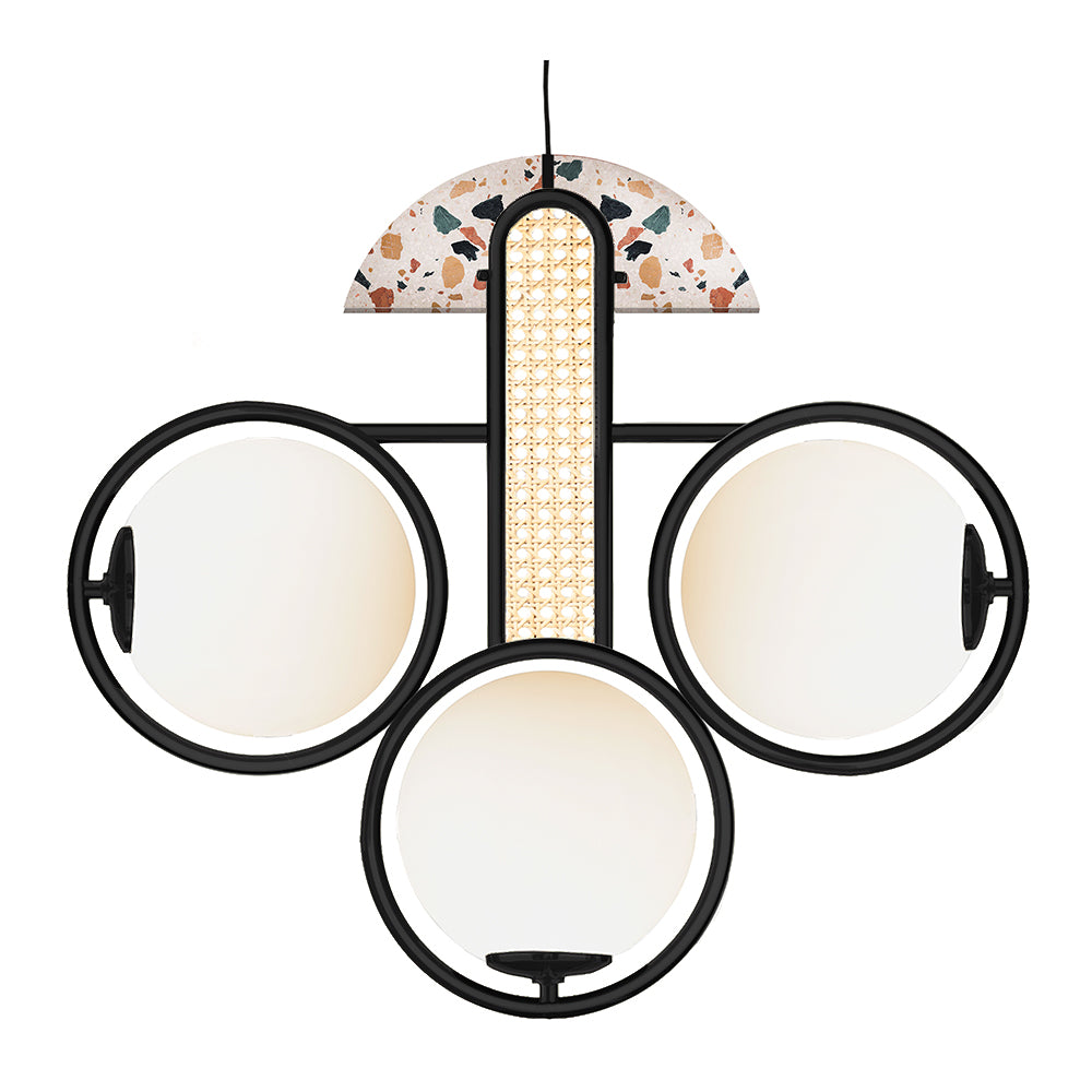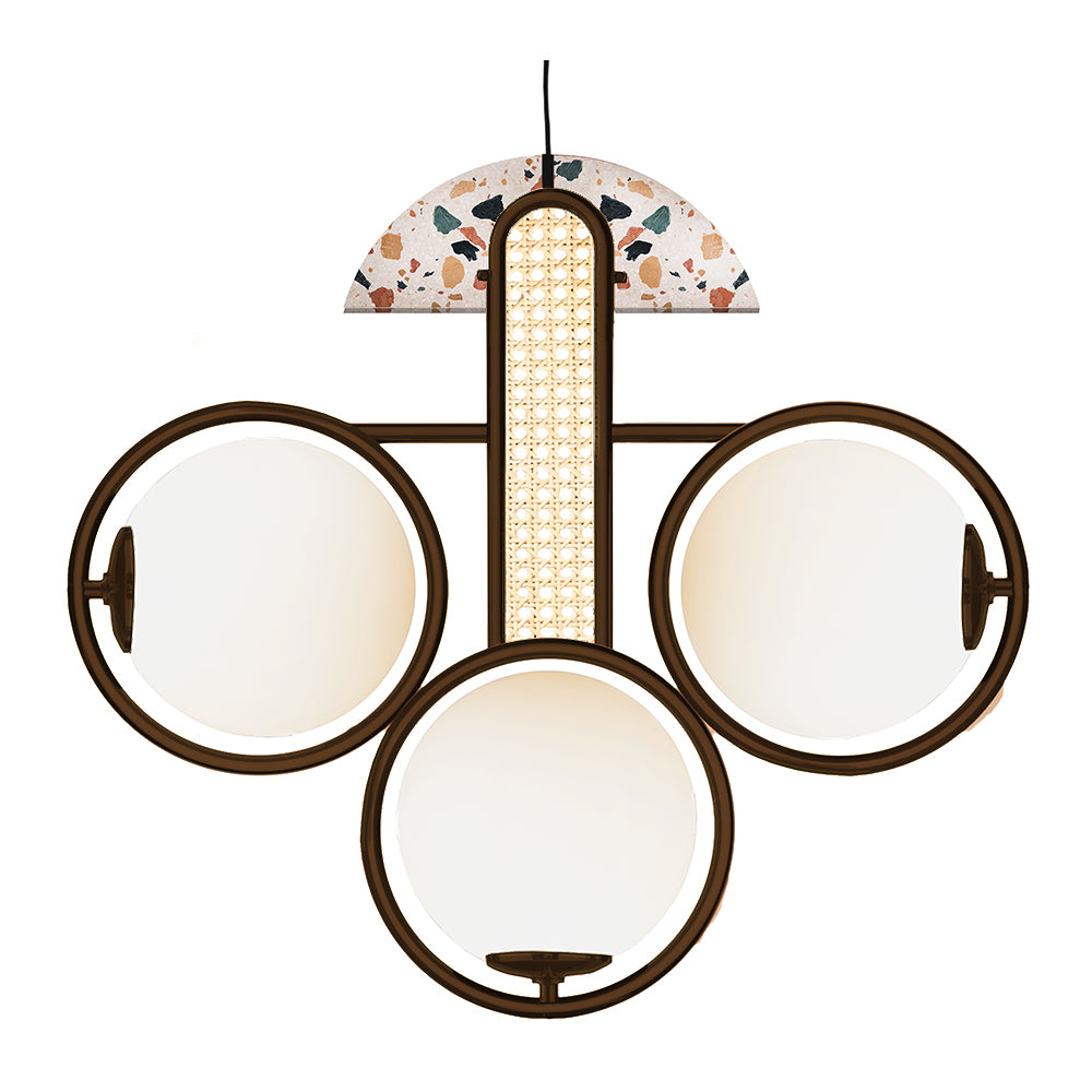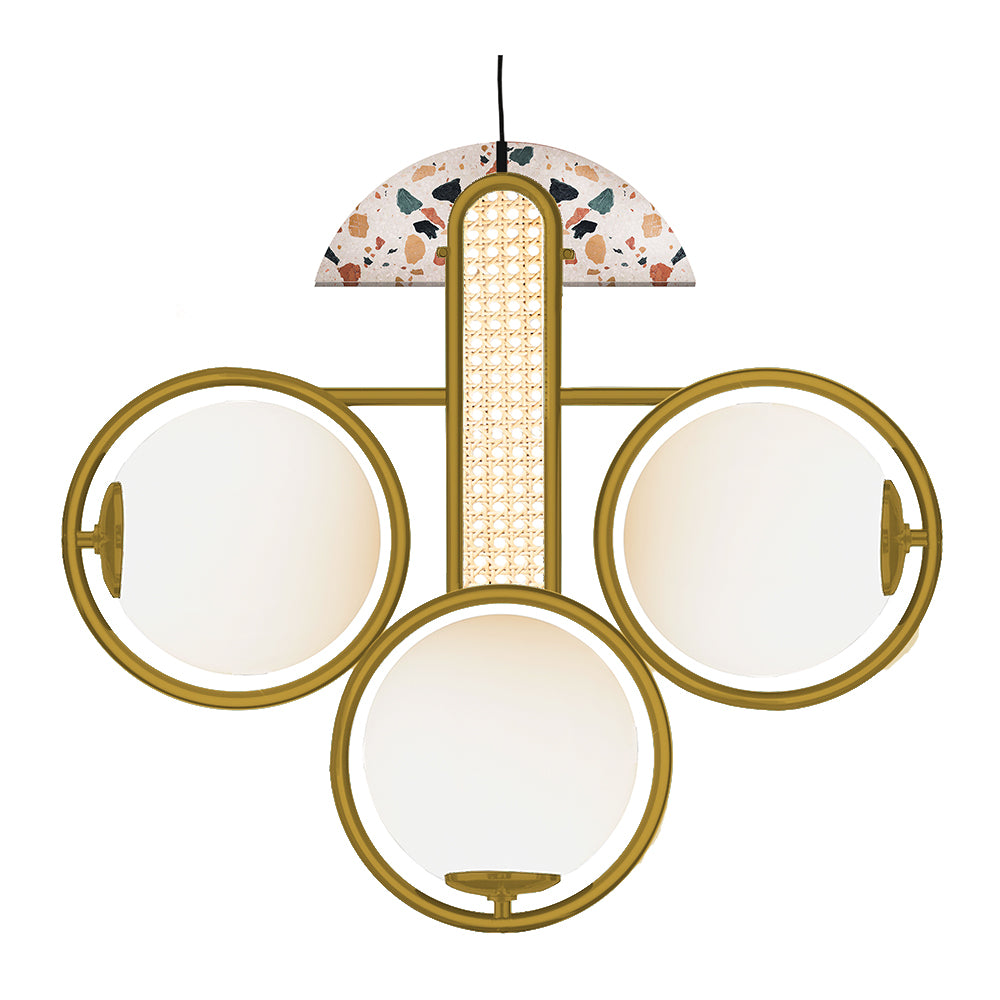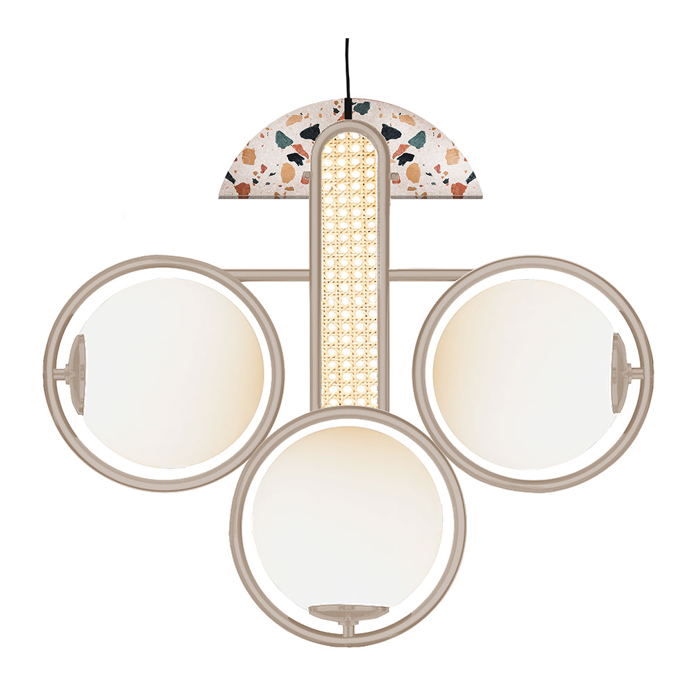 Frame I Suspension Light is a playful and sculptural suspension light featuring a metal structure, with glass spheres encasing lighting elements and some decorative finishes made of both rattan and terrazzo stone, resulting in an abstract shape that resembles an art deco creation.
