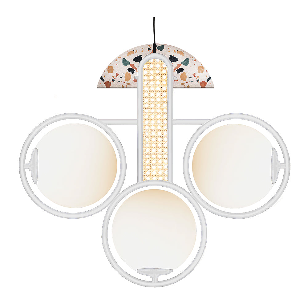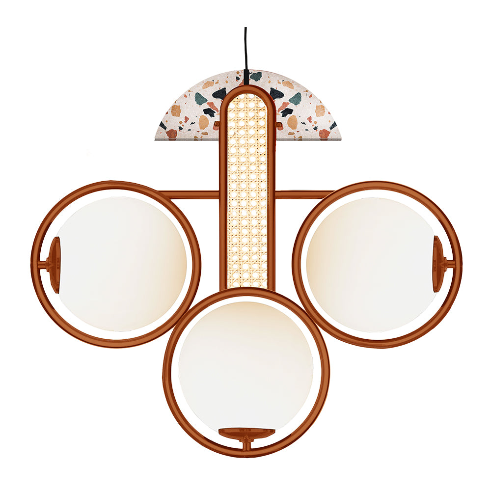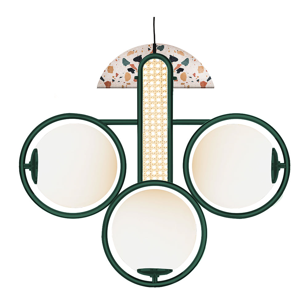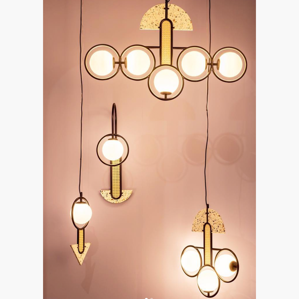Frame I Suspension Light is a playful and sculptural suspension light featuring a metal structure, with glass spheres encasing lighting elements and some decorative finishes made of both rattan and terrazzo stone, resulting in an abstract shape that resembles an art deco creation.