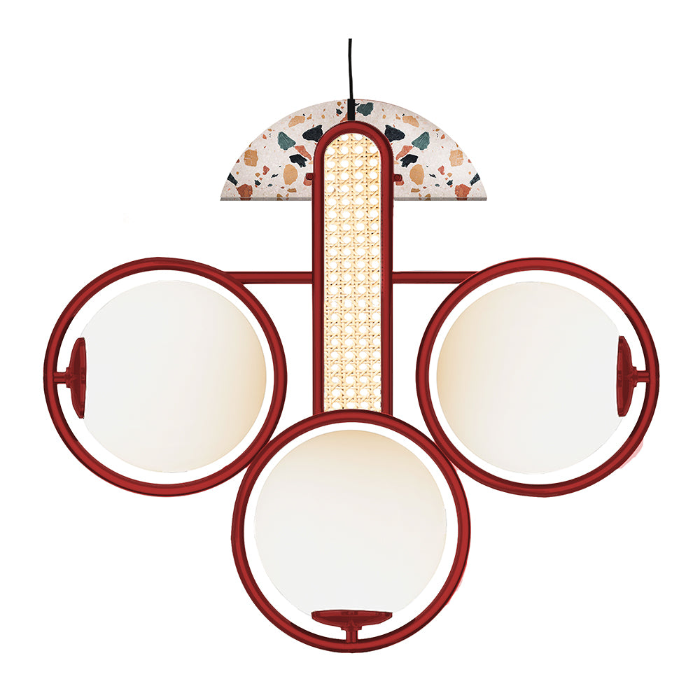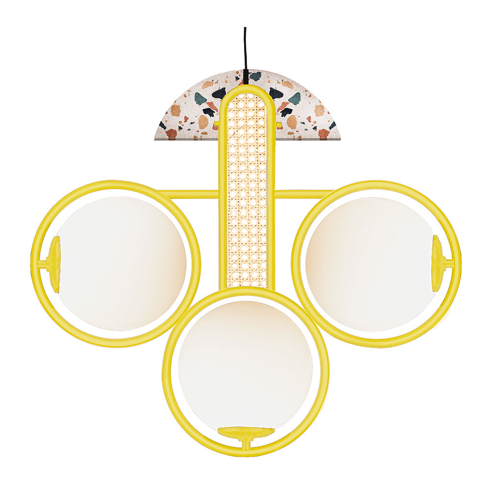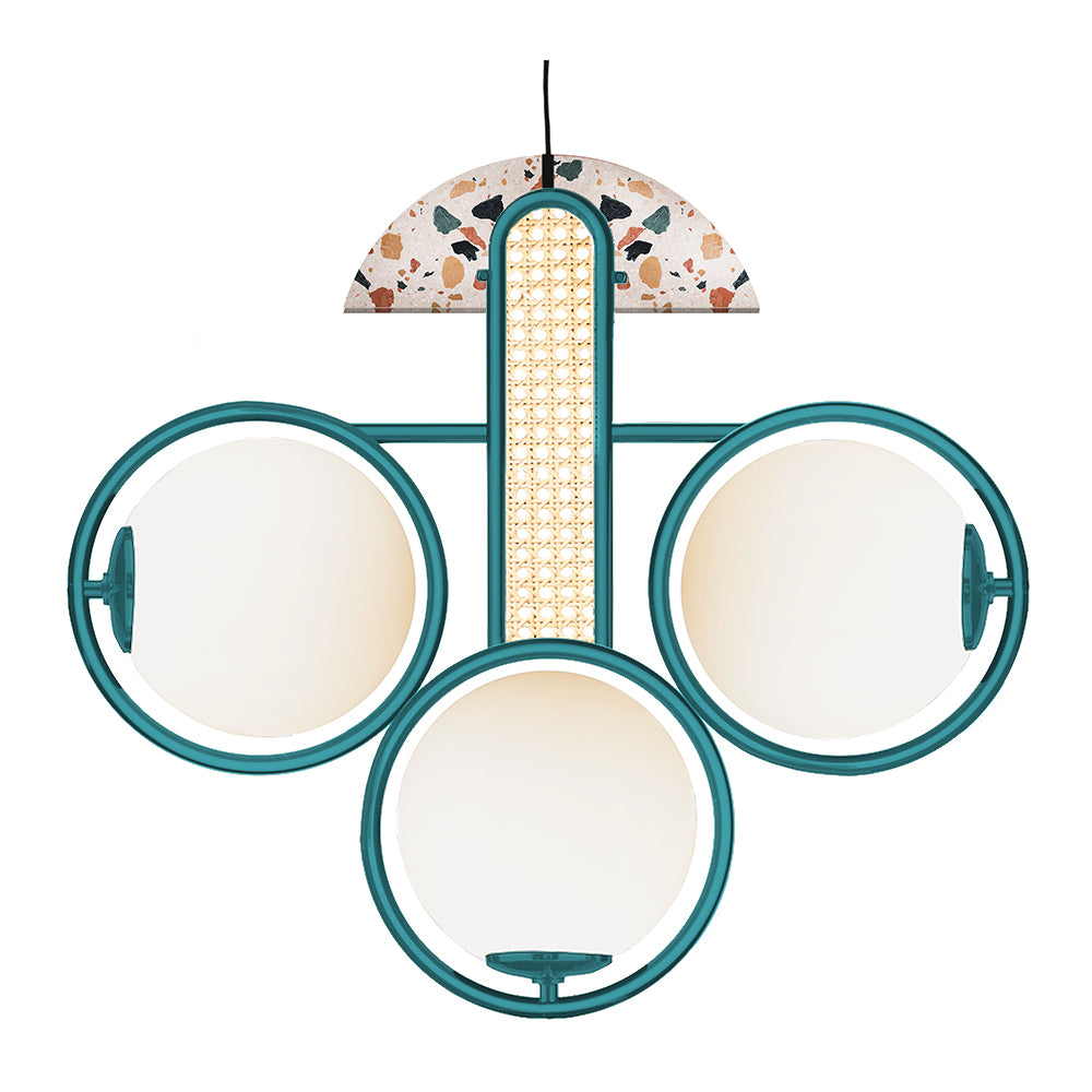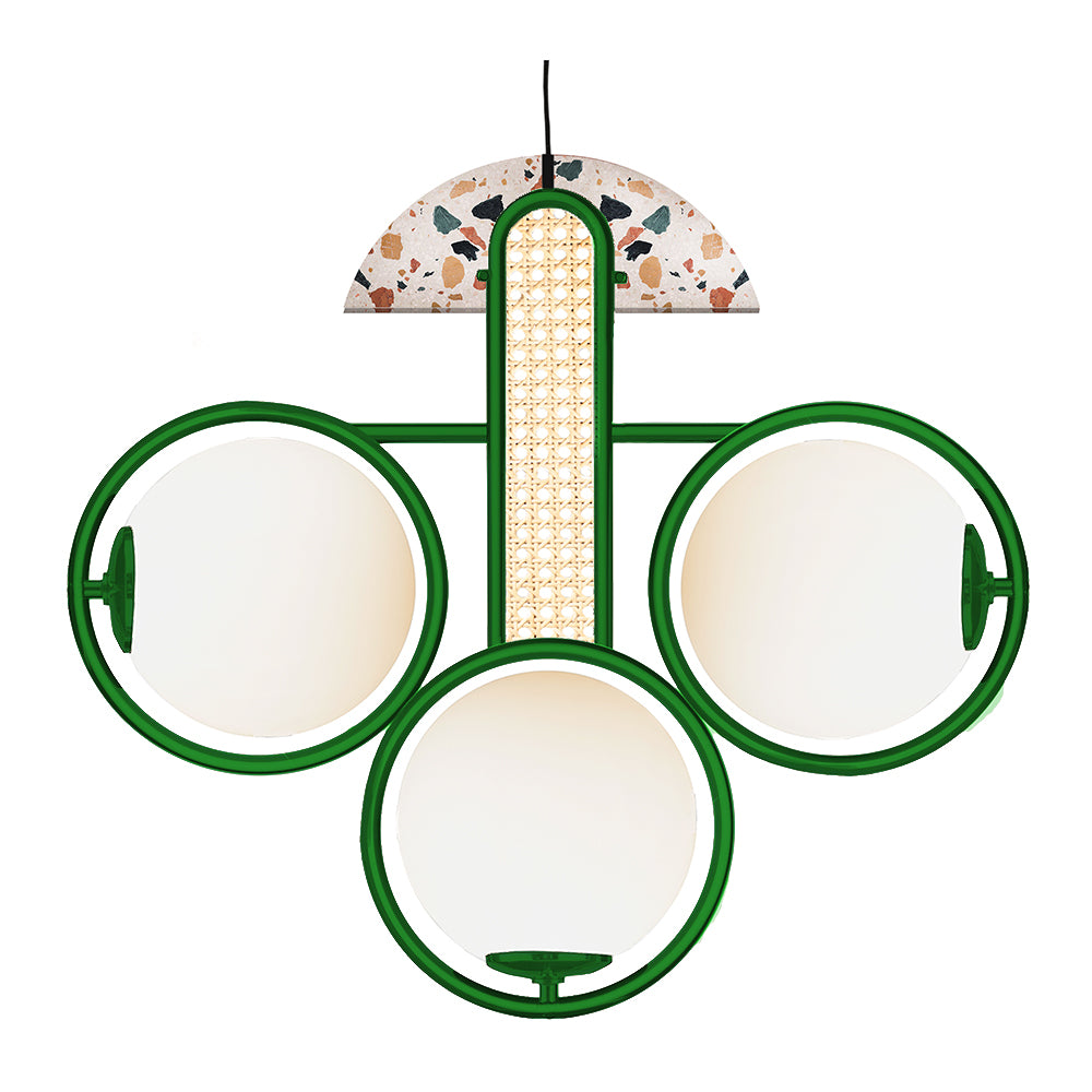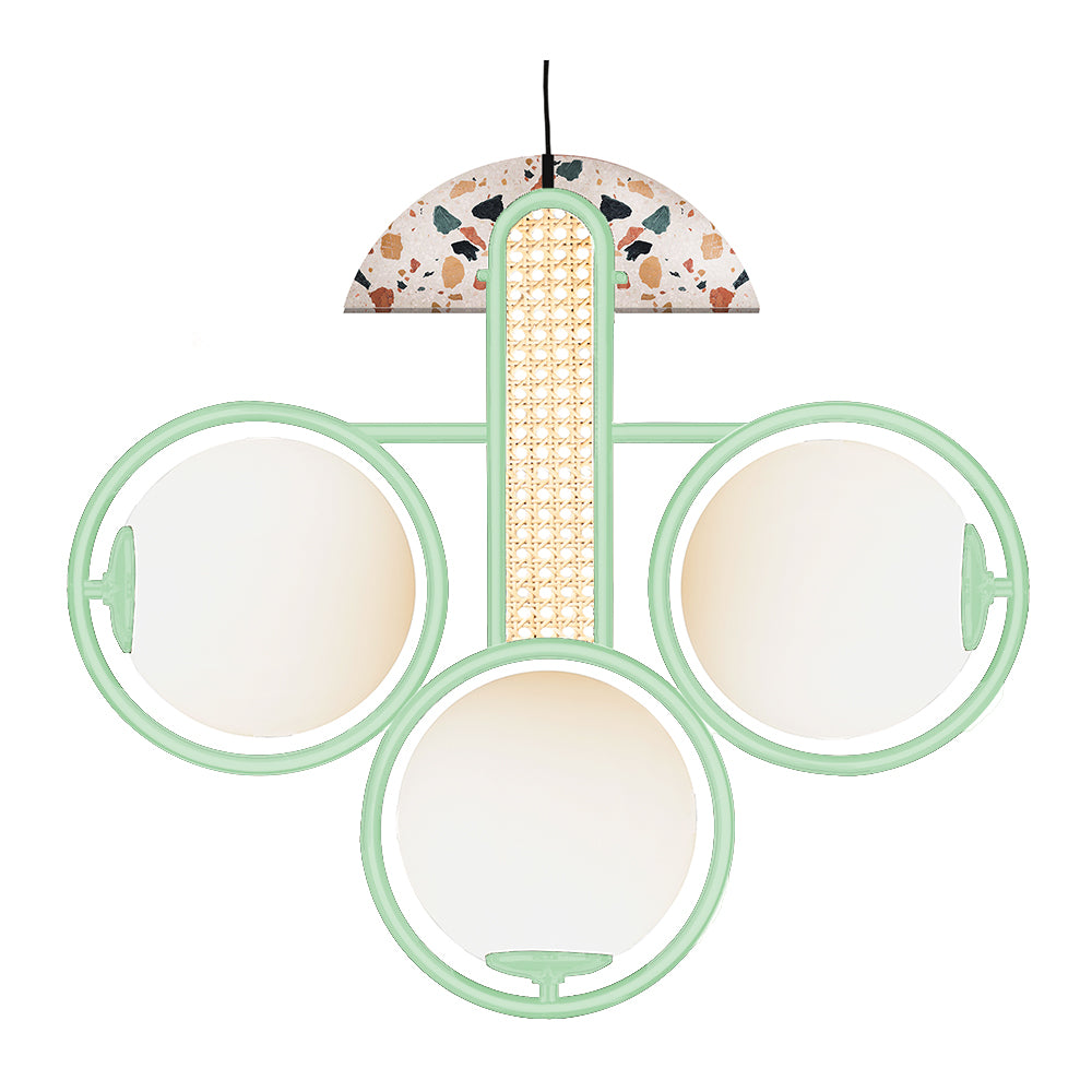 Frame I Suspension Light is a playful and sculptural suspension light featuring a metal structure, with glass spheres encasing lighting elements and some decorative finishes made of both rattan and terrazzo stone, resulting in an abstract shape that resembles an art deco creation.