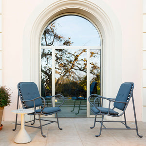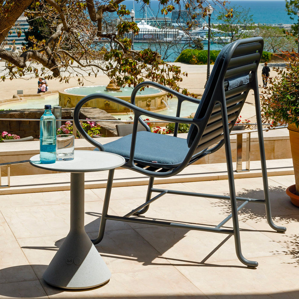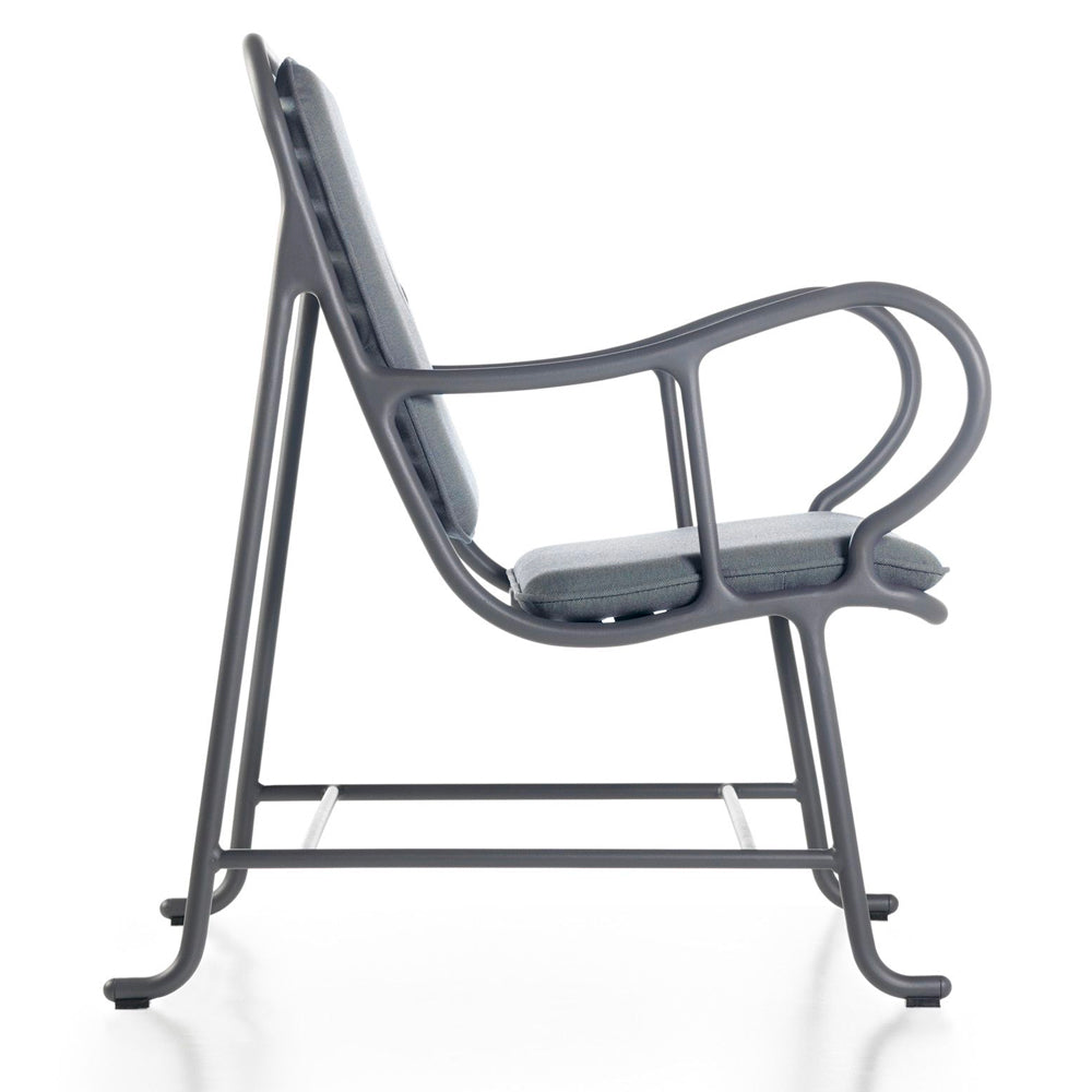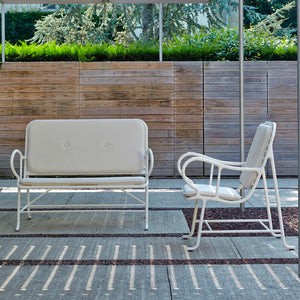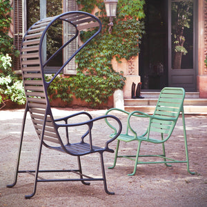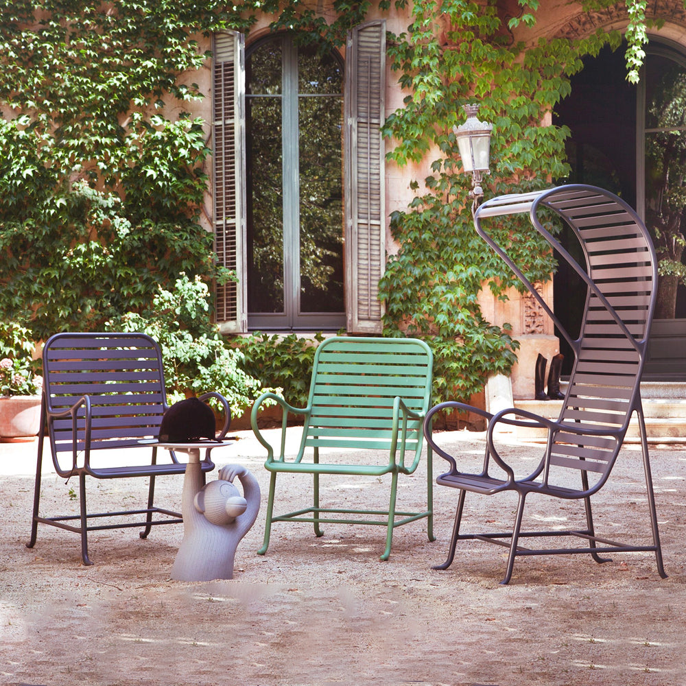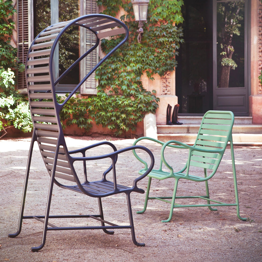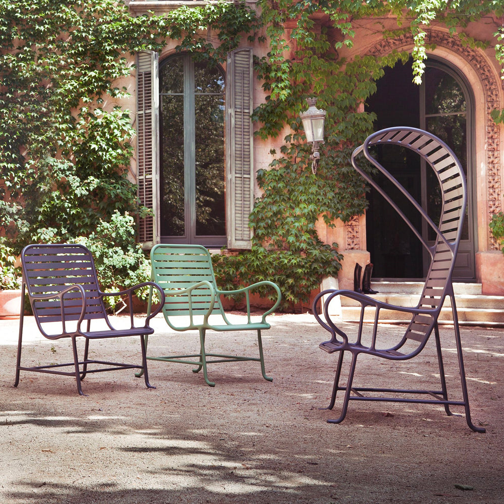 The Gardenias Outdoor Armchair is an elegant and romantic armchair ideal for any outdoor or indoor space. The design of the armchair, especially its curvaceous form and playful feet, is inspired by romantic gardens in the 19th century. The Gardenias Outdoor Armchair is made of extruded and cast aluminium, which makes it light and robust, whilst the addition of cushions (included in the price) adds to the comfort. The armchair is available in 3 finishes: powder-coated white (RAL 9001), green (RAL 6021) or grey (RAL 7015).