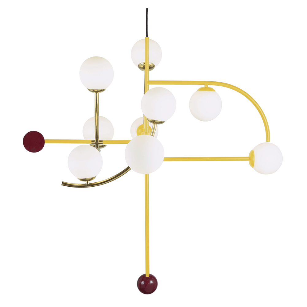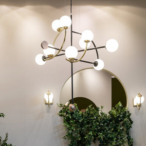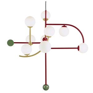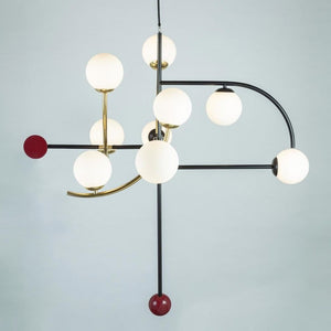 Helio I - Suspension Light is a playful and sculptural suspension light featuring glass spheres with lighting elements as well as decorative wooden half-spheres poised delicately on arc-shaped metal arms, resulting in an abstract shape that resembles a mobile sculpture.