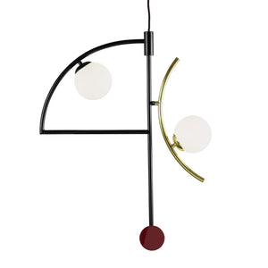 Helio III - Suspension Light is a playful and sculptural suspension light featuring glass spheres with lighting elements as well as decorative wooden half-spheres poised delicately on arc-shaped metal arms, resulting in an abstract shape that resembles a mobile sculpture.