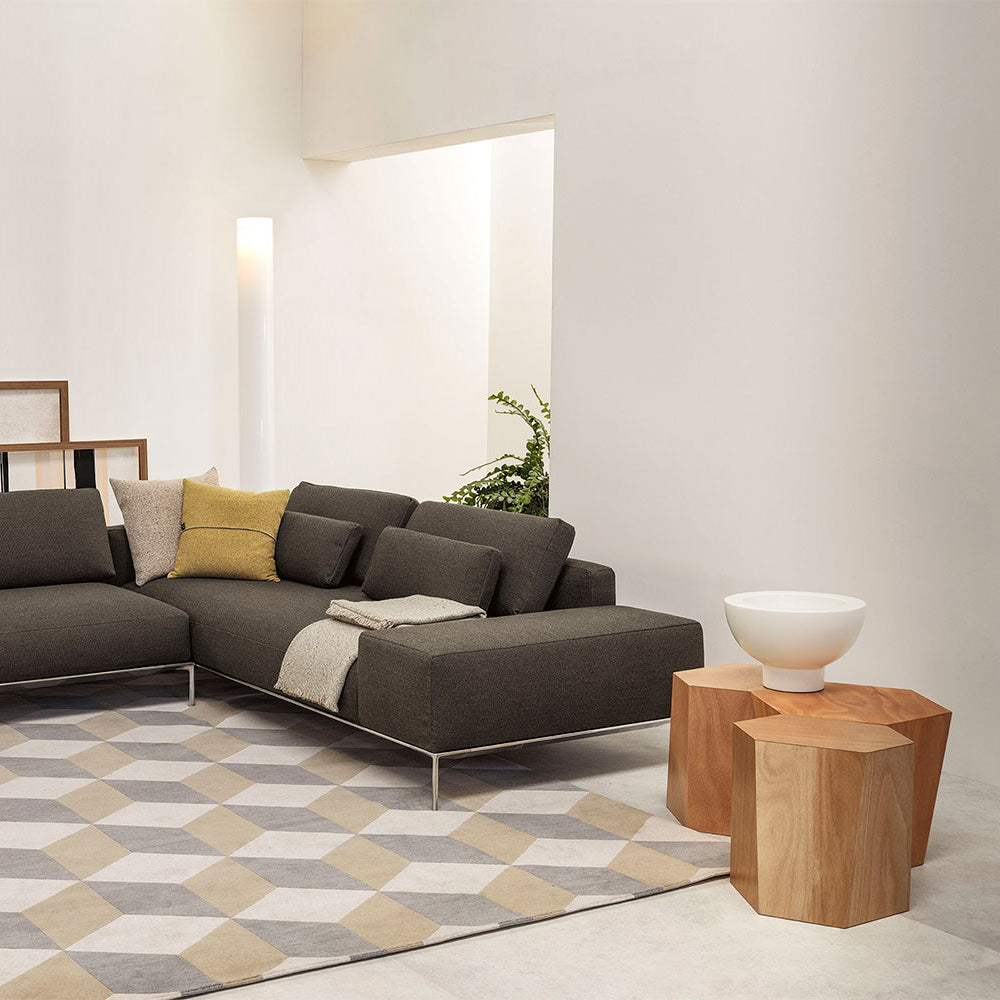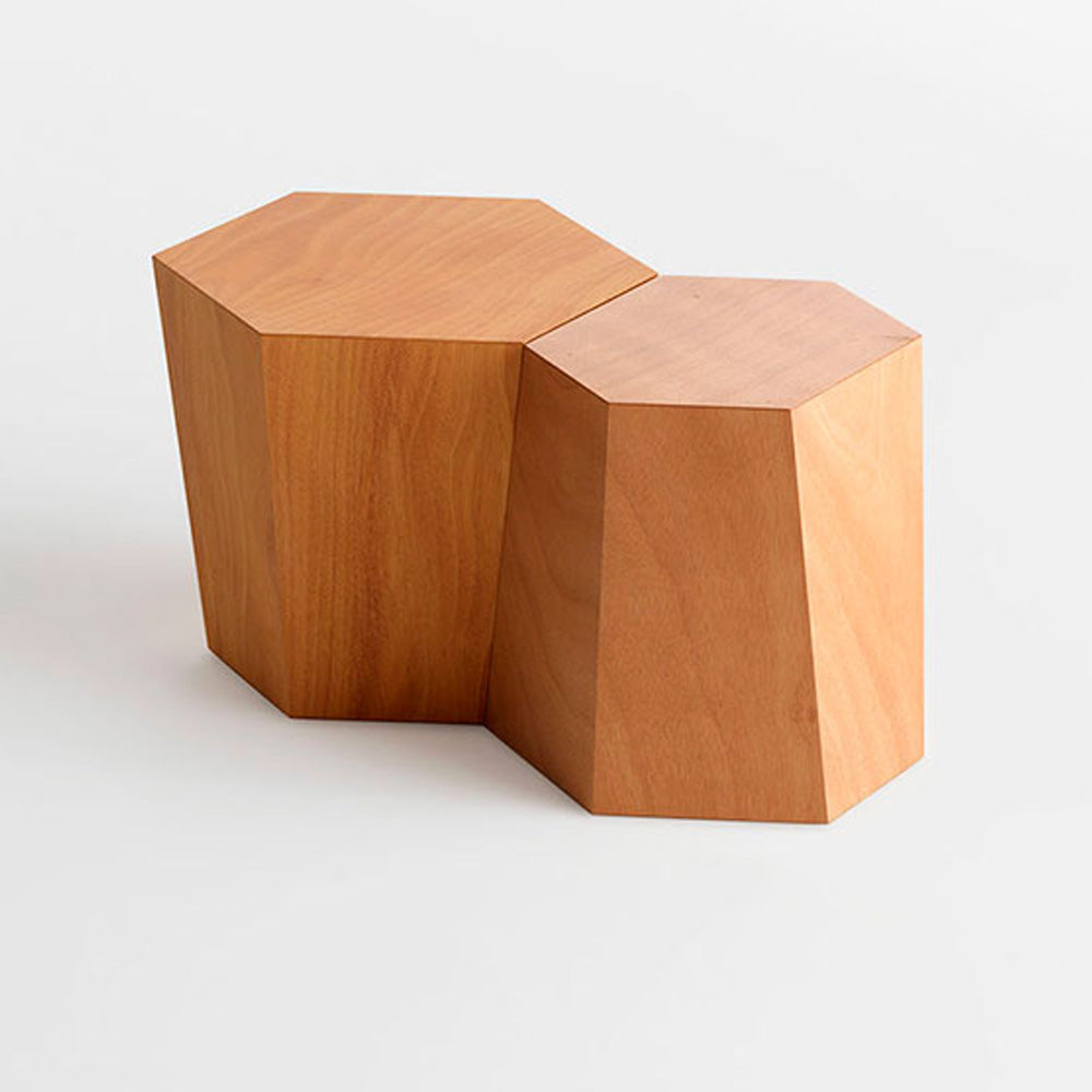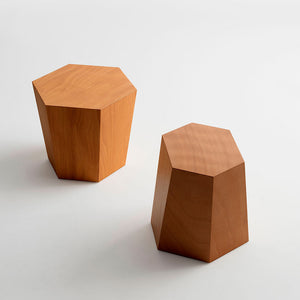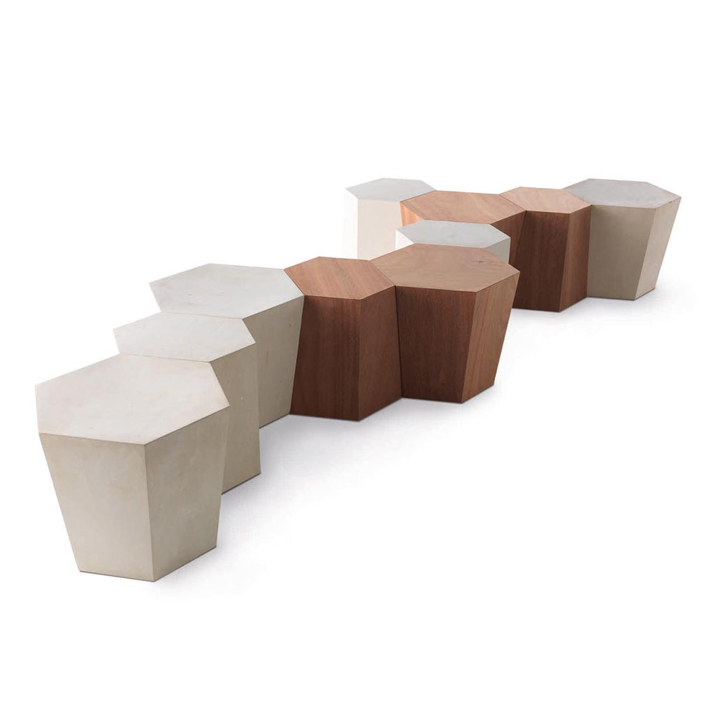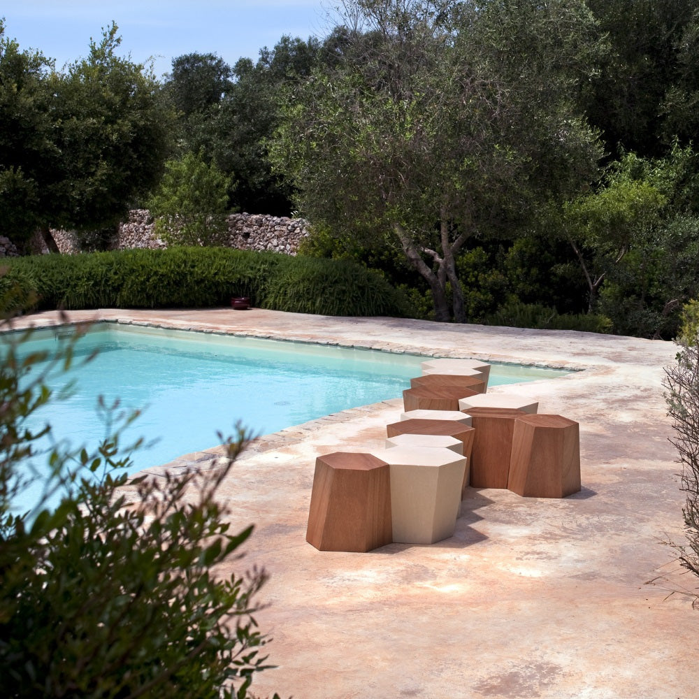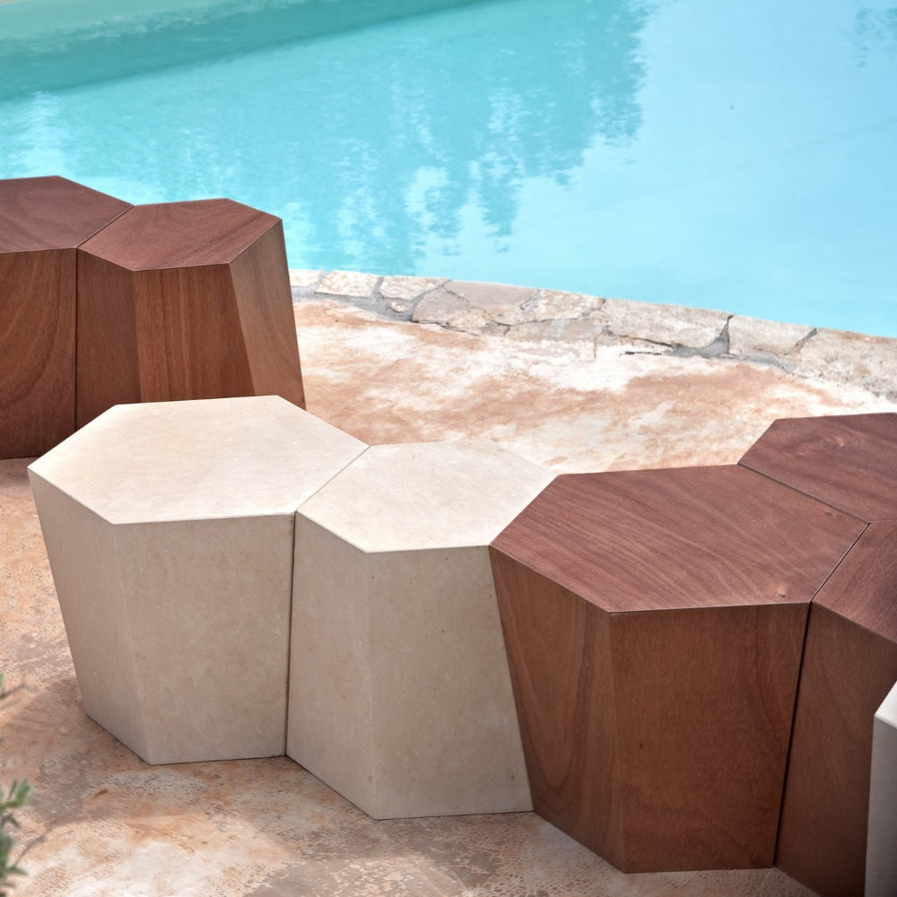 Hexagon can be used as a standalone side table or stool, but it really comes to life when it is used in a group. Hexagon comes in two sizes and the units can be placed upside down. In addition, Hexagon is available in Lecce stone, a limestone typical of the Puglia region in Italy which can withstand most severe weather conditions; or in Okoumè, a wood native to tropical West Africa which can withstand moisture and light rain (although not for prolonged periods). Hexagon units of different sizes, orientation and finishes can be placed together, creating beautiful compositions that resemble natural rock formations.