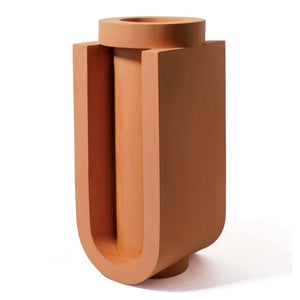 The Inpli Vase is a highly sculptural work of art. The design of the vase is inspired by a combination of traditional Japanese basket weaving and ancient Greek vases. It is in the shape of a tube surrounded by a leaf-like envelope, which also acts as a pair of highly stylised handles.
