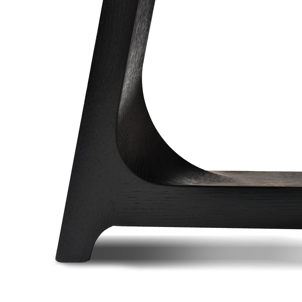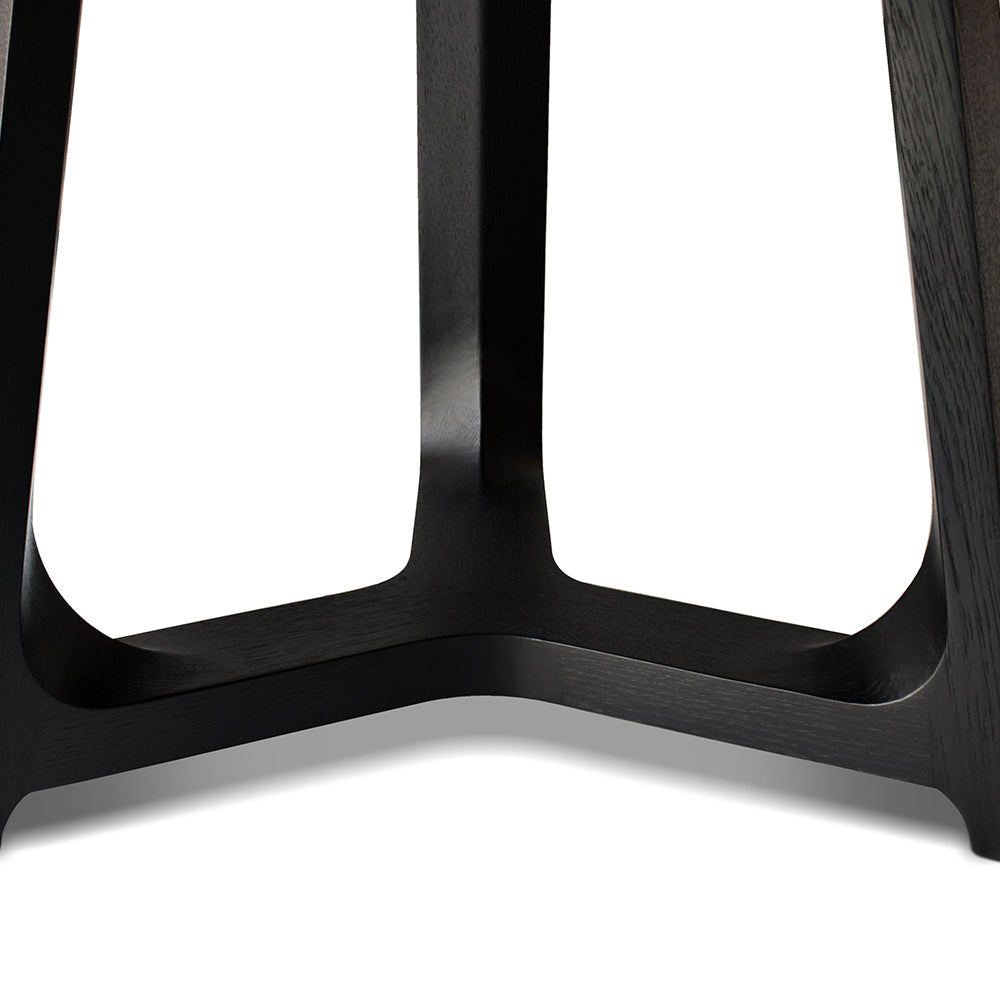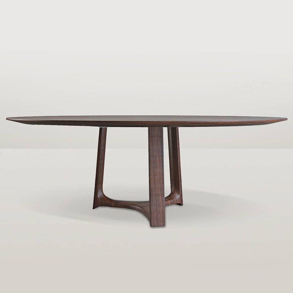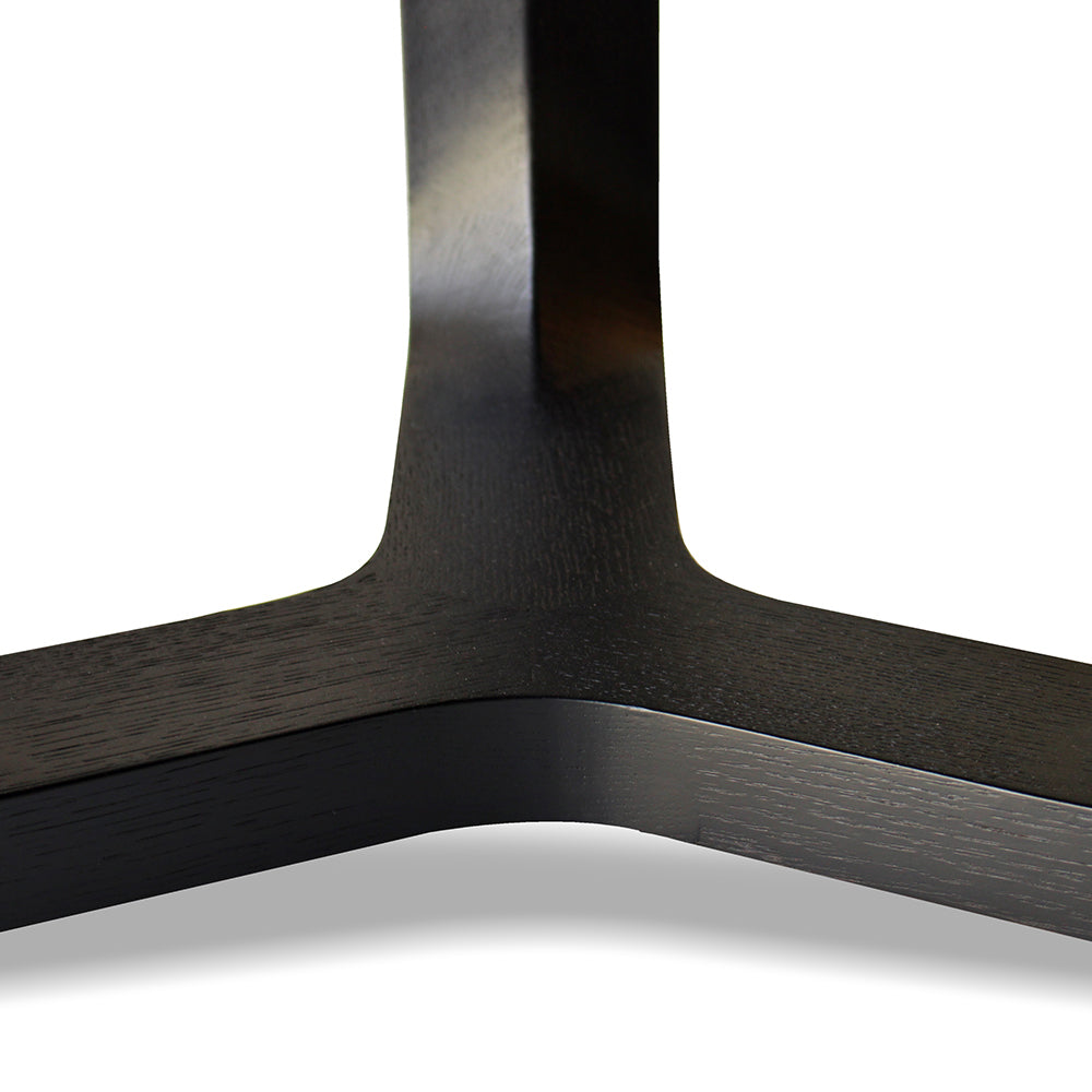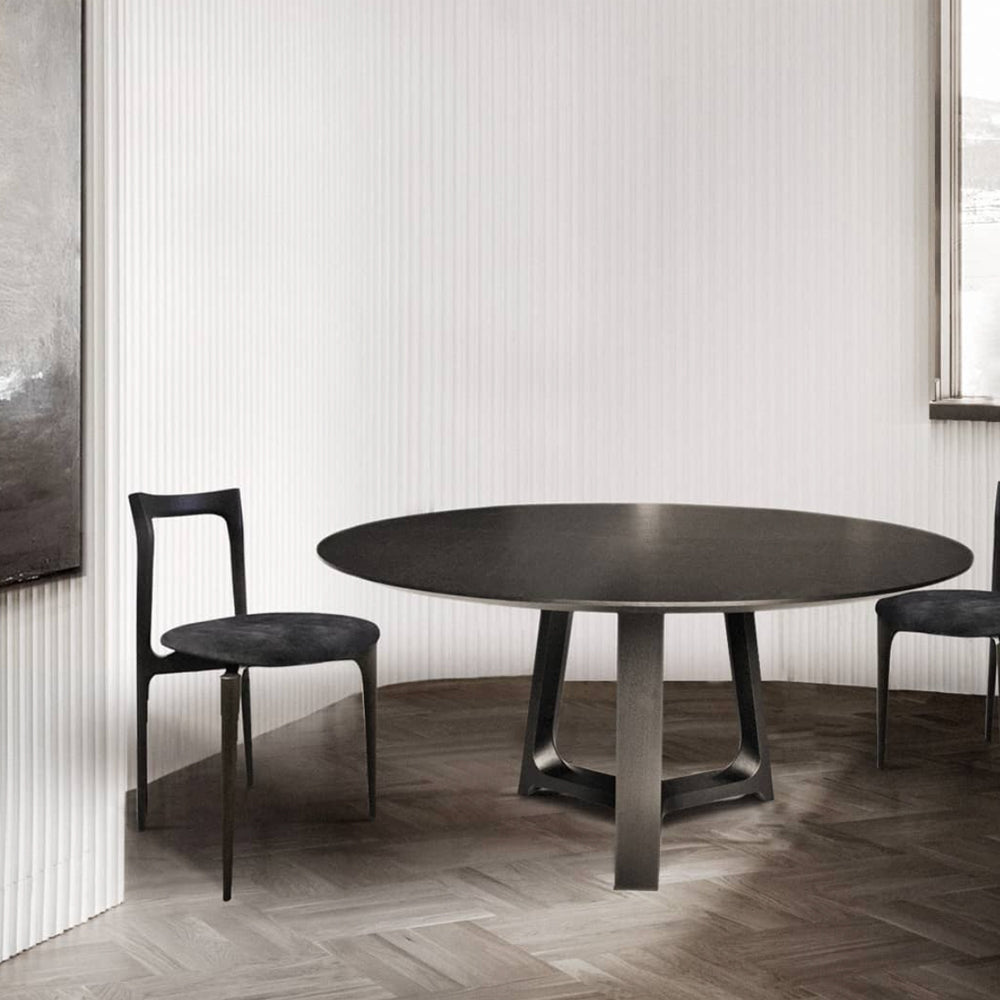 The Jasper Dining Table is a sculptural and versatile table: its table top sits on a simple but perfectly constructed wooden base, the three legs are joined to form a single base, emphasising the solid wood veins that can be natural or stained. This simple structure gives the table a sculptural, monumental quality, allowing it to integrate harmoniously into any contemporary design scheme.