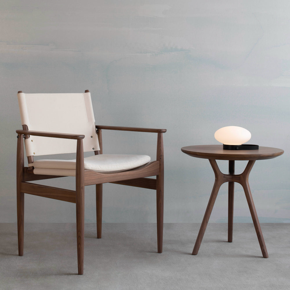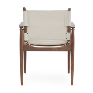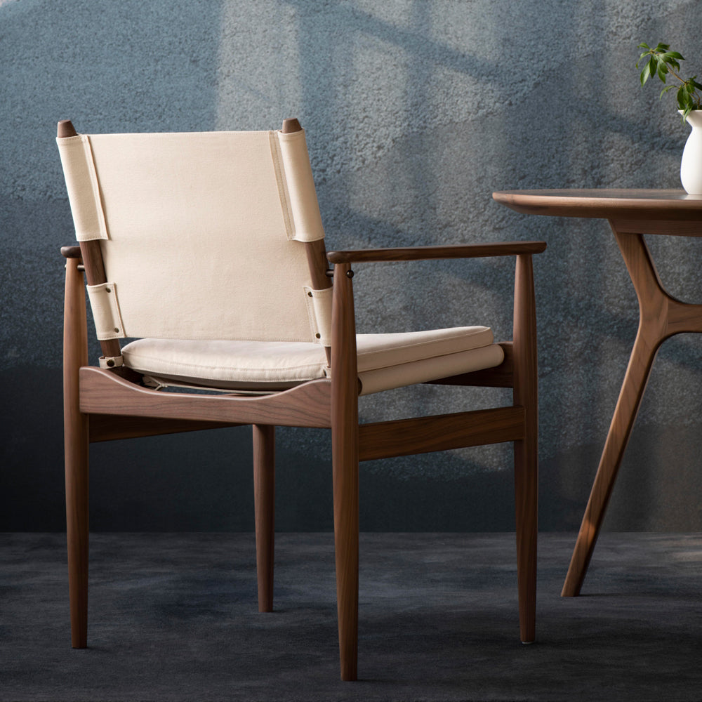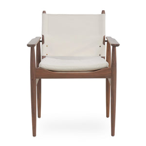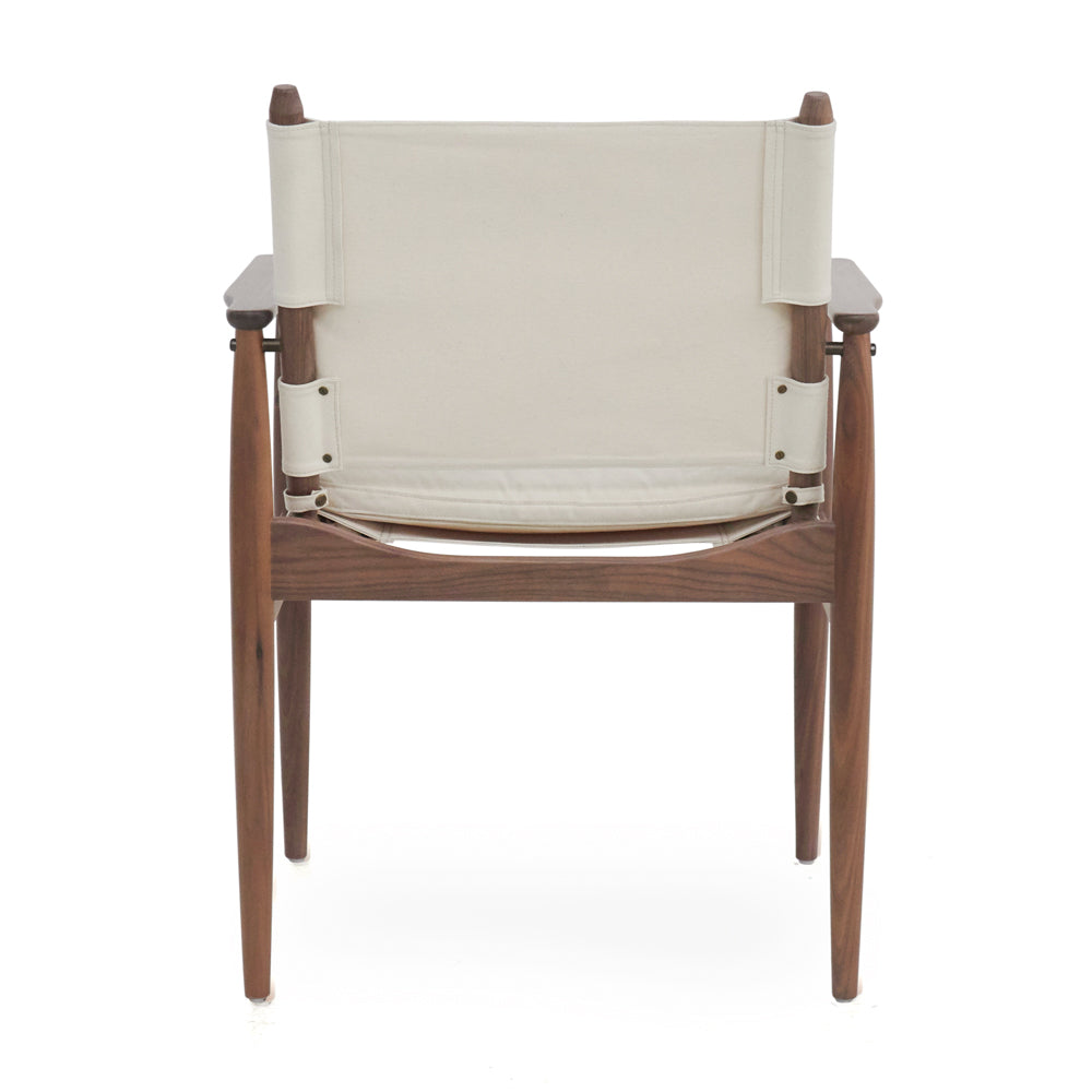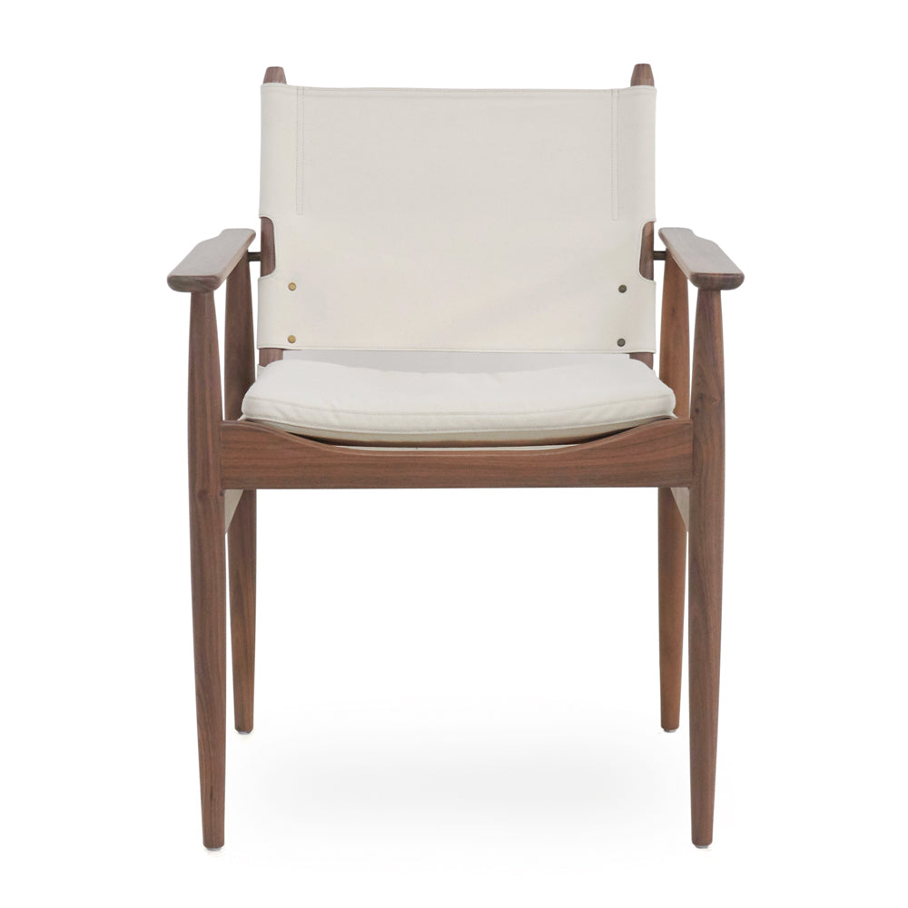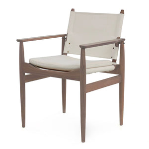 The Journey Dining Armchair - CV is inspired by the famous Safari chair in its almost naïve, steady and simple geometric structure - with added hard and soft components in order to enhance softness and comfort. The soft arch under the seat cushion complements the strong, masculine silhouette of the armchair and enhances its light and sophisticated look. The thick seat cushion and the soft back both offer a great and comfortable seating experience. The sophisticated details of the Journey - in darkened brass - celebrate the simplicity of how this armchair is assembled. This version of the chair is upholstered in fabric.