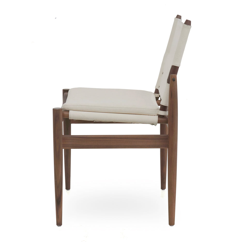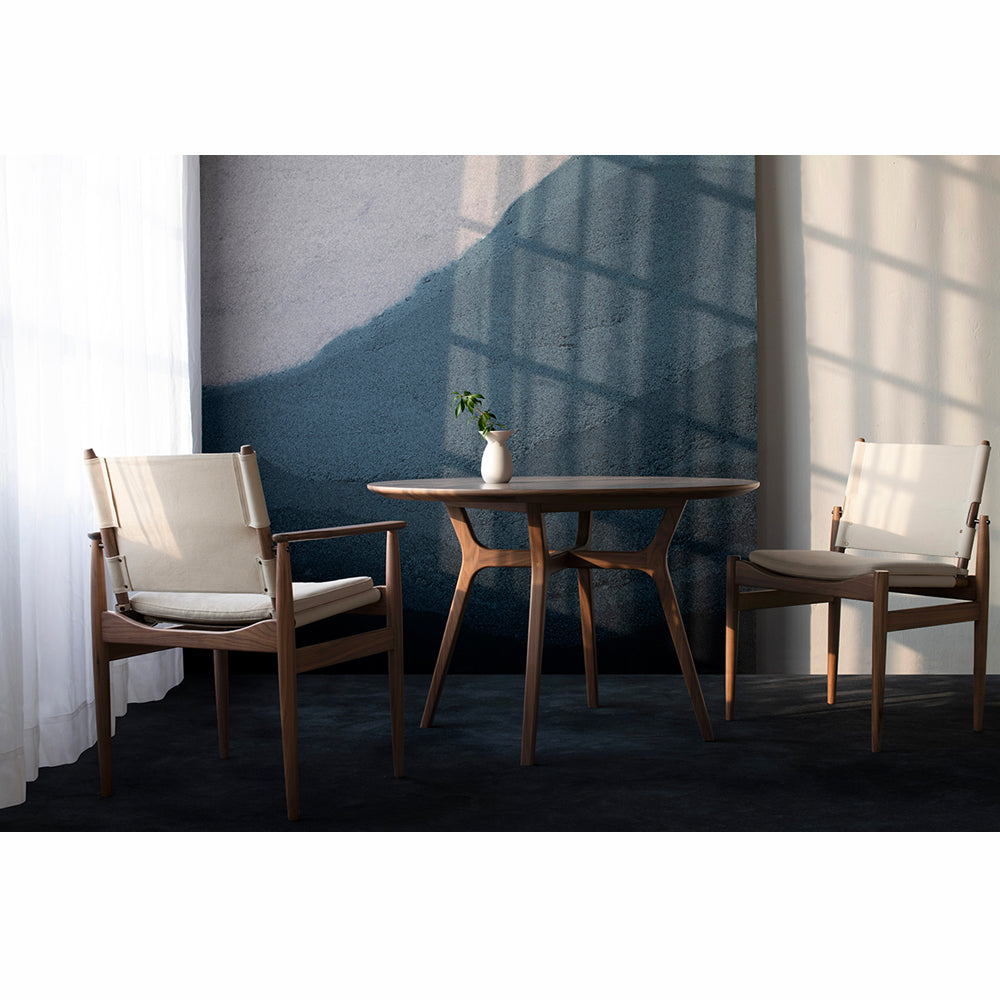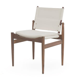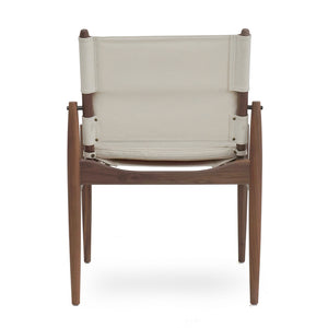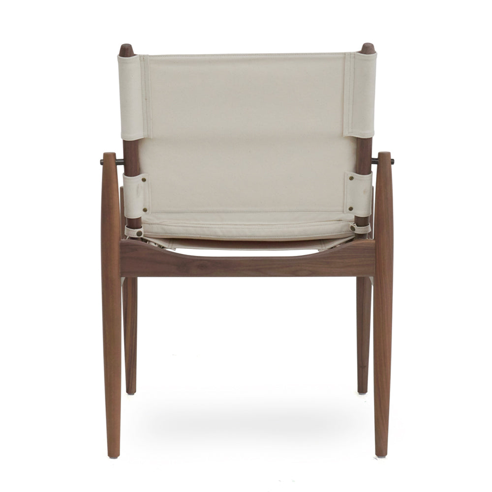 The Journey Dining Chair - CV is inspired by the famous Safari chair in its almost naïve, steady and simple geometric structure - with added hard and soft components in order to enhance softness and comfort. The soft arch under the seat cushion complements the strong, masculine silhouette of the armchair and enhances its light and sophisticated look. The thick seat cushion and the soft back both offer a great and comfortable seating experience. The sophisticated details of the Journey - in darkened brass - celebrate the simplicity of how this armchair is assembled. This version of the chair is upholstered in fabric.