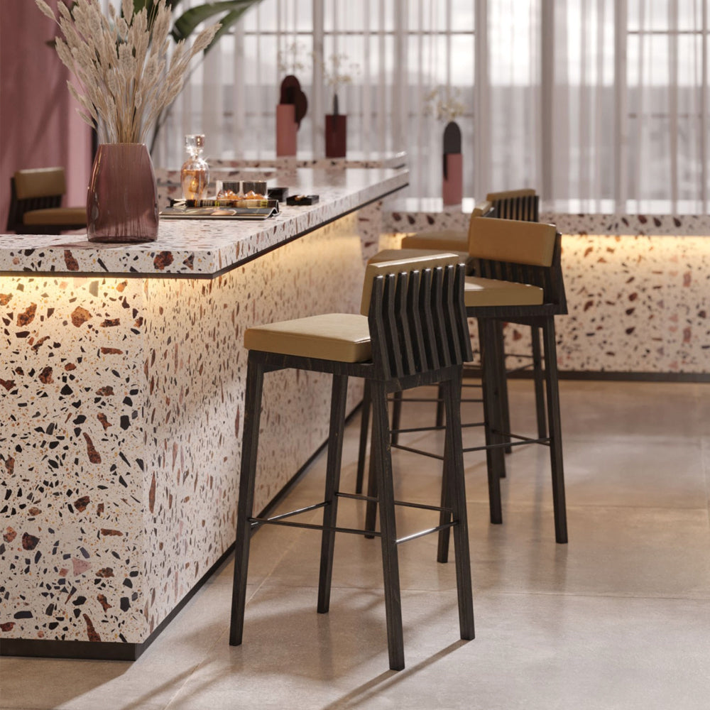 The Lykke Bar Chair is a stylish and distinctive bar stool. The word "lykke" means happiness in Danish, a sentiment reflected in the design of the bar stool, which combines sleek minimalist lines inspired by Nordic design with a flash of Portuguese design flair.