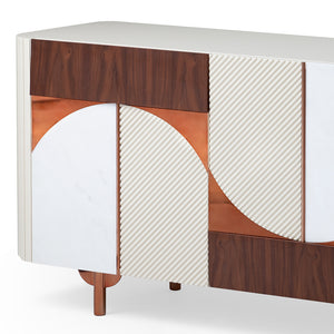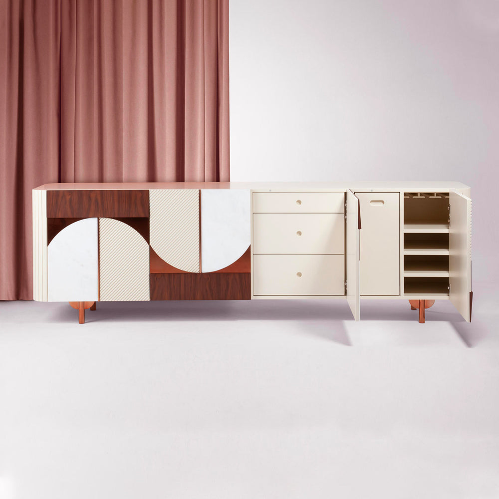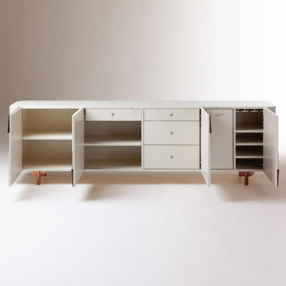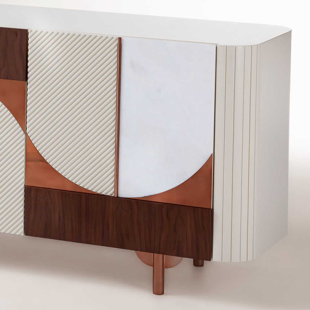 - First image: structure: ivory lacquered MDF; doors: marble Estremoz white matte finish; wood reliefs: natural walnut veneer; metal applications: stainless steel plate in polished copper finish; feet: stainless steel plate in polished copper finish